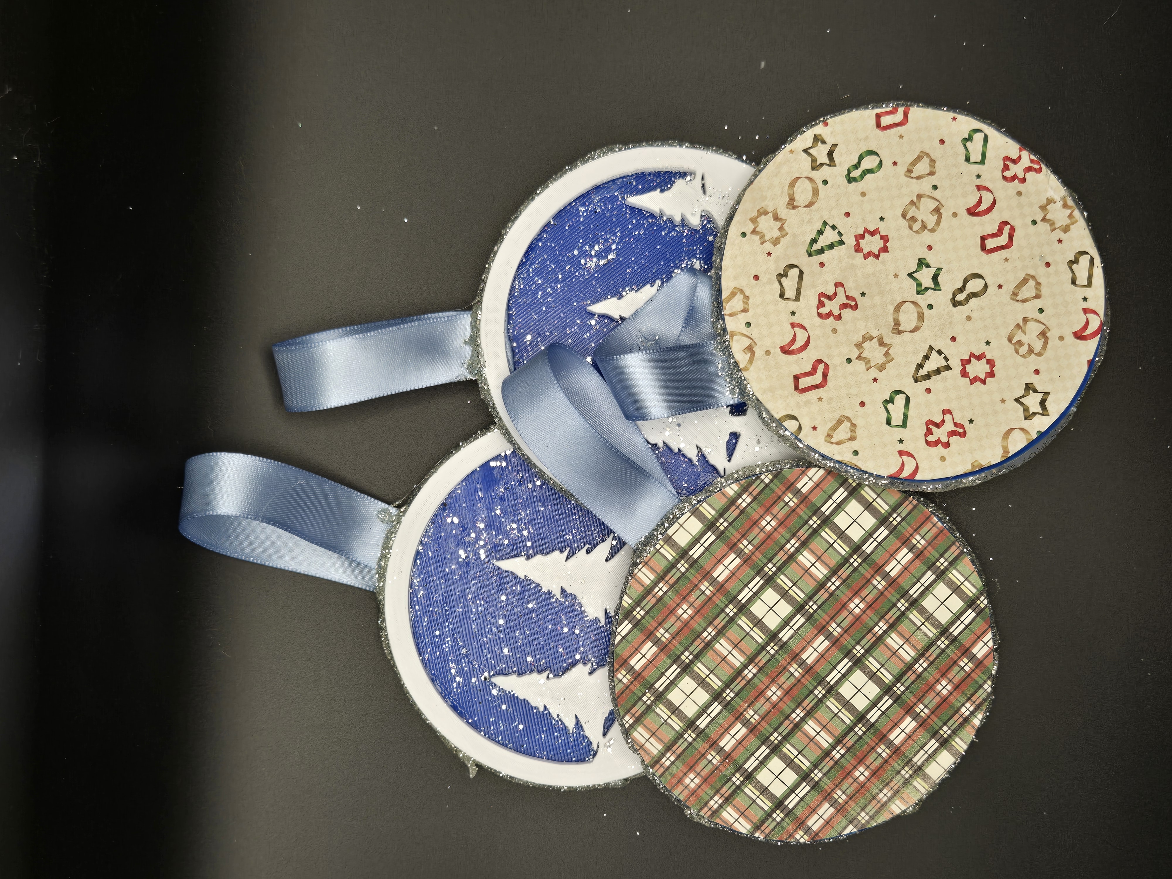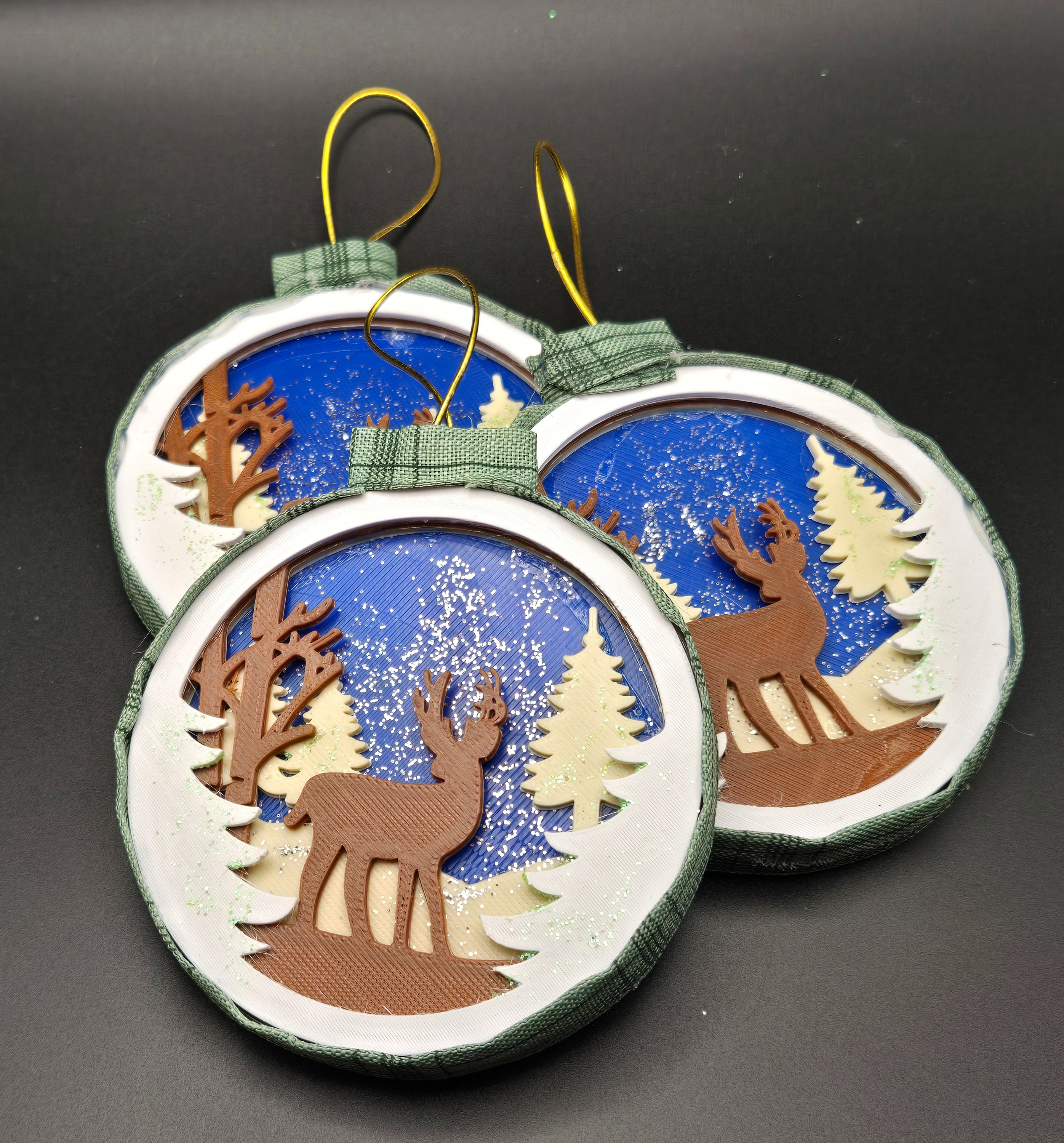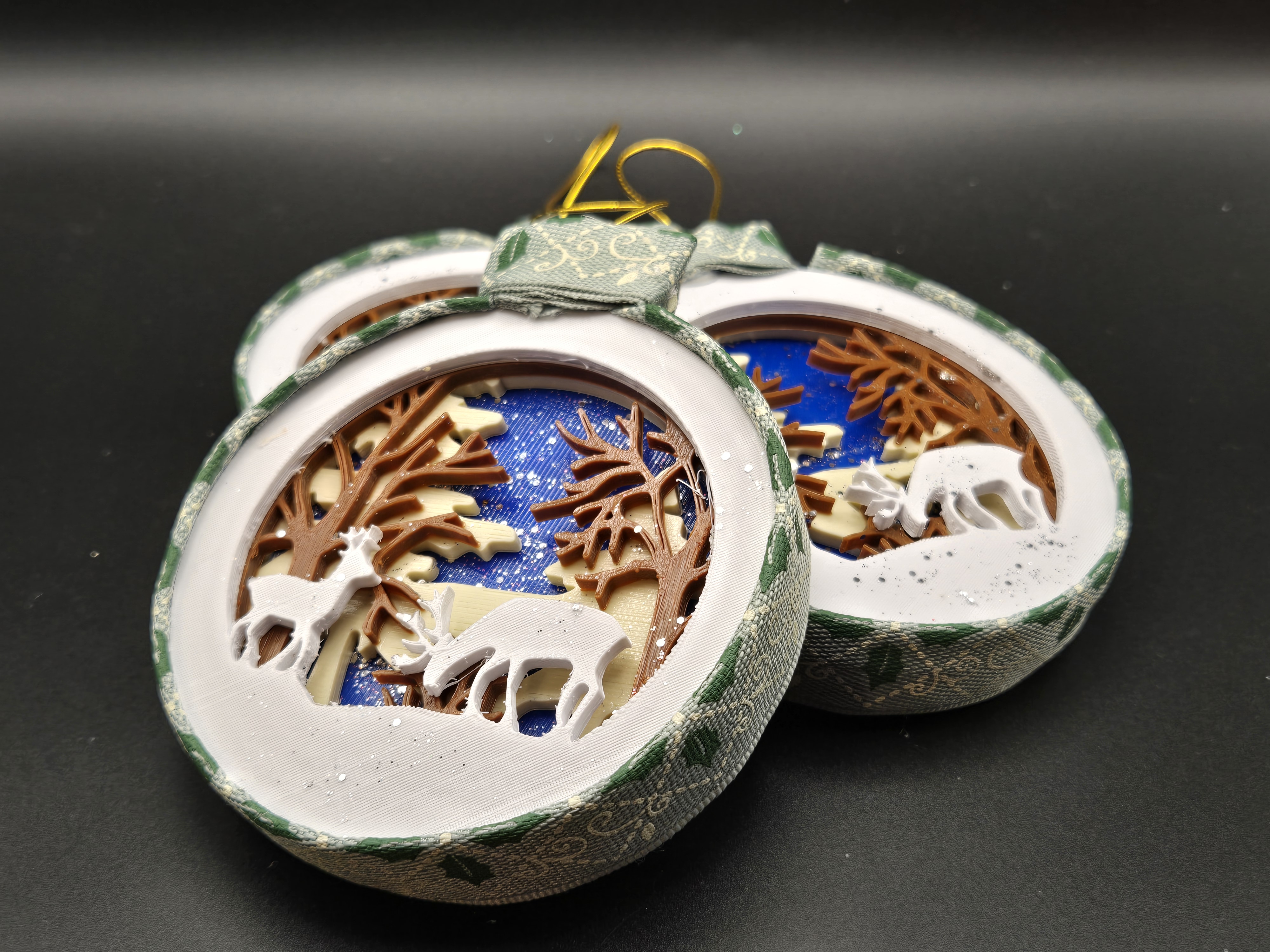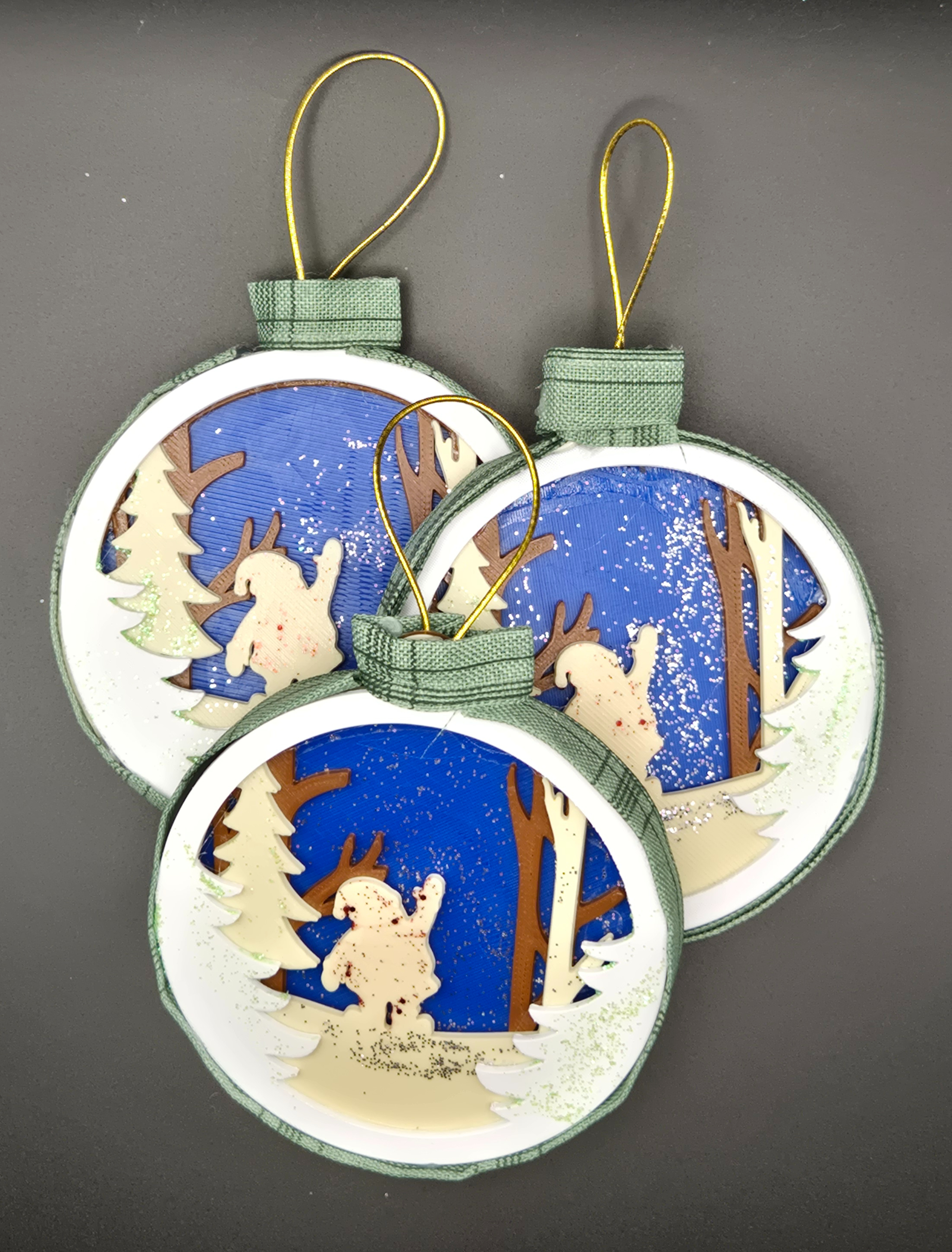3D printed ornaments from the Baron's Forge and put together to create depth within the ornament. Dressed up by the Baroness with glitter paint, card stock and ribbon.