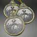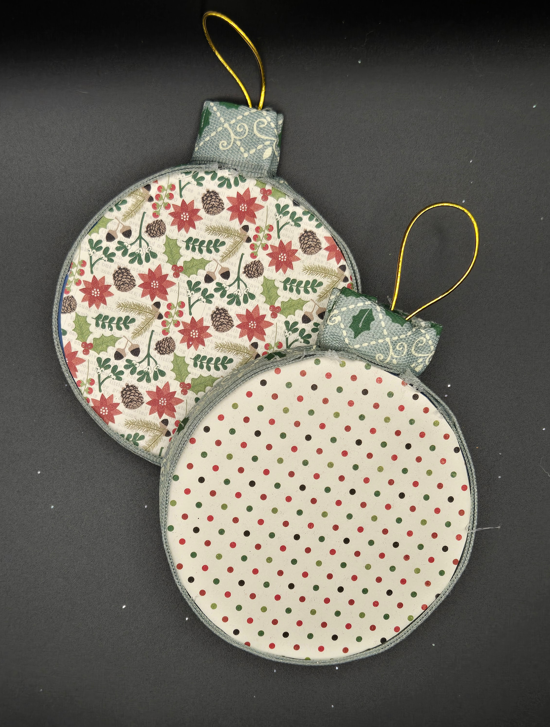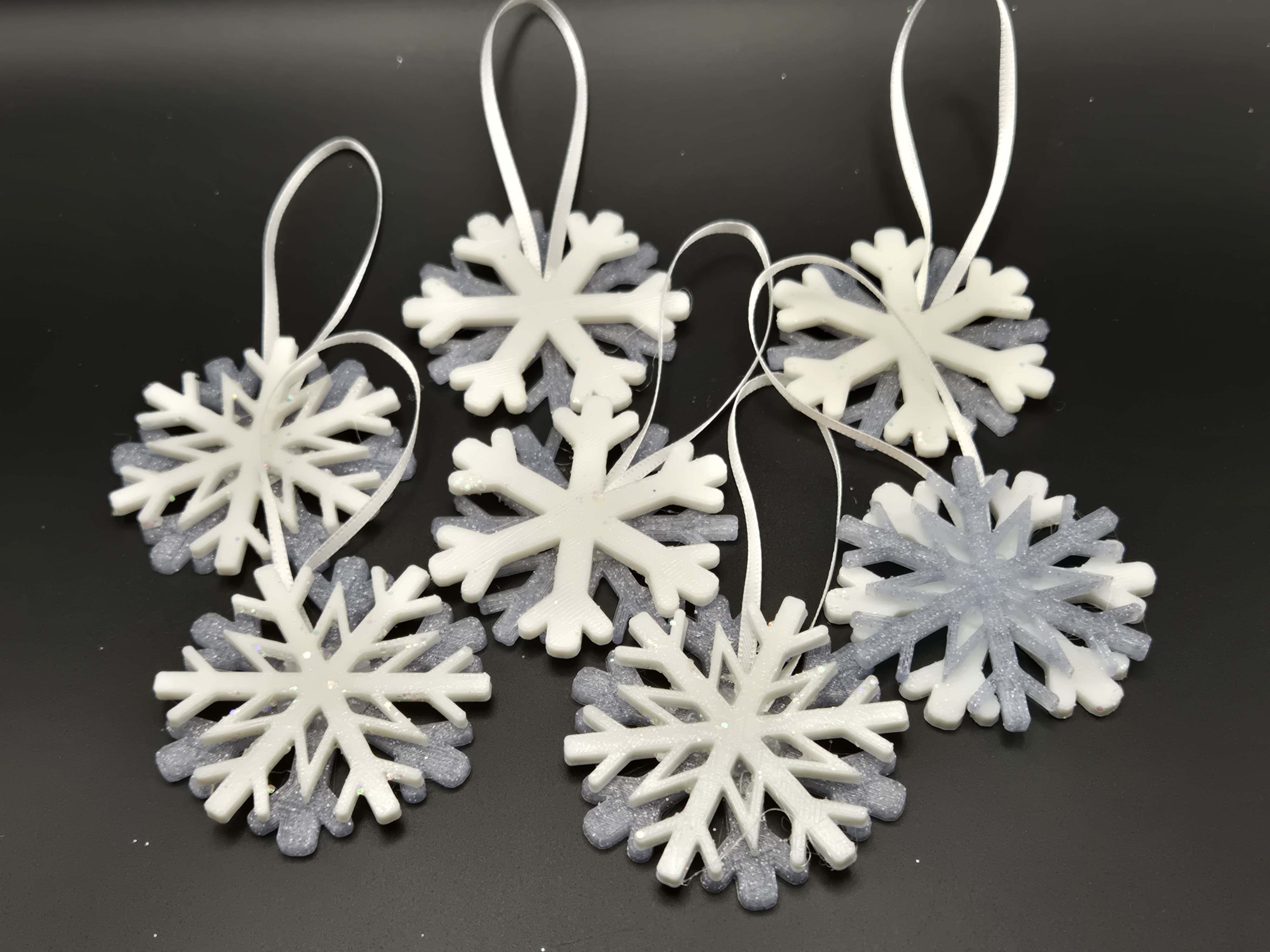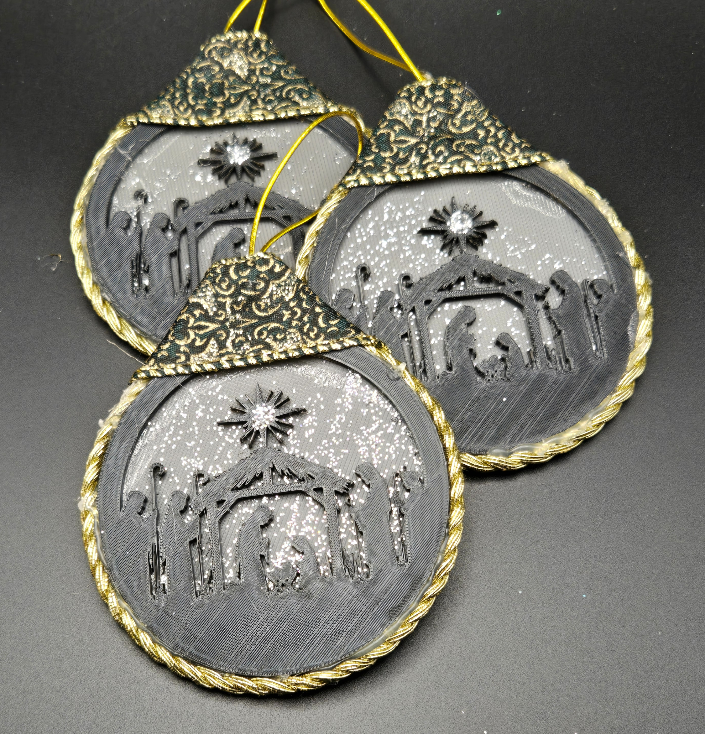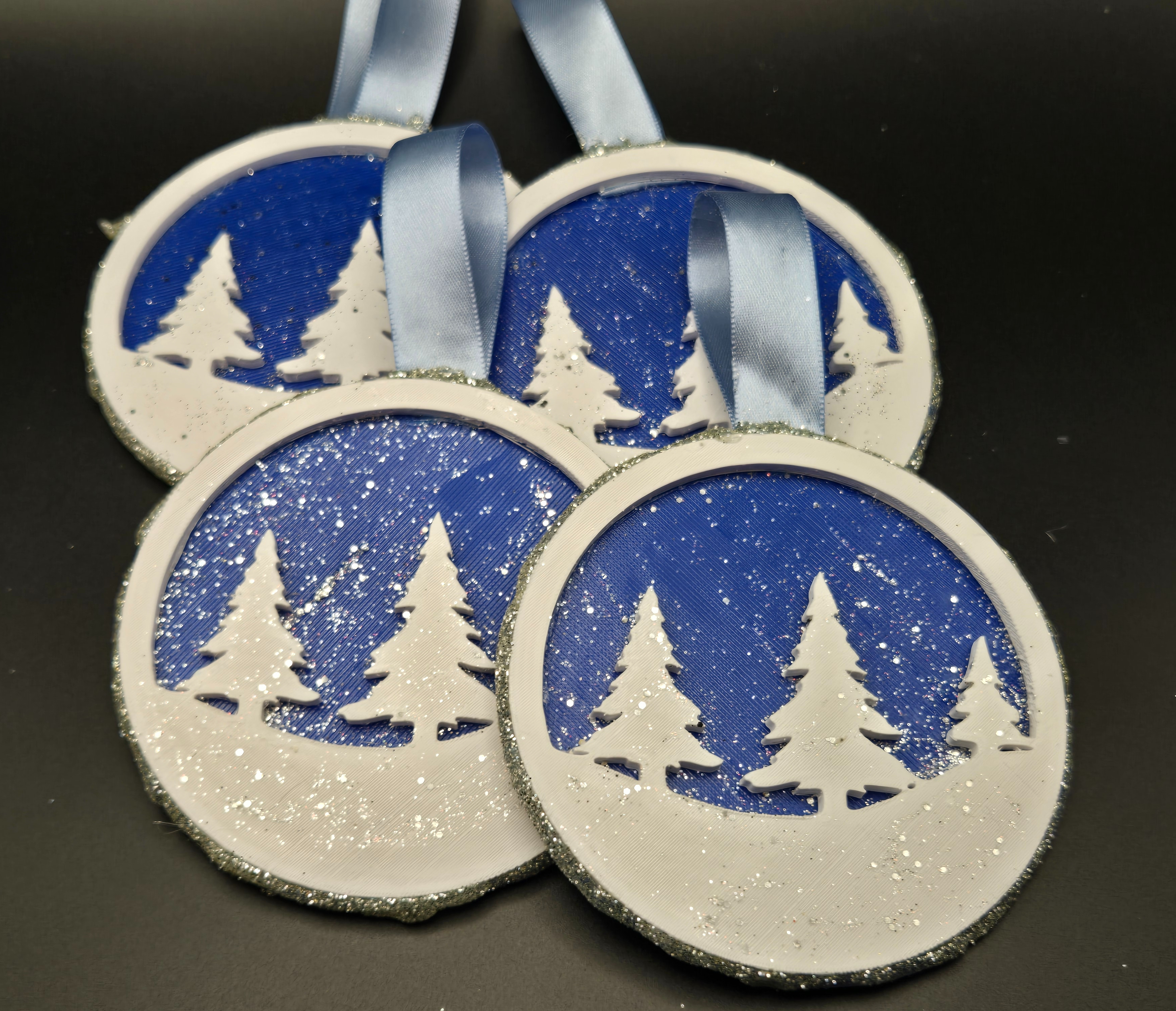 3D printed ornaments from the Baron's Forge and put together to create depth within the ornament. Dressed up by the Baroness with glitter paint, card stock and ribbon.