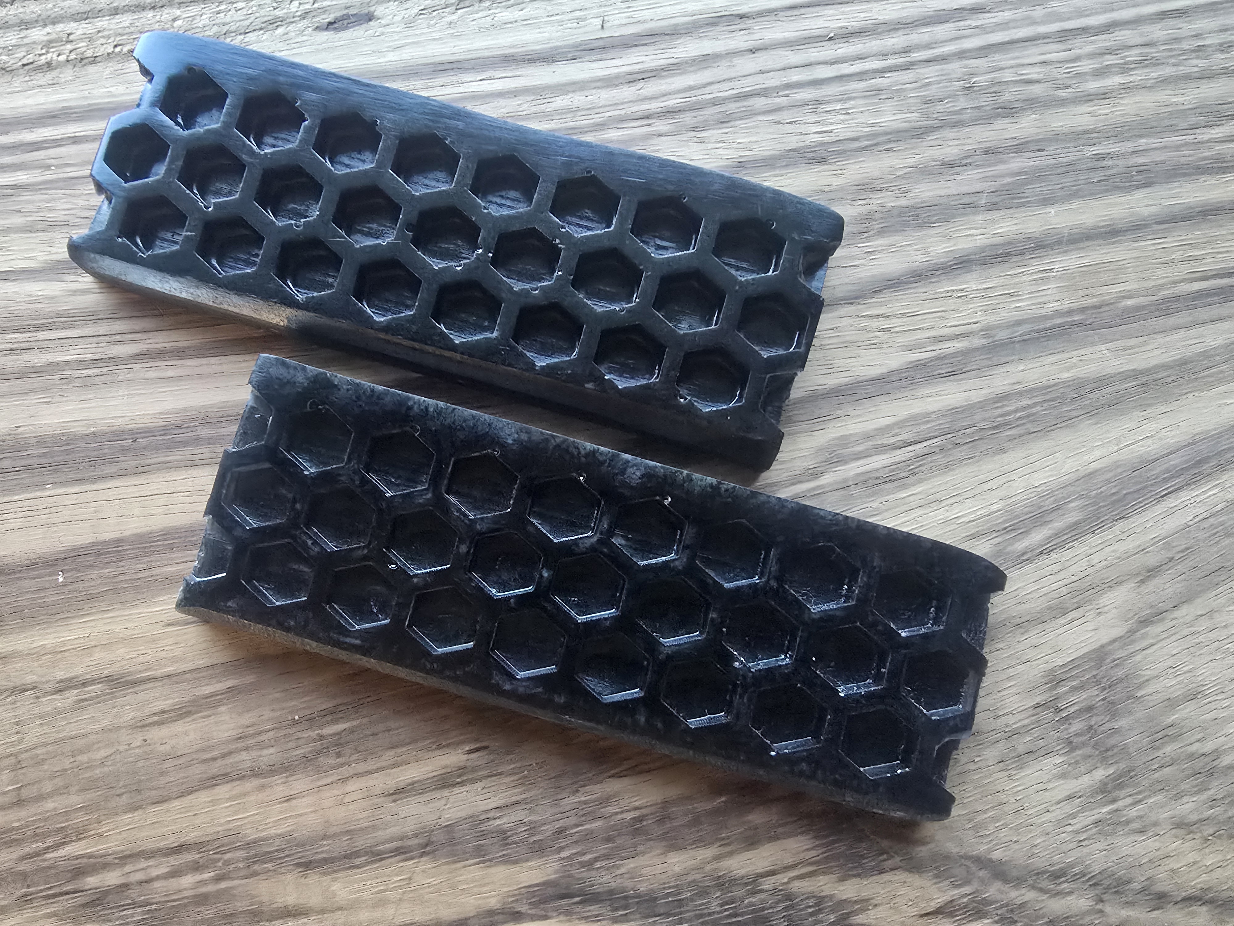 Resin knife scales made from a silicone mold made from a 3D printed pattern.