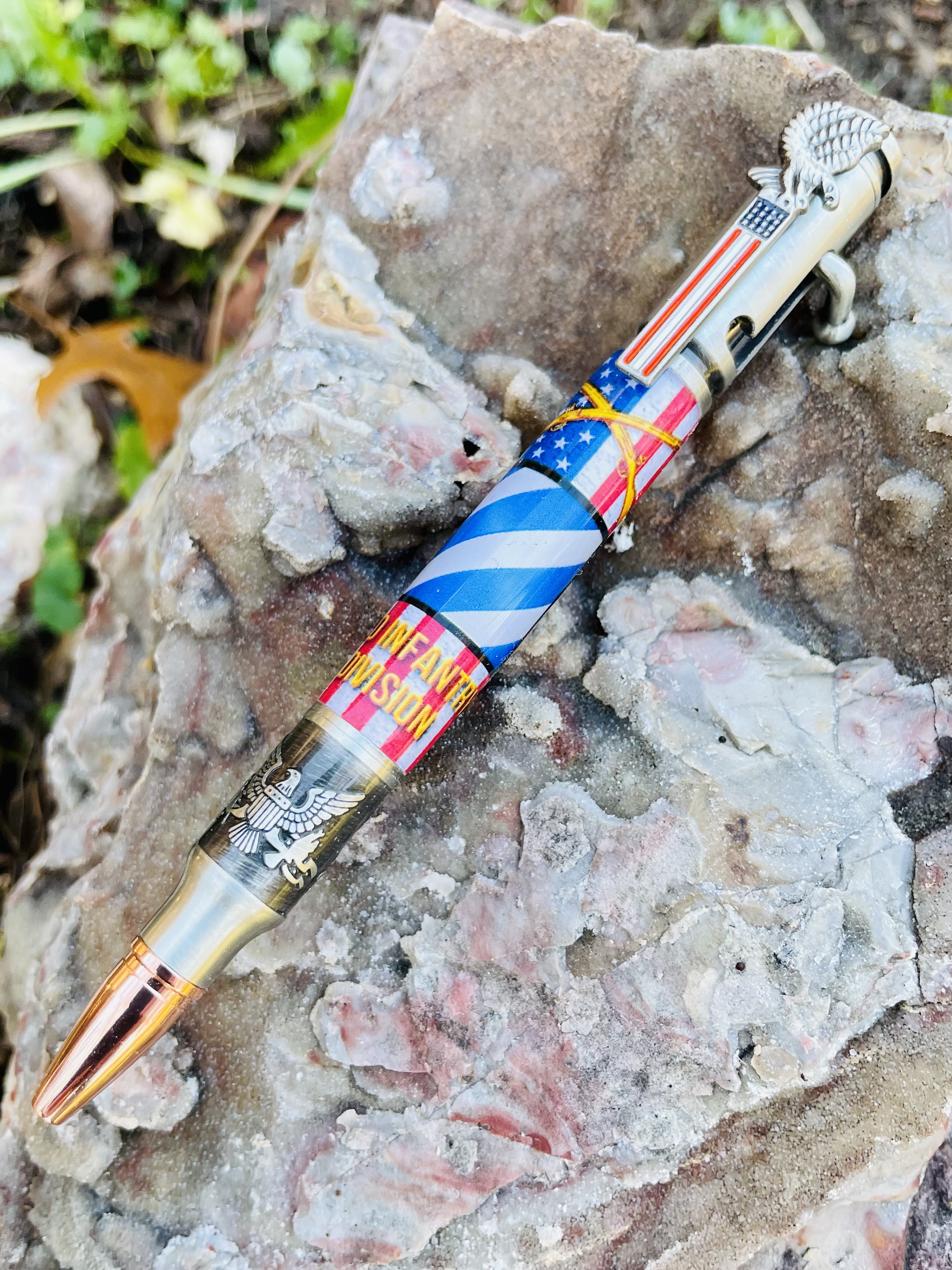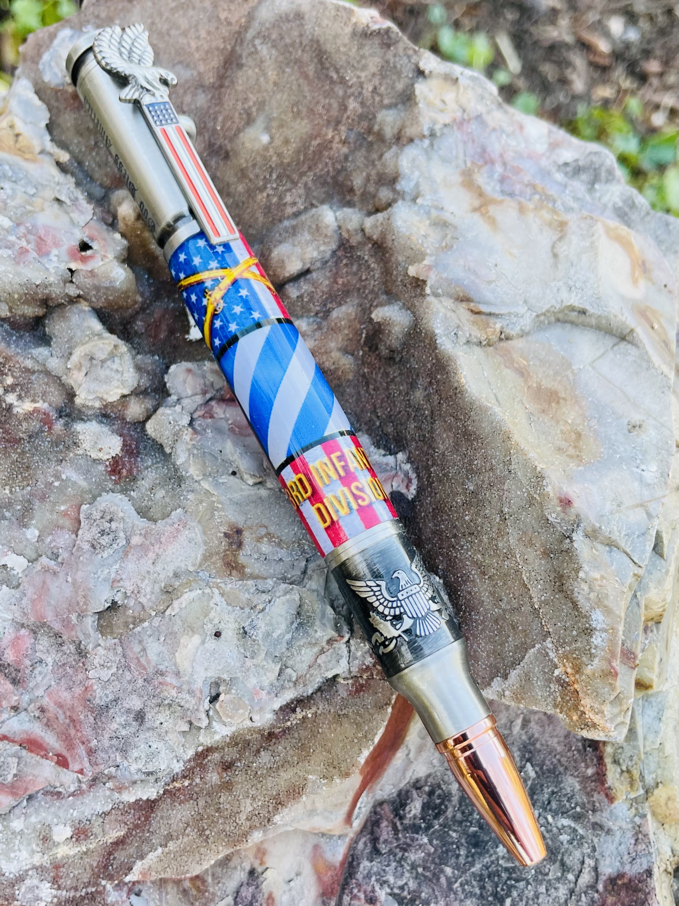 This bolt-action pewter finish pen is hand-turned and polished with a custom designed resin cast center barrel. Great for PCS, ETS, Impact Award, or Retirement Memento.