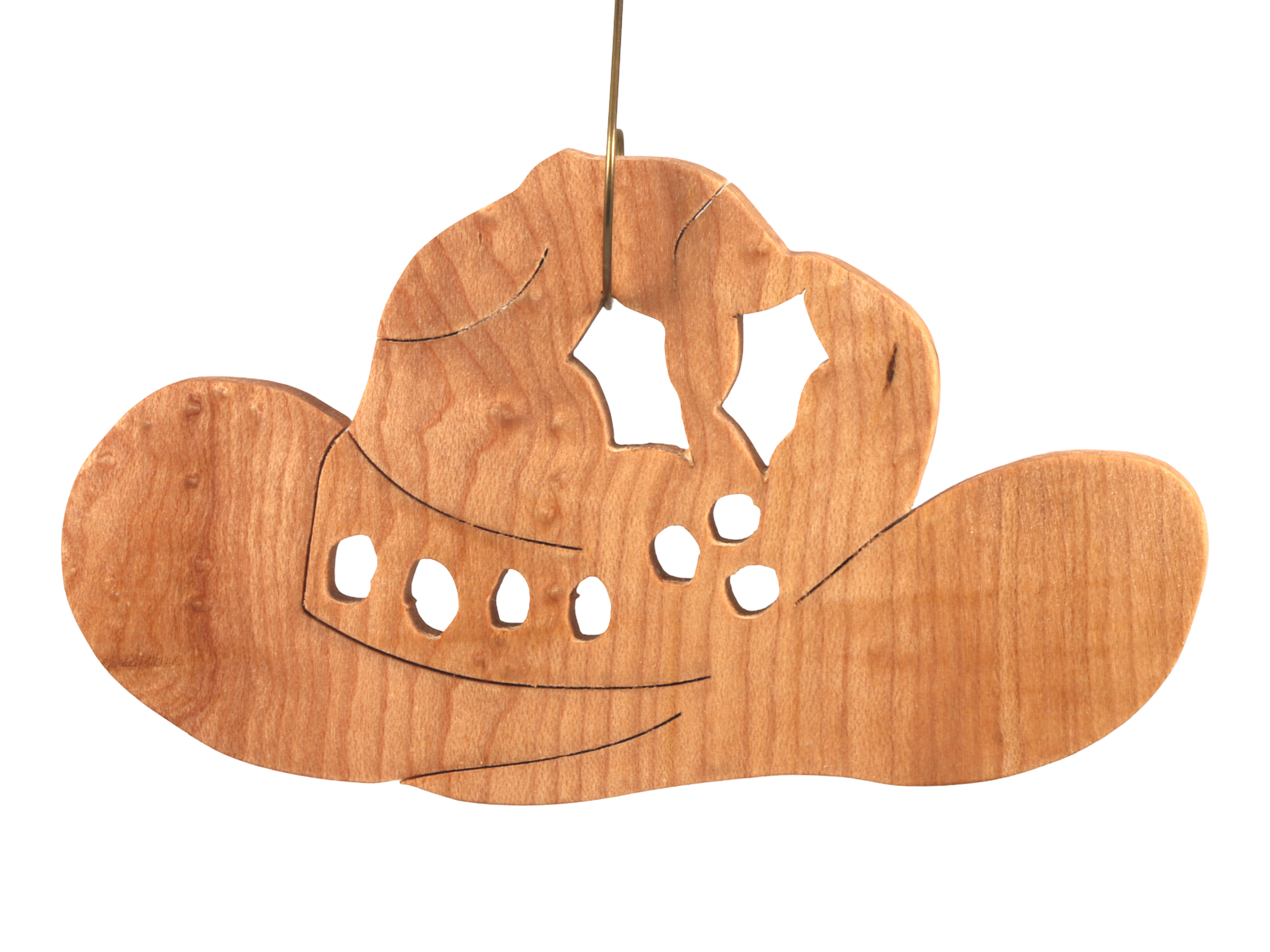 Add a rustic Western flair to your holiday decor with this charming handmade wooden Christmas tree ornament! Crafted from premium cherry wood, this piece is hand-cut into the shape of a classic cowboy hat, complete with an intricately detailed sprig of holly tucked into the hat band. The holly design features stylized leaf cutouts on the crown and berry accents, creating a whimsical fusion of cowboy style and festive cheer.