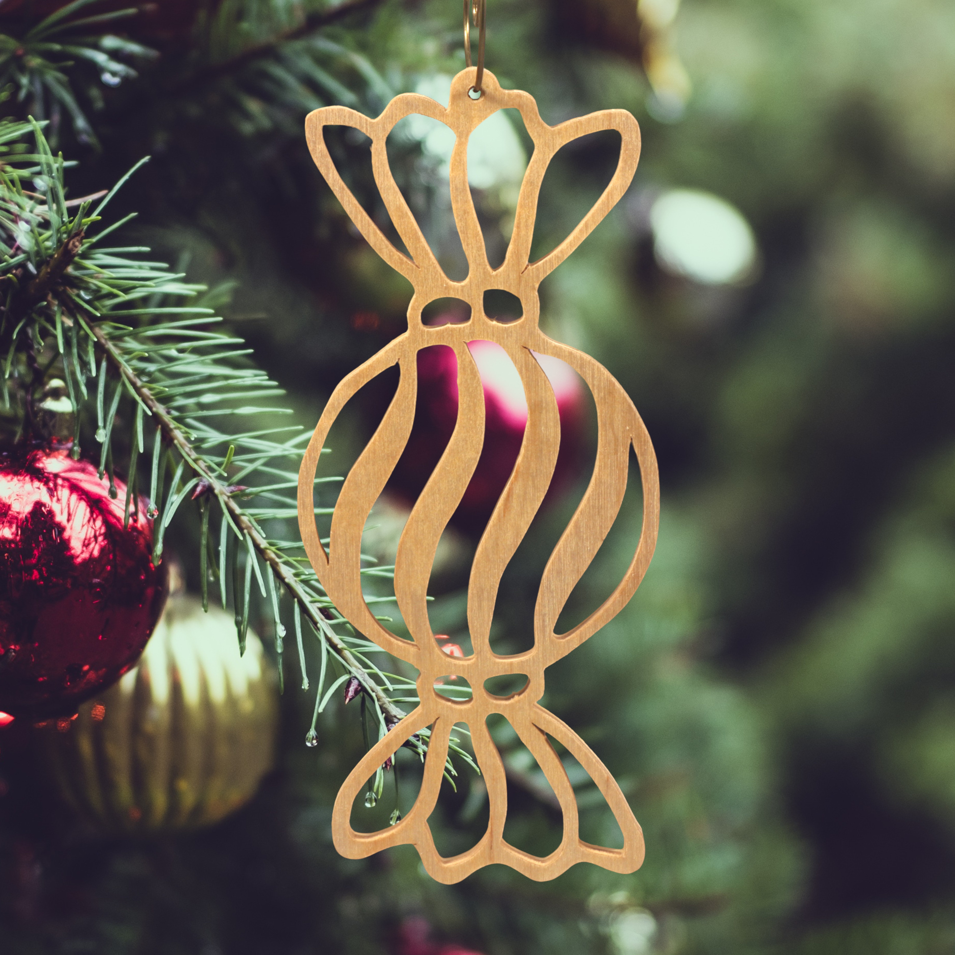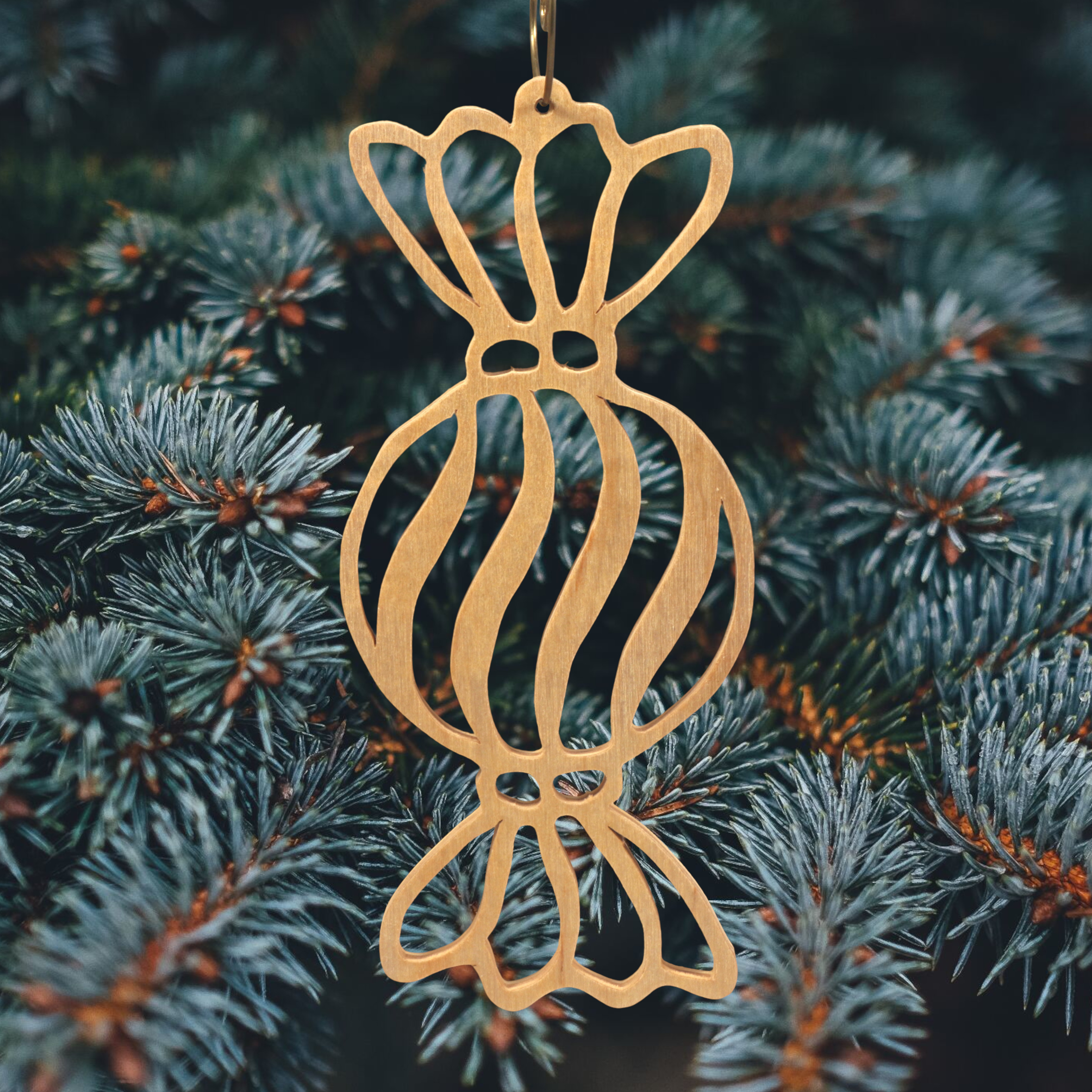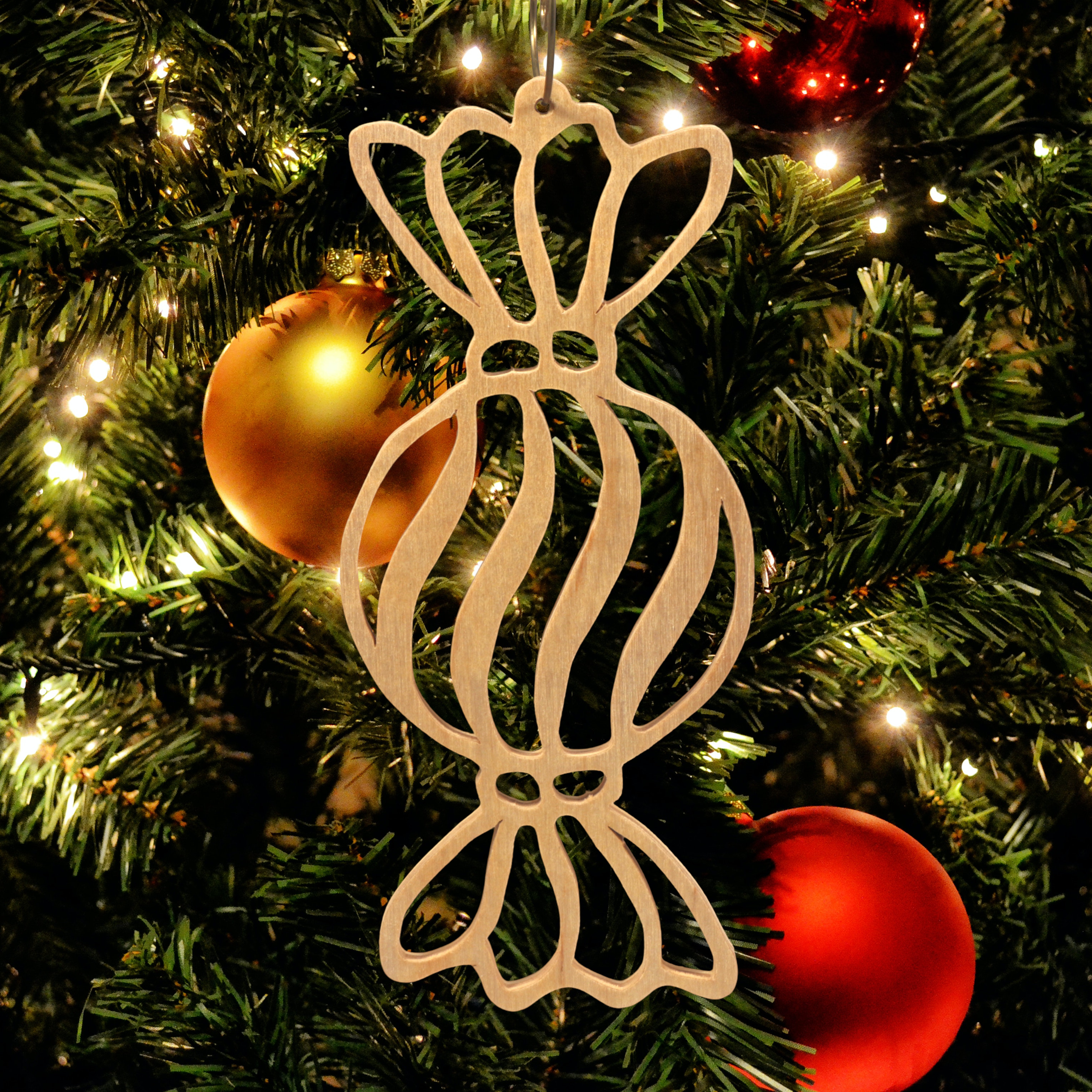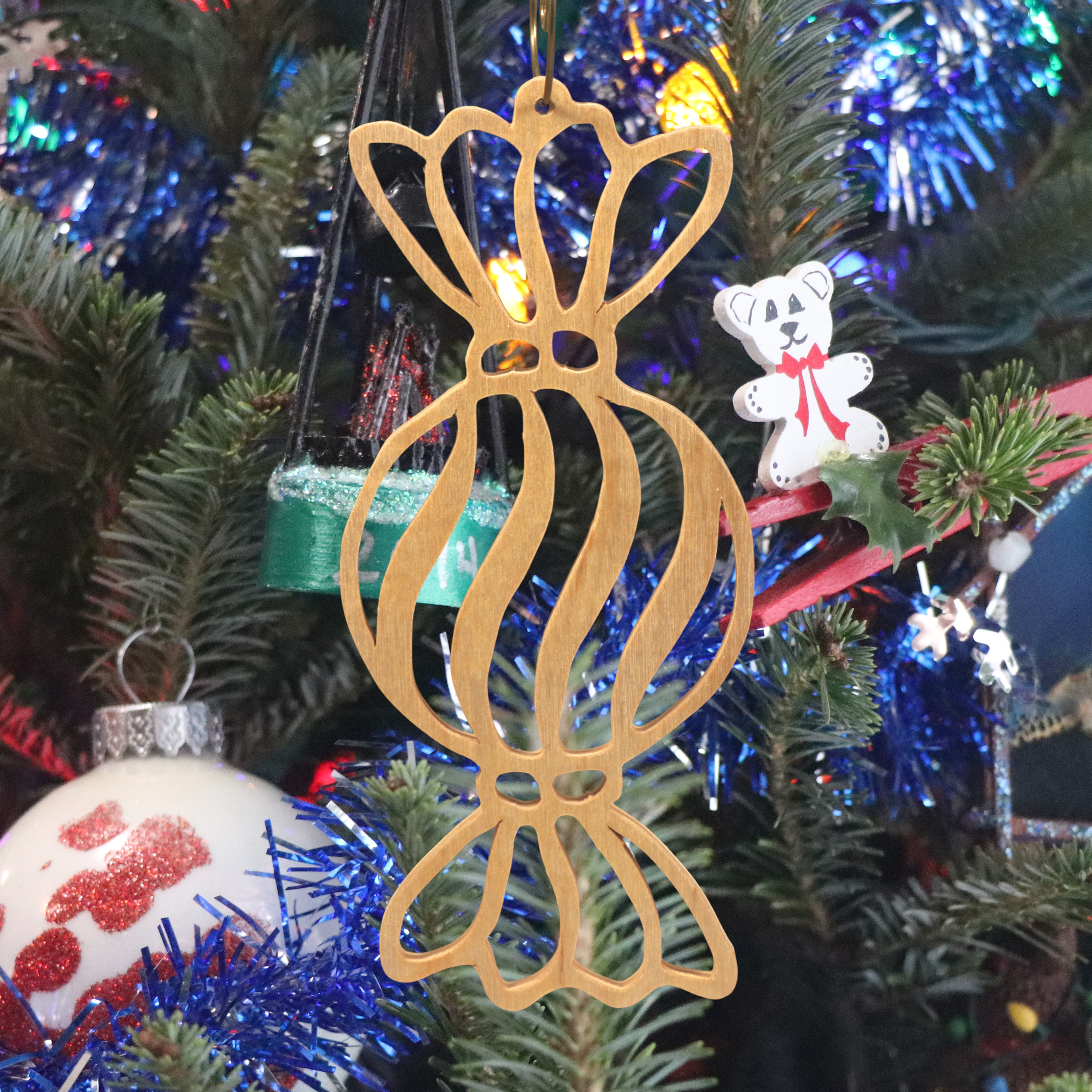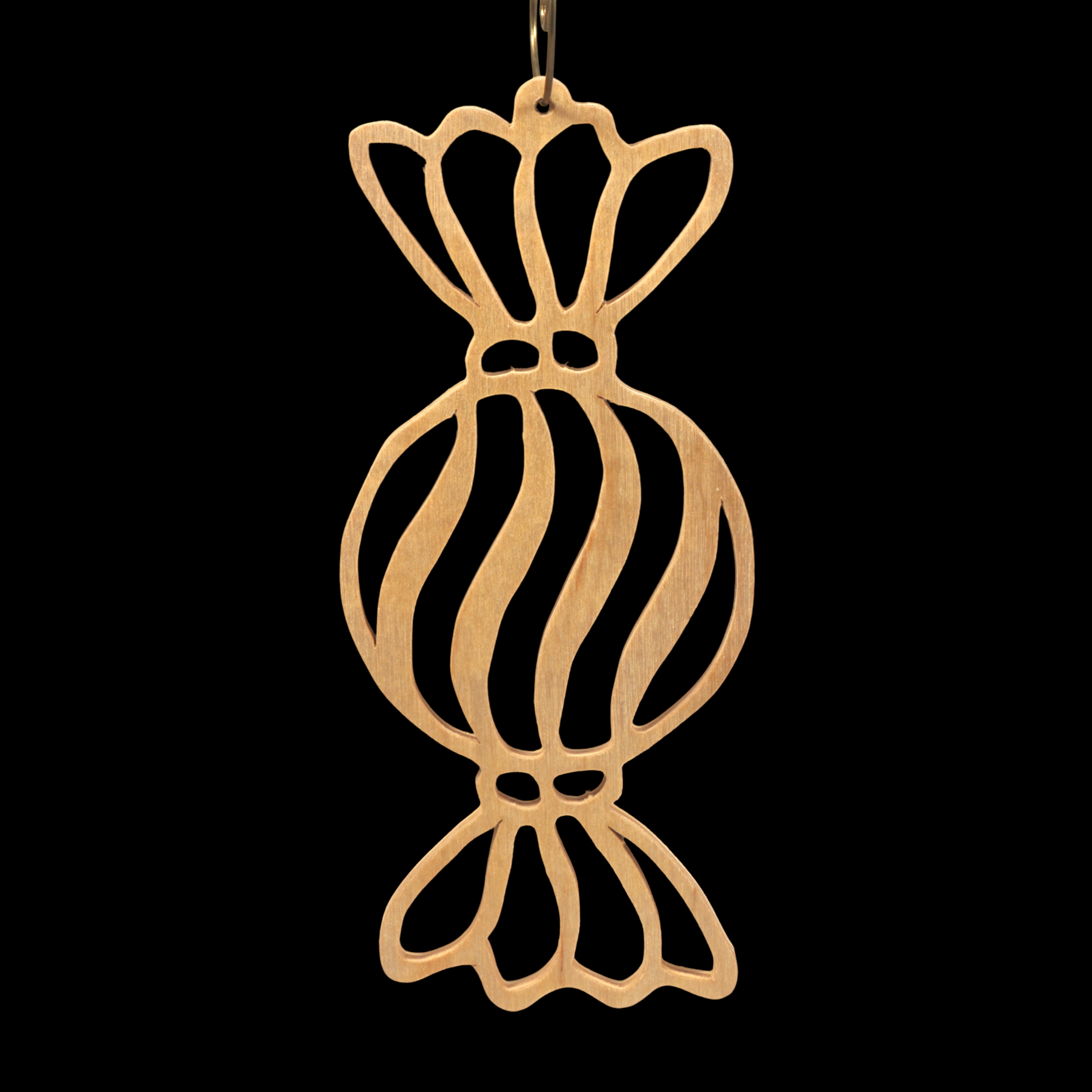 Add a touch of whimsical sweetness to your holiday decor with this handmade wooden Christmas tree ornament, crafted in my woodworking shop using a scroll saw and hand finished with clear shellac. Shaped like a classic wrapped hard candy, it features a bulbous center adorned with swirling stripes reminiscent of peppermint twists, along with an intricately designed wrapper extending to both the top and bottom. Made from light-toned wood, this rustic ornament highlights the natural grain and precise cuts, giving it a unique charm. It’s perfect for decorating your tree or as a thoughtful gift for loved ones. Each ornament is handcrafted, ensuring that every piece has its own distinctive variations.