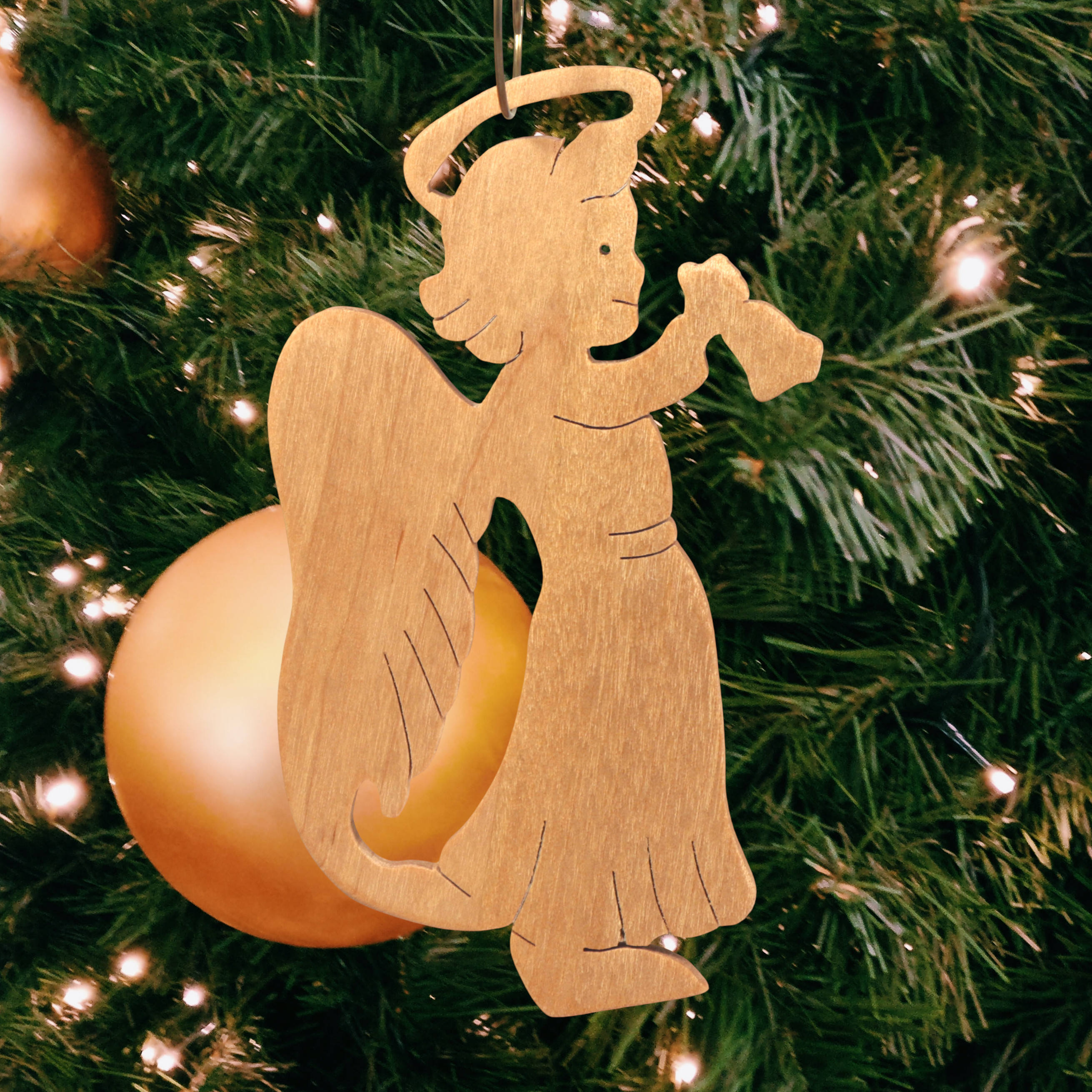 Add this wooden angel ornament to your holiday decor. Hand-cut from solid hardwood using my scroll saw, it features a cheerful angel with a halo, wings, and a raised arm ringing a bell. I finished it with clear shellac. It is perfect for traditional or farmhouse-style Christmas trees and is ideal as a thoughtful gift for loved ones, a stocking stuffer, or a special addition to your own ornament collection.