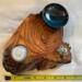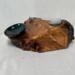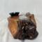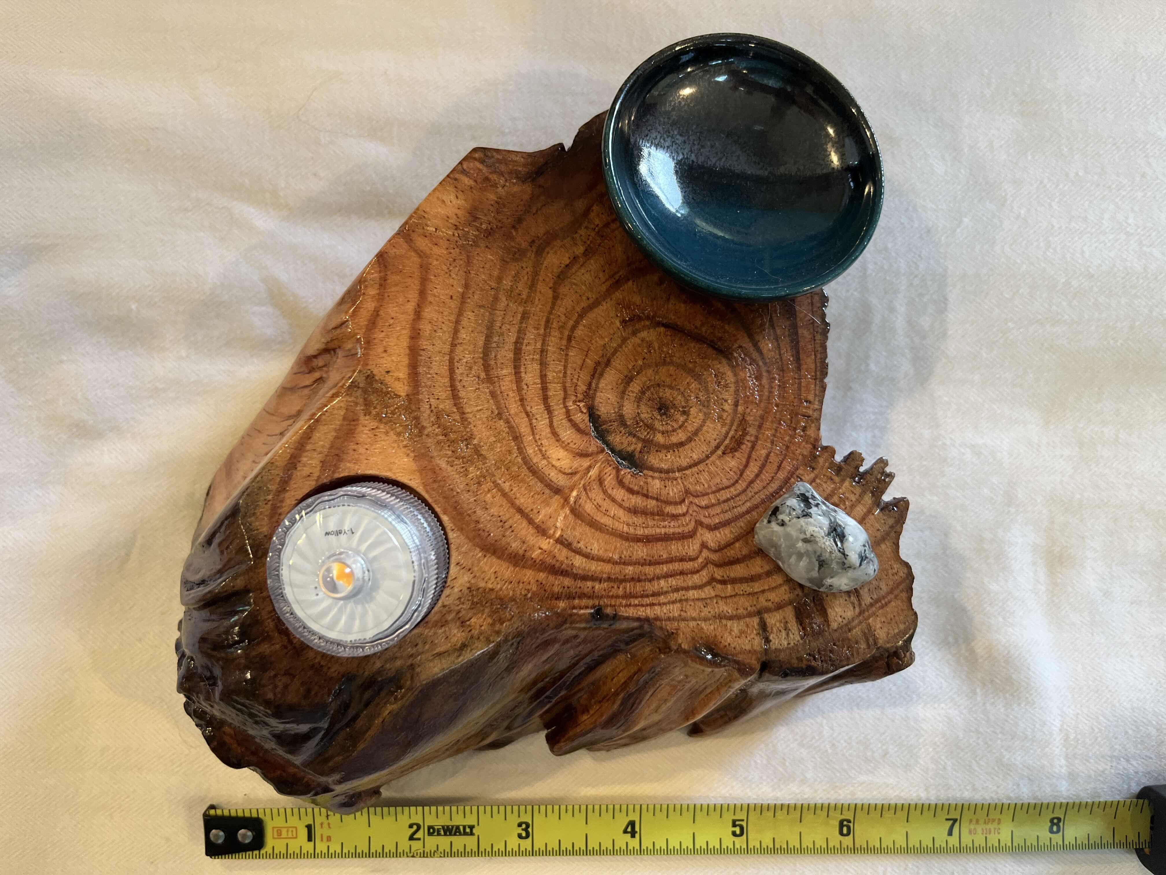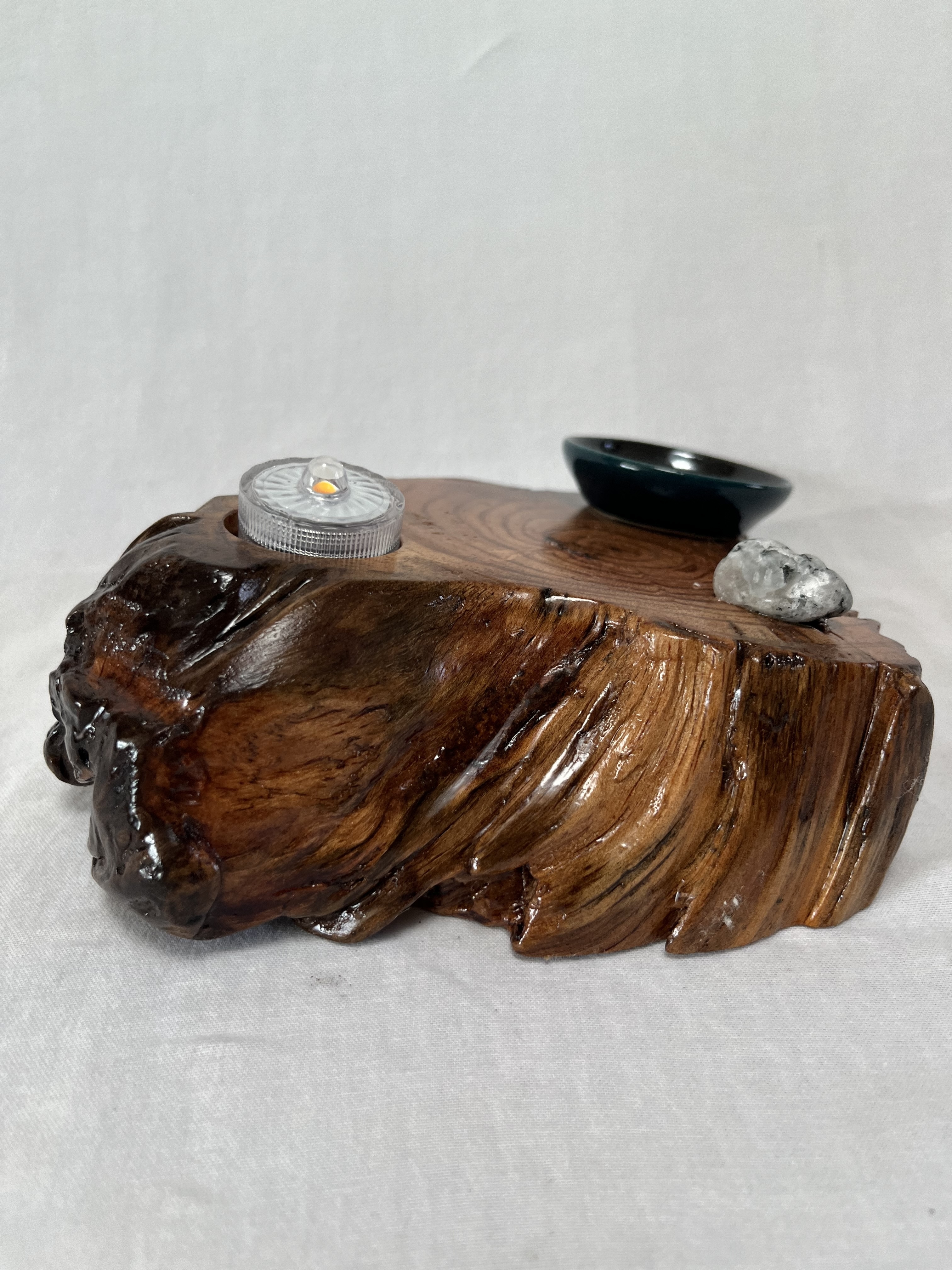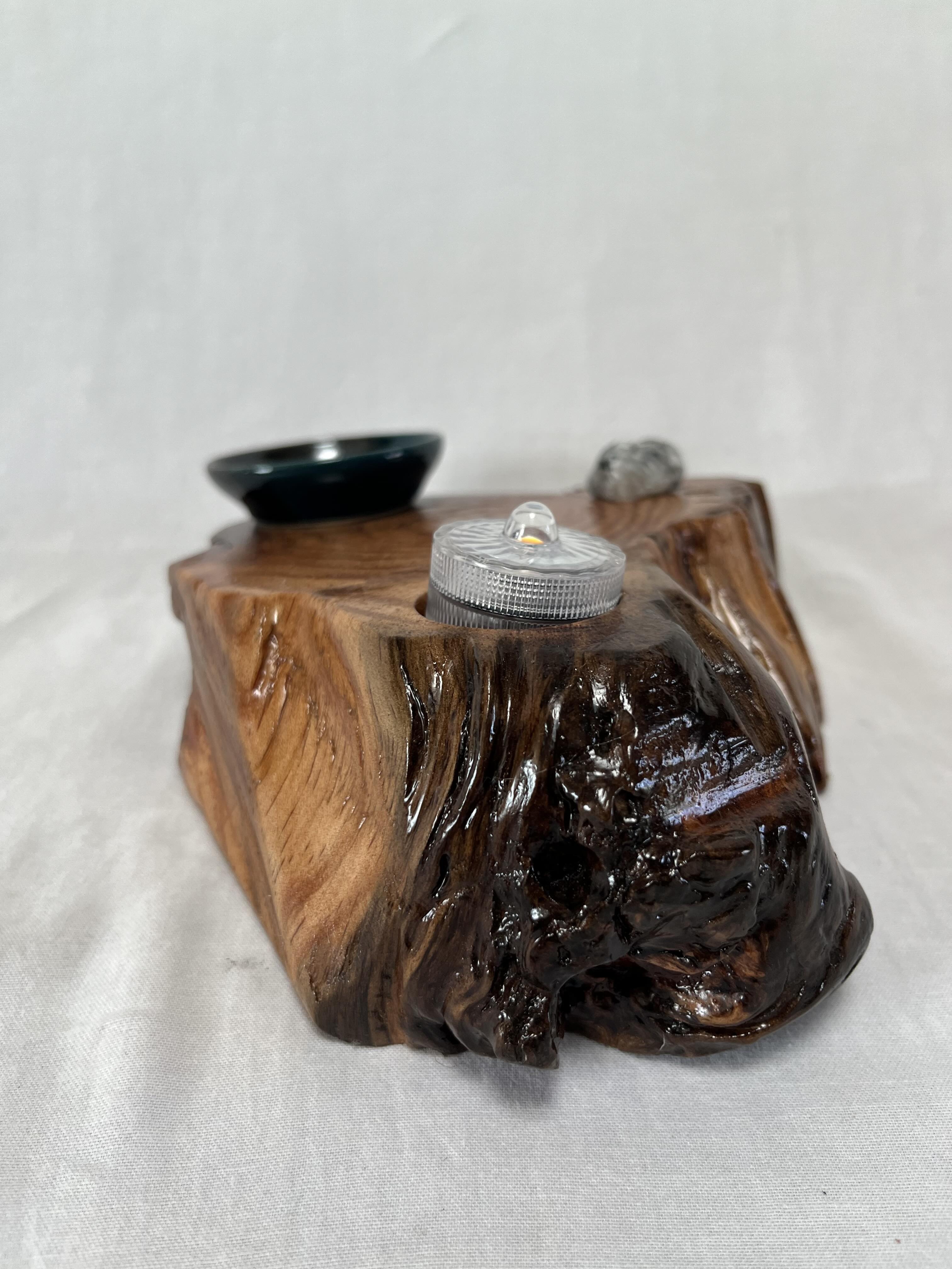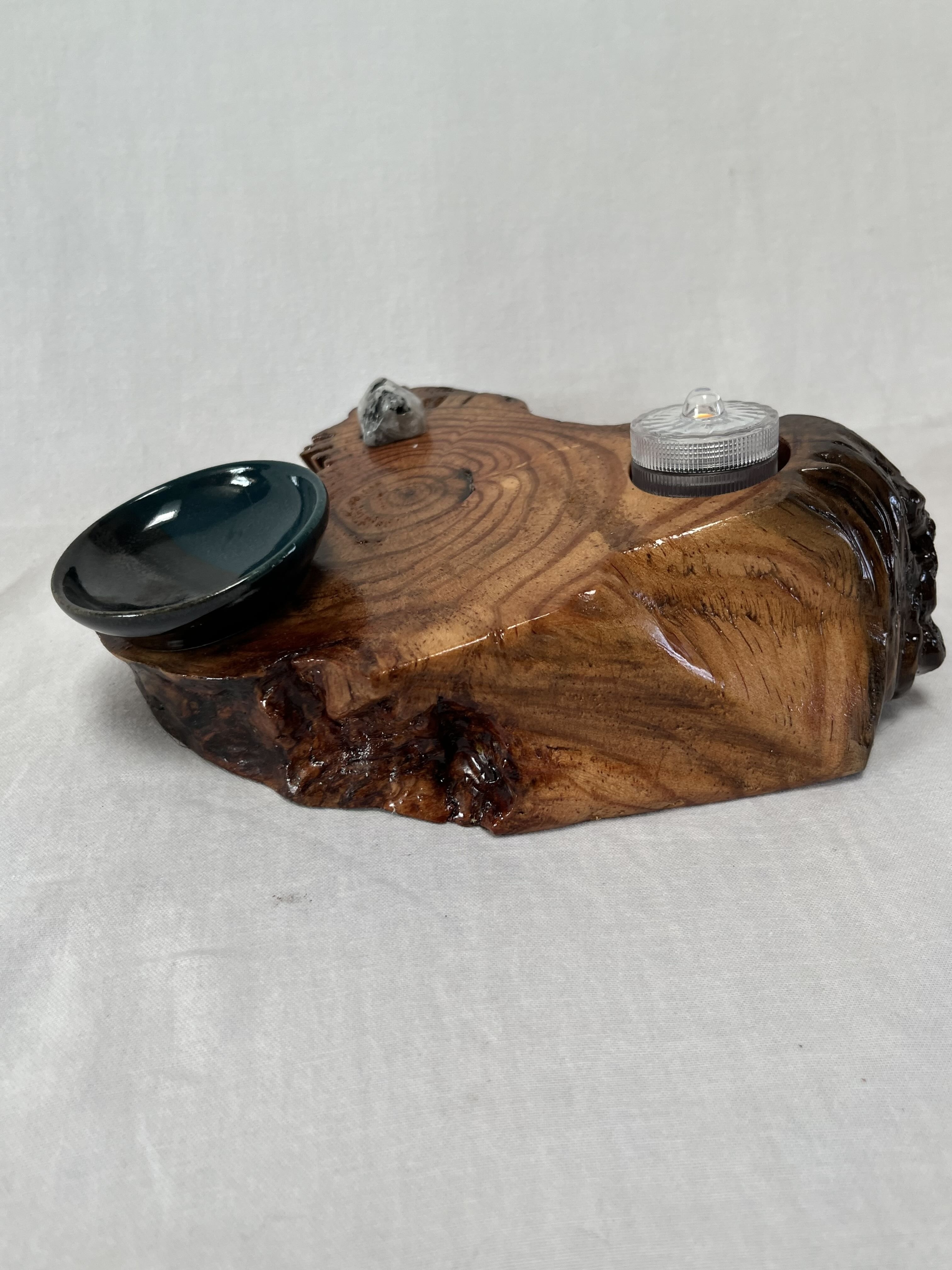 After about two years of resting, the roots and misshapen wood started calling to me to be reinvented as works of art. After washing away dirt and debris, the pieces were sanded, carefully inspected and hand shaped to bring out each individual root’s beauty and sap formation. In some areas the sap colors the wood nearly black, and in others the wood displays multiple luminous shades of gold and even reds on some pieces. Each root piece of my Earth Spirits Collection has been hand rubbed with at least two coats of Danish oil and are mounted on vintage cast-iron lamp stands of various sizes. Each also includes a healing stone to help start you on your own personal earth caretaking journey. The stump pieces of my Soul Connections Collection are a little more uniform in color but have unique tree rings, grains and thicknesses. They have been sealed with three coats of urethane and most have at least one natural outer edge which would, at one time, have been exposed to the soil. To this base I’ve added an LED tea light and a small pottery dish to hold your own offerings or for incense burning in addition to a healing stone.