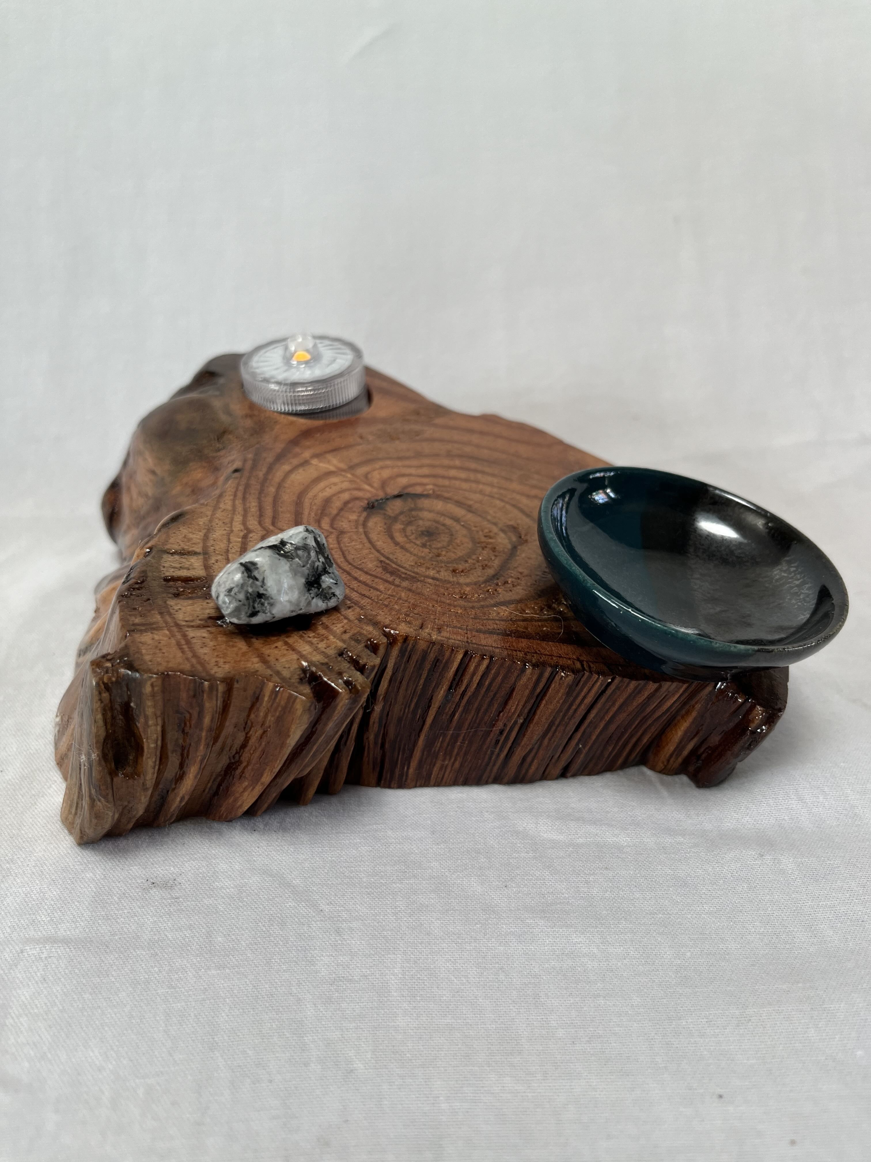 The Soul Connections Collection includes one-of-a-kind smaller stump pieces of various sizes and thicknesses. Most of these golden hued wonders are quite heavy due to the sap concentration and come in an array of sizes. Small ones are between 4-6 inches in length, medium-sized ones are 7-9 inches in length and large-sized ones are 10-12 inches in length. All are misshapen in various ways due to the way that they were pried out of the ground but most have at least one side that was exposed to the earth. These are designed for a home side table, fireplace hearth or mantle or atop a chest of drawers or bookcase. Each piece is designed to represent the four elements earth, fire, air and water in some way and include a small blue or amber tea LED light, a meta-physical stone and a small hand thrown pottery dish. The pottery dish can be used to add your own unique offerings to the altar or for incense burning.