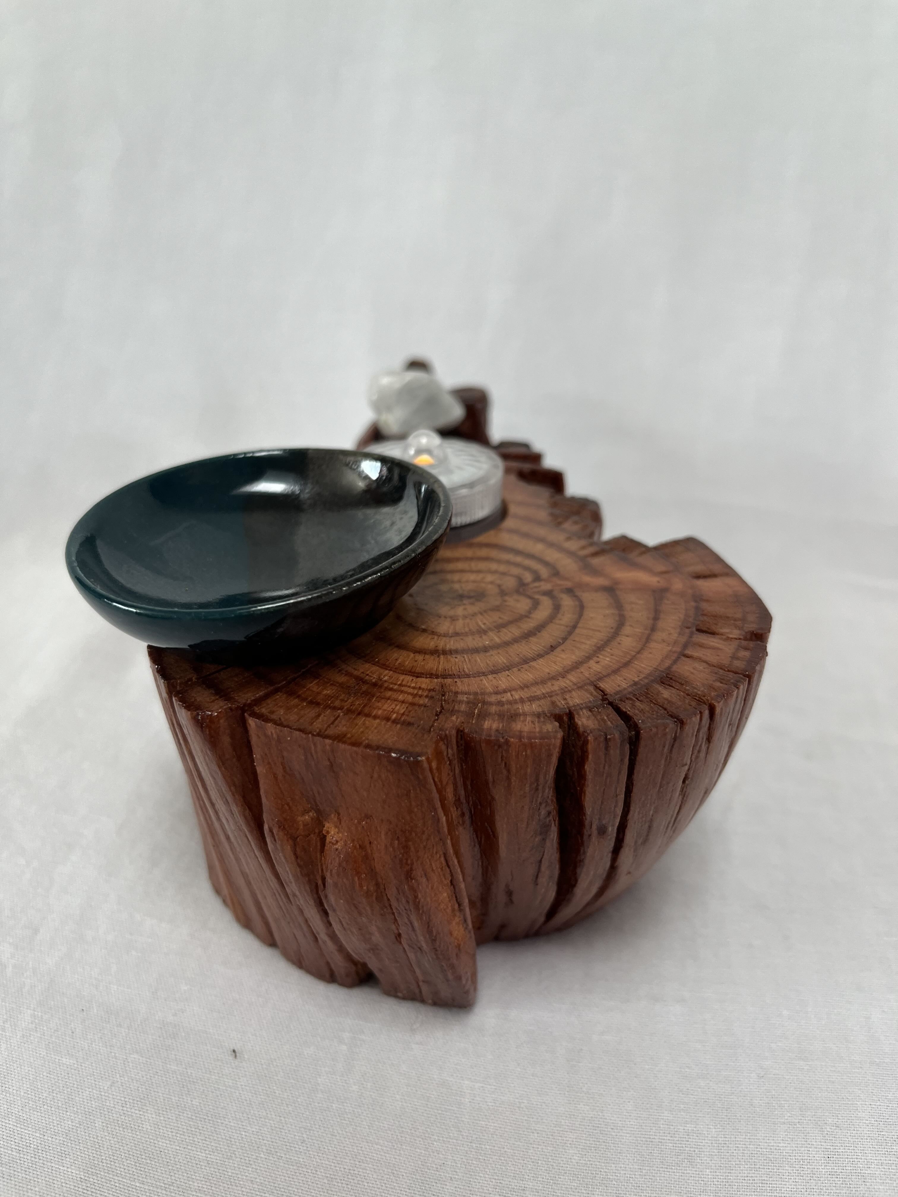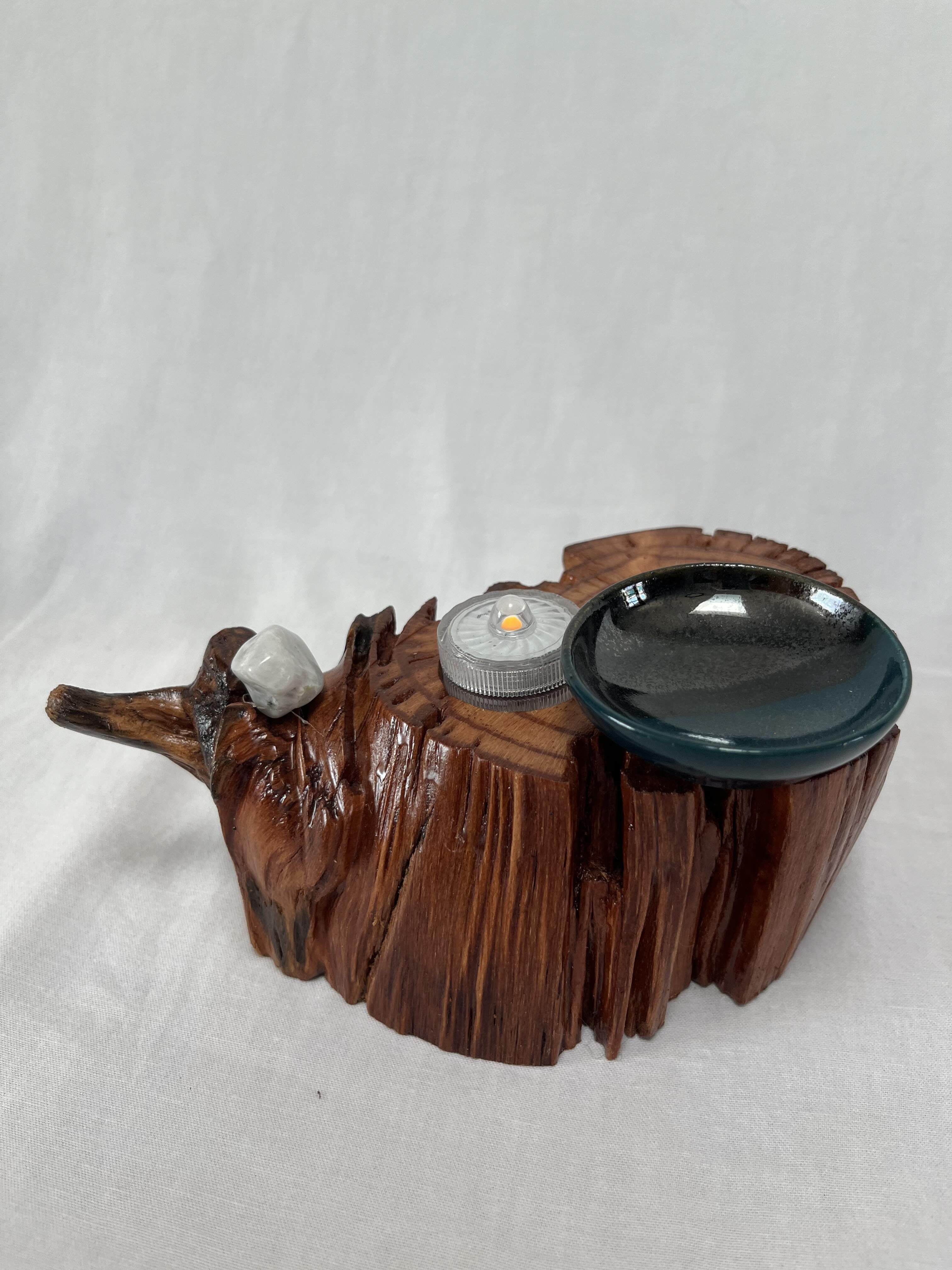 The Soul Connections Collection includes one-of-a-kind smaller stump pieces of various sizes and thicknesses. Most of these golden hued wonders are quite heavy due to the sap concentration and come in an array of sizes. Small ones are between 4-6 inches in length, medium-sized ones are 7-9 inches in length and large-sized ones are 10-12 inches in length. All are misshapen in various ways due to the way that they were pried out of the ground but most have at least one side that was exposed to the earth. These are designed for a home side table, fireplace hearth or mantle or atop a chest of drawers or bookcase. Each piece is designed to represent the four elements earth, fire, air and water in some way and include a small blue or amber tea LED light, a meta-physical stone and a small hand thrown pottery dish. The pottery dish can be used to add your own unique offerings to the altar or for incense burning.