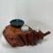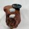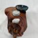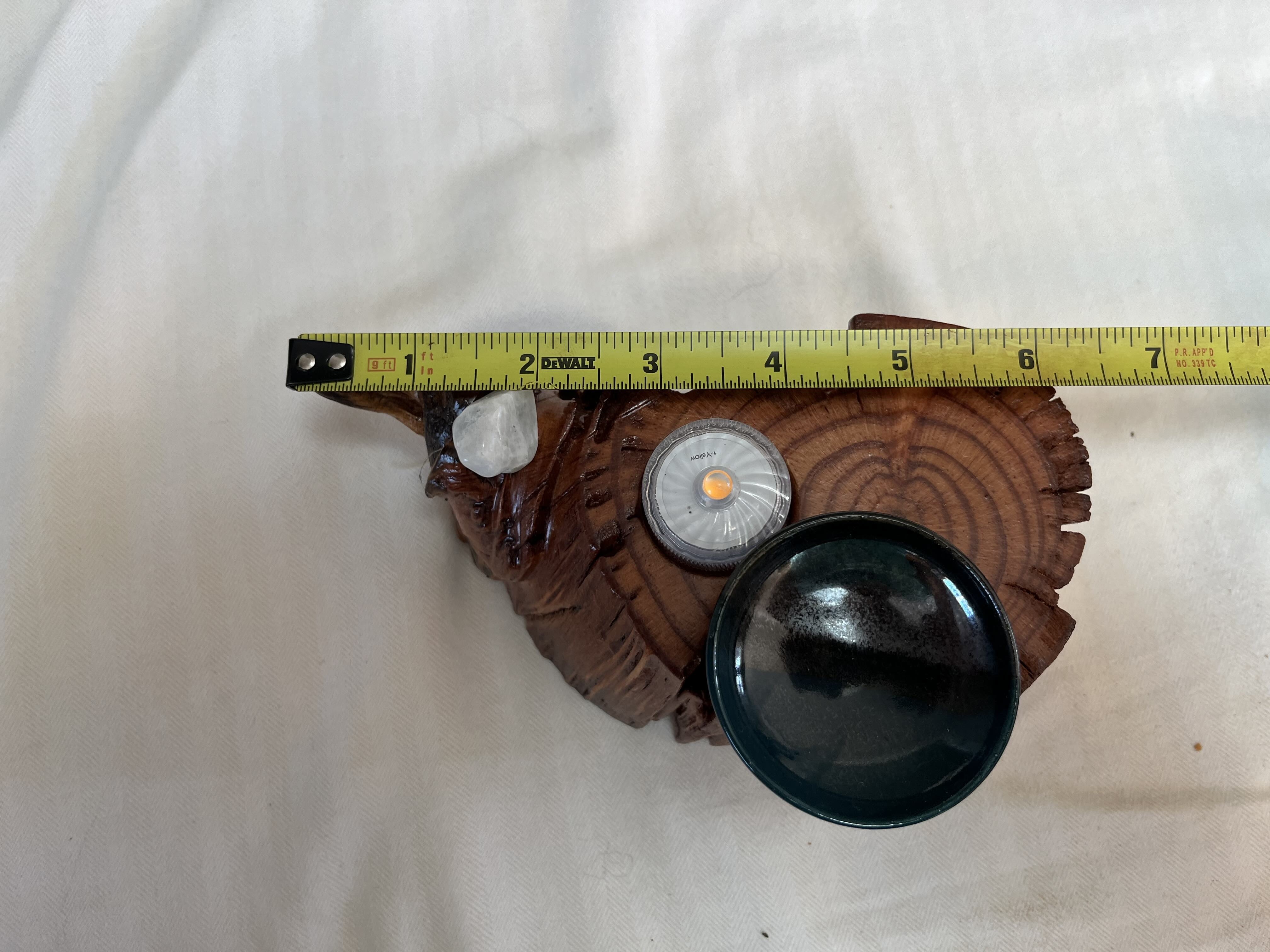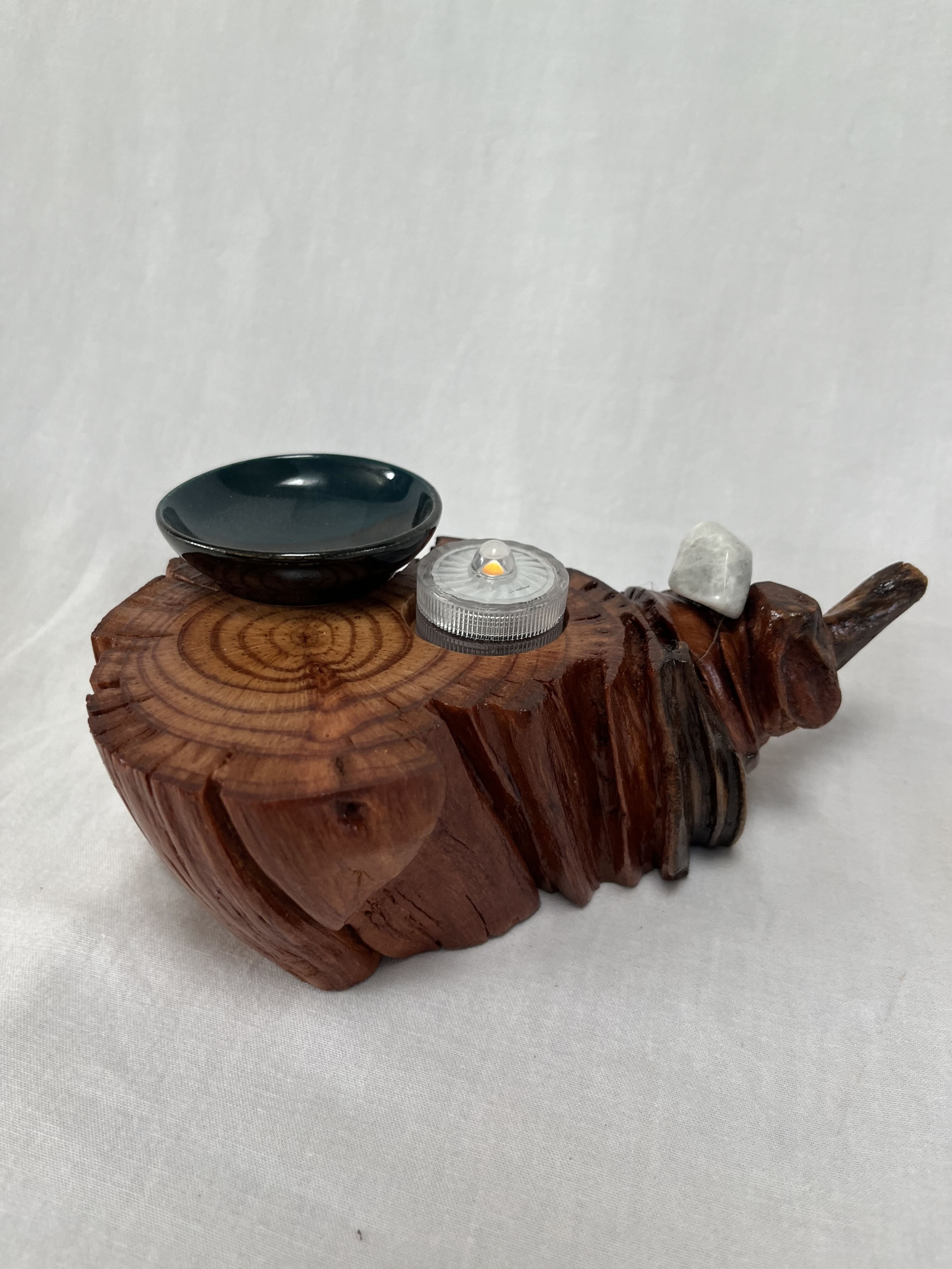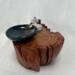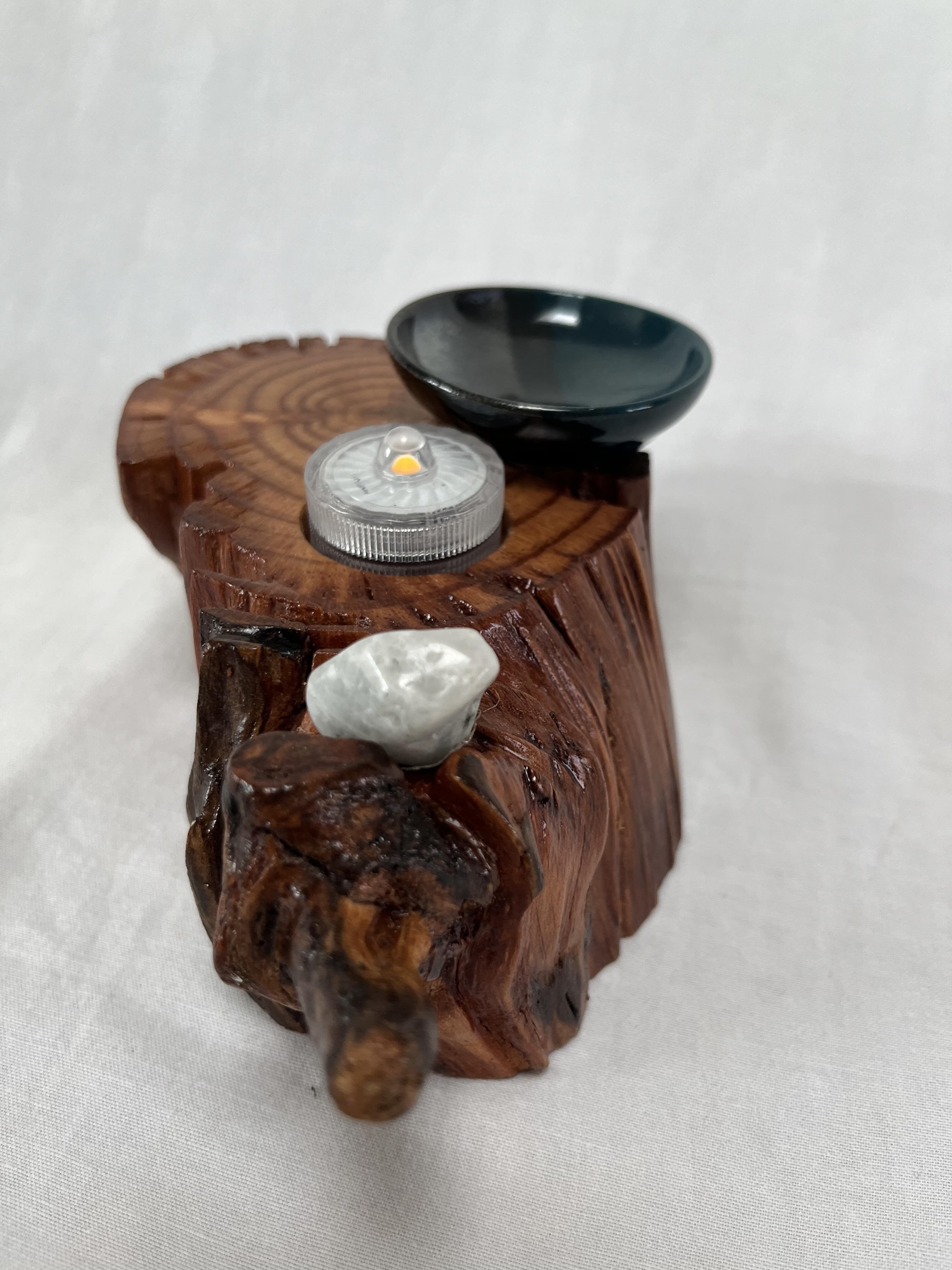After about two years of resting, the roots and misshapen wood started calling to me to be reinvented as works of art. After washing away dirt and debris, the pieces were sanded, carefully inspected and hand shaped to bring out each individual root’s beauty and sap formation. In some areas the sap colors the wood nearly black, and in others the wood displays multiple luminous shades of gold and even reds on some pieces. Each root piece of my Earth Spirits Collection has been hand rubbed with at least two coats of Danish oil and are mounted on vintage cast-iron lamp stands of various sizes. Each also includes a healing stone to help start you on your own personal earth caretaking journey. The stump pieces of my Soul Connections Collection are a little more uniform in color but have unique tree rings, grains and thicknesses. They have been sealed with three coats of urethane and most have at least one natural outer edge which would, at one time, have been exposed to the soil. To this base I’ve added an LED tea light and a small pottery dish to hold your own offerings or for incense burning in addition to a healing stone.