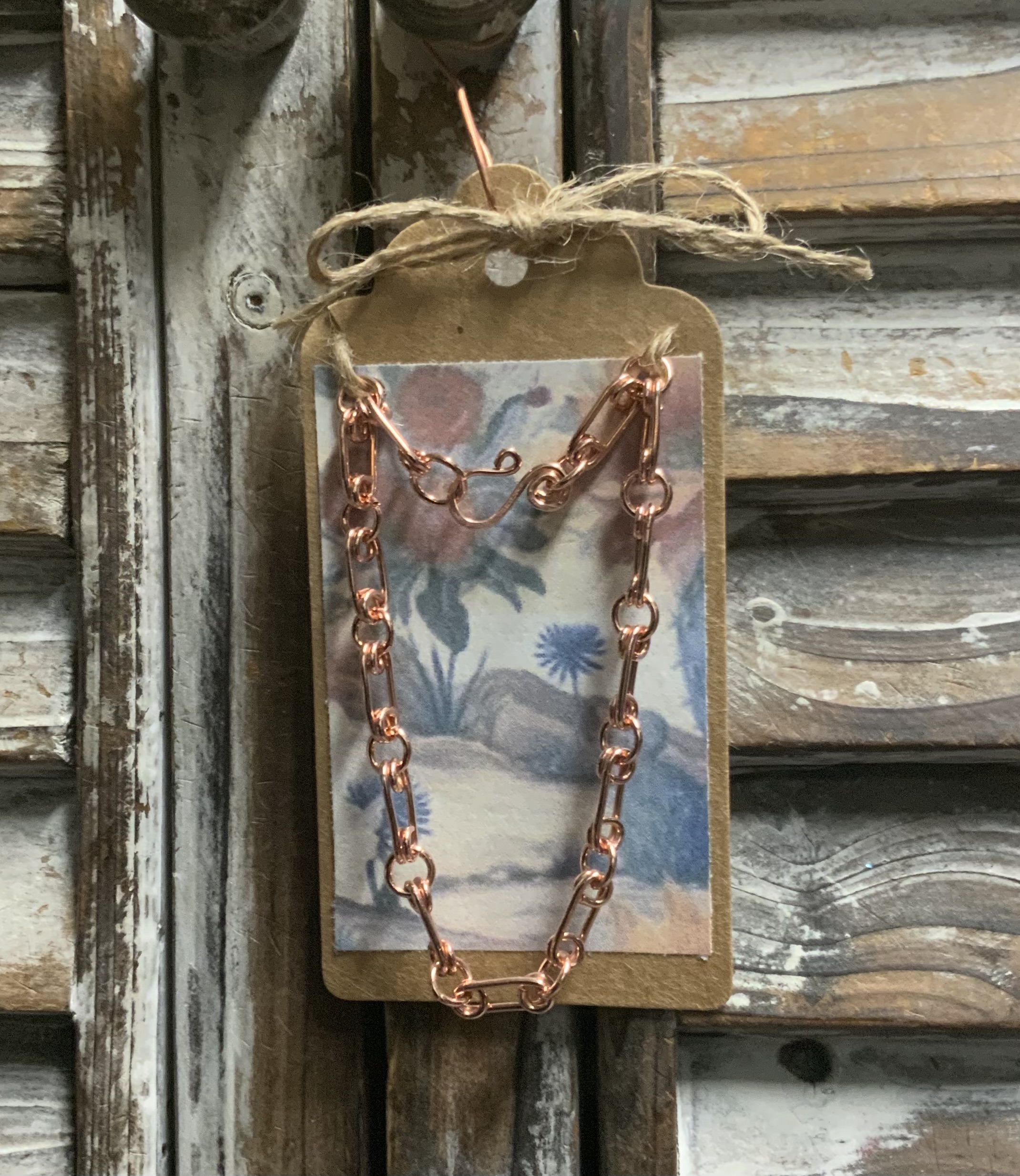 This 7 1/2” copper link bracelet is made with 18ga bare copper wire. Each jump ring and link are made by hand, then assembled. With every bracelet that I make the length will be slightly different, which makes every one unique.