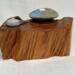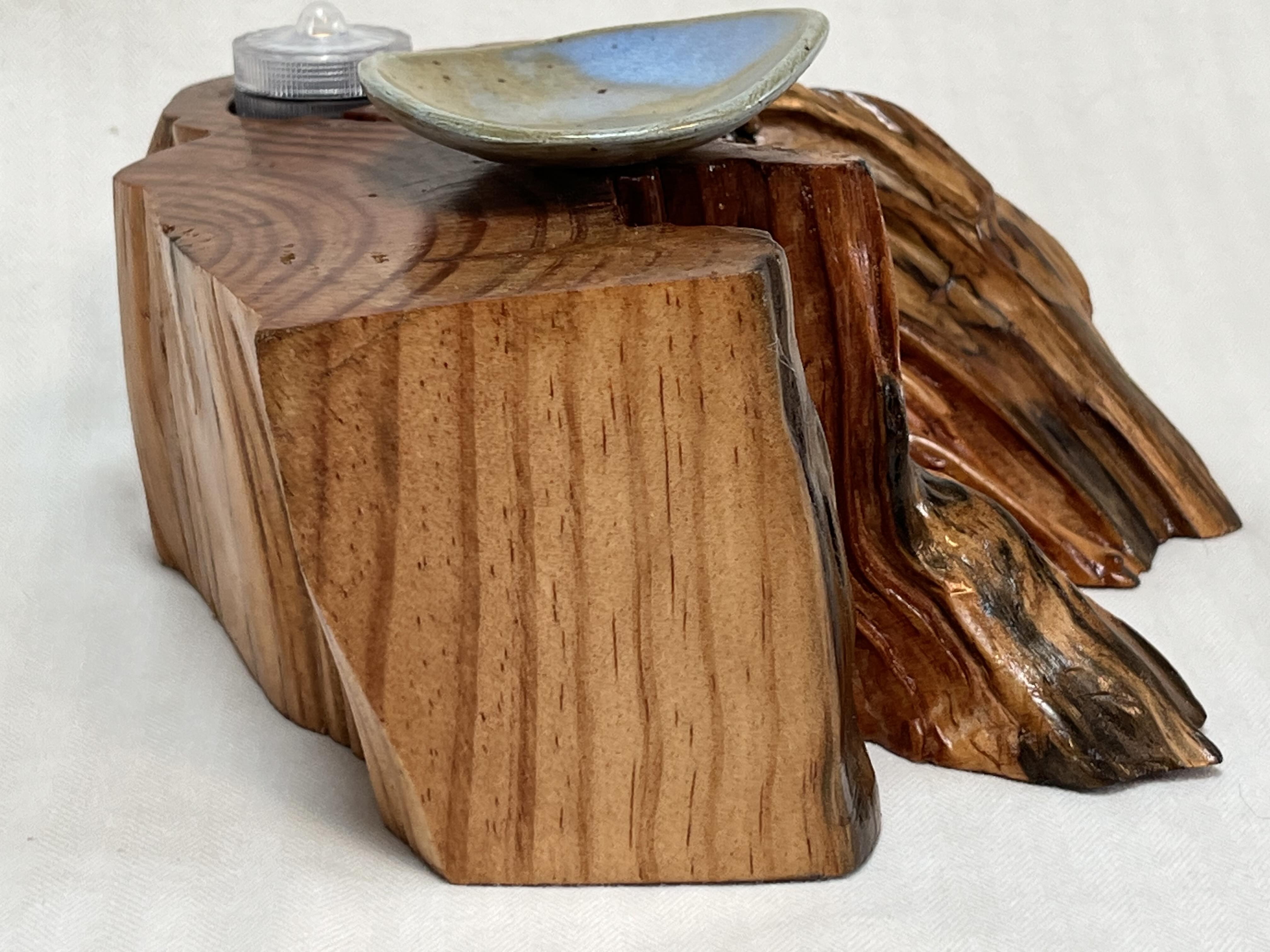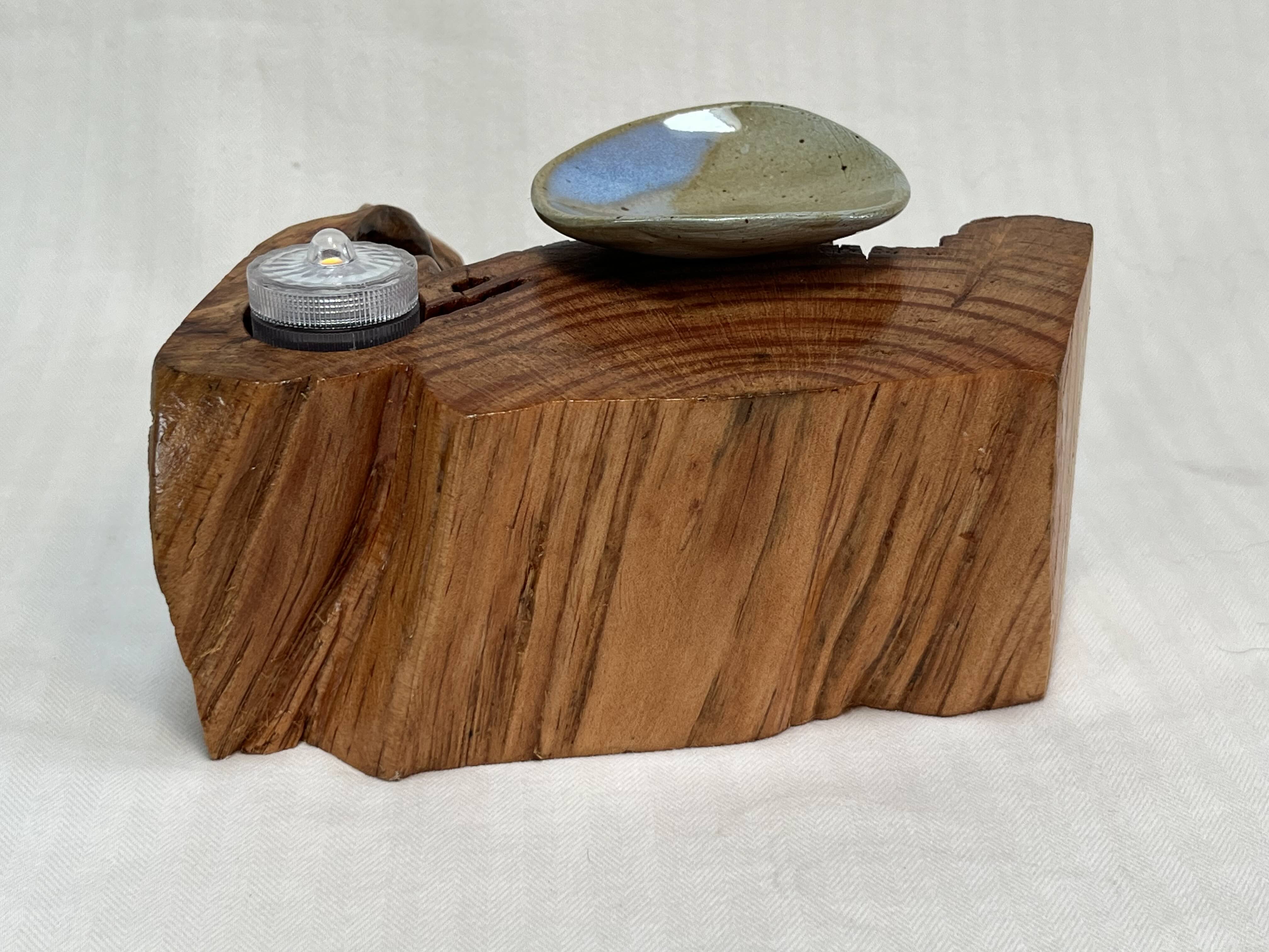 The Soul Connections Collection includes one-of-a-kind smaller stump pieces of various sizes and thicknesses. Most of these golden hued wonders are quite heavy due to the sap concentration and come in an array of sizes. Small ones are between 4-6 inches in length, medium-sized ones are 7-9 inches in length and large-sized ones are 10-12 inches in length. All are misshapen in various ways due to the way that they were pried out of the ground but most have at least one side that was exposed to the earth. These are designed for a home side table, fireplace hearth or mantle or atop a chest of drawers or bookcase. Each piece is designed to represent the four elements earth, fire, air and water in some way and include a small blue or amber tea LED light, a meta-physical stone and a small hand thrown pottery dish. The pottery dish can be used to add your own unique offerings to the altar or for incense burning.