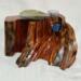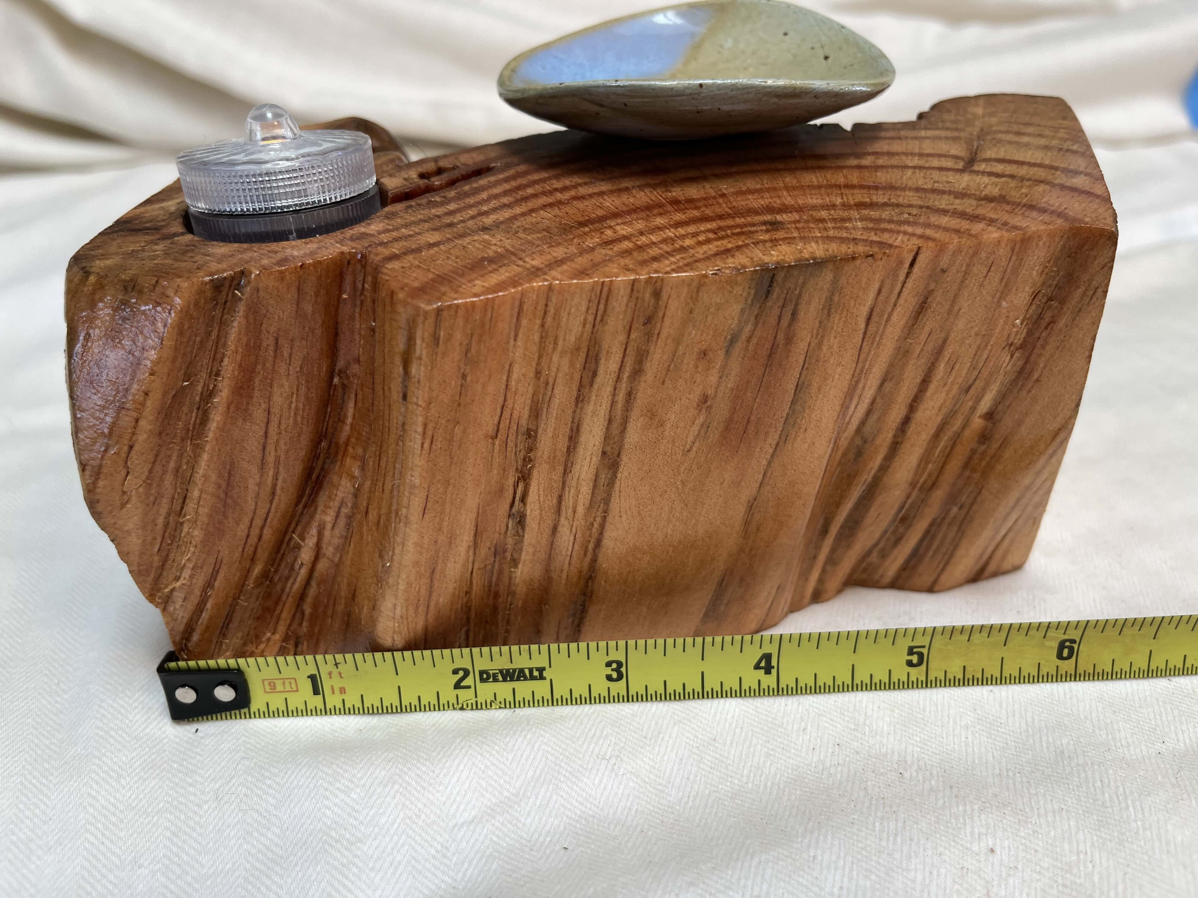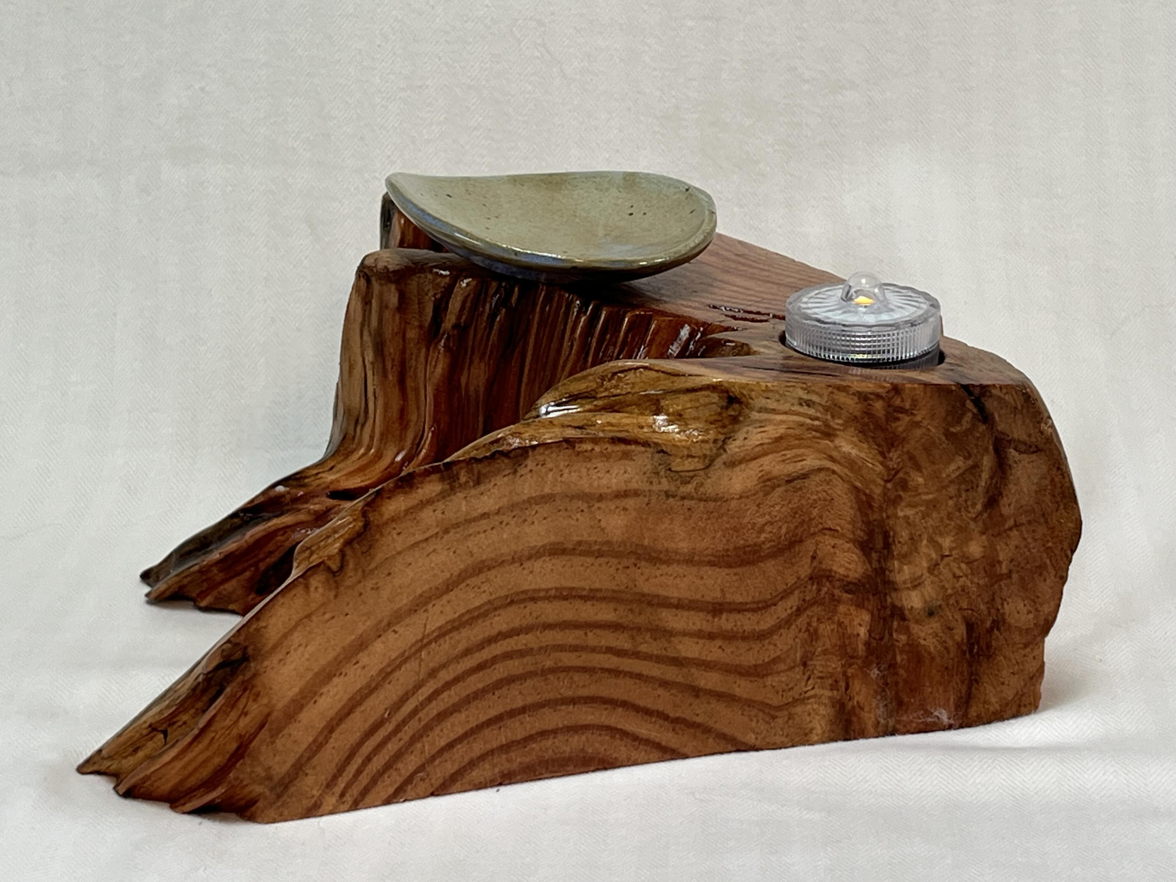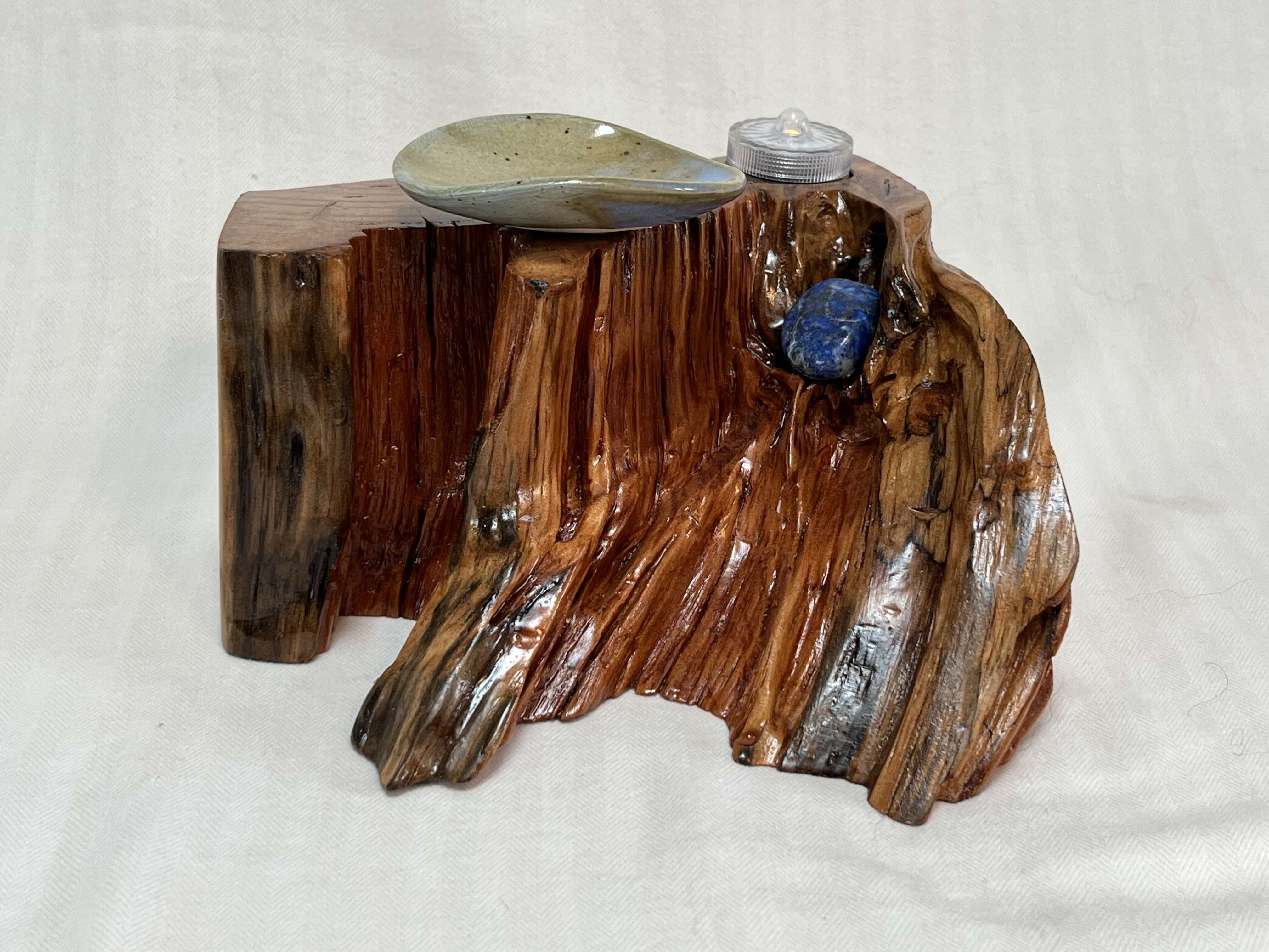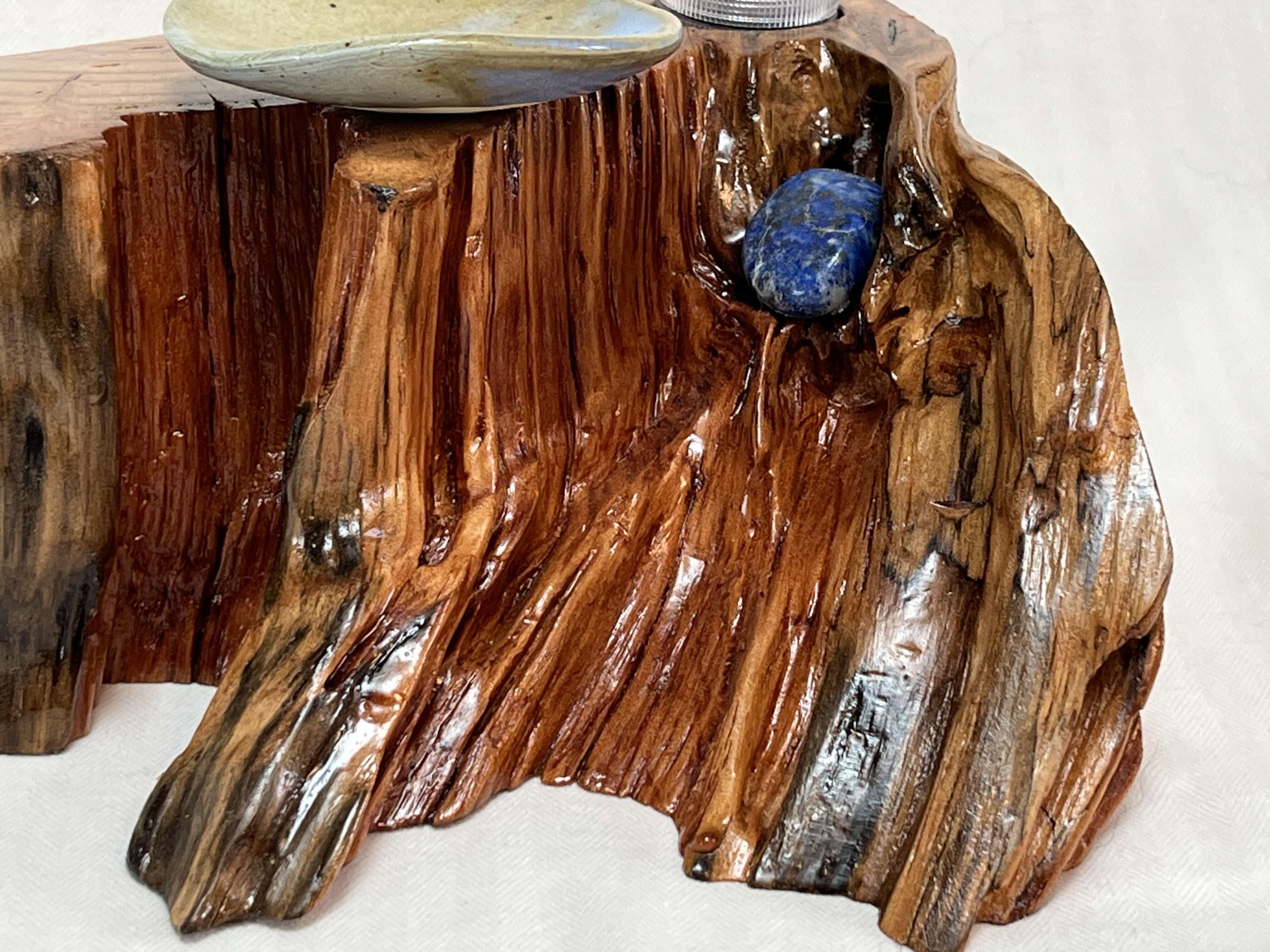 After about two years of resting, the roots and misshapen wood started calling to me to be reinvented as works of art. After washing away dirt and debris, the pieces were sanded, carefully inspected and hand shaped to bring out each individual root’s beauty and sap formation. In some areas the sap colors the wood nearly black, and in others the wood displays multiple luminous shades of gold and even reds on some pieces. Each root piece of my Earth Spirits Collection has been hand rubbed with at least two coats of Danish oil and are mounted on vintage cast-iron lamp stands of various sizes. Each also includes a healing stone to help start you on your own personal earth caretaking journey. The stump pieces of my Soul Connections Collection are a little more uniform in color but have unique tree rings, grains and thicknesses. They have been sealed with three coats of urethane and most have at least one natural outer edge which would, at one time, have been exposed to the soil. To this base I’ve added an LED tea light and a small pottery dish to hold your own offerings or for incense burning in addition to a healing stone.