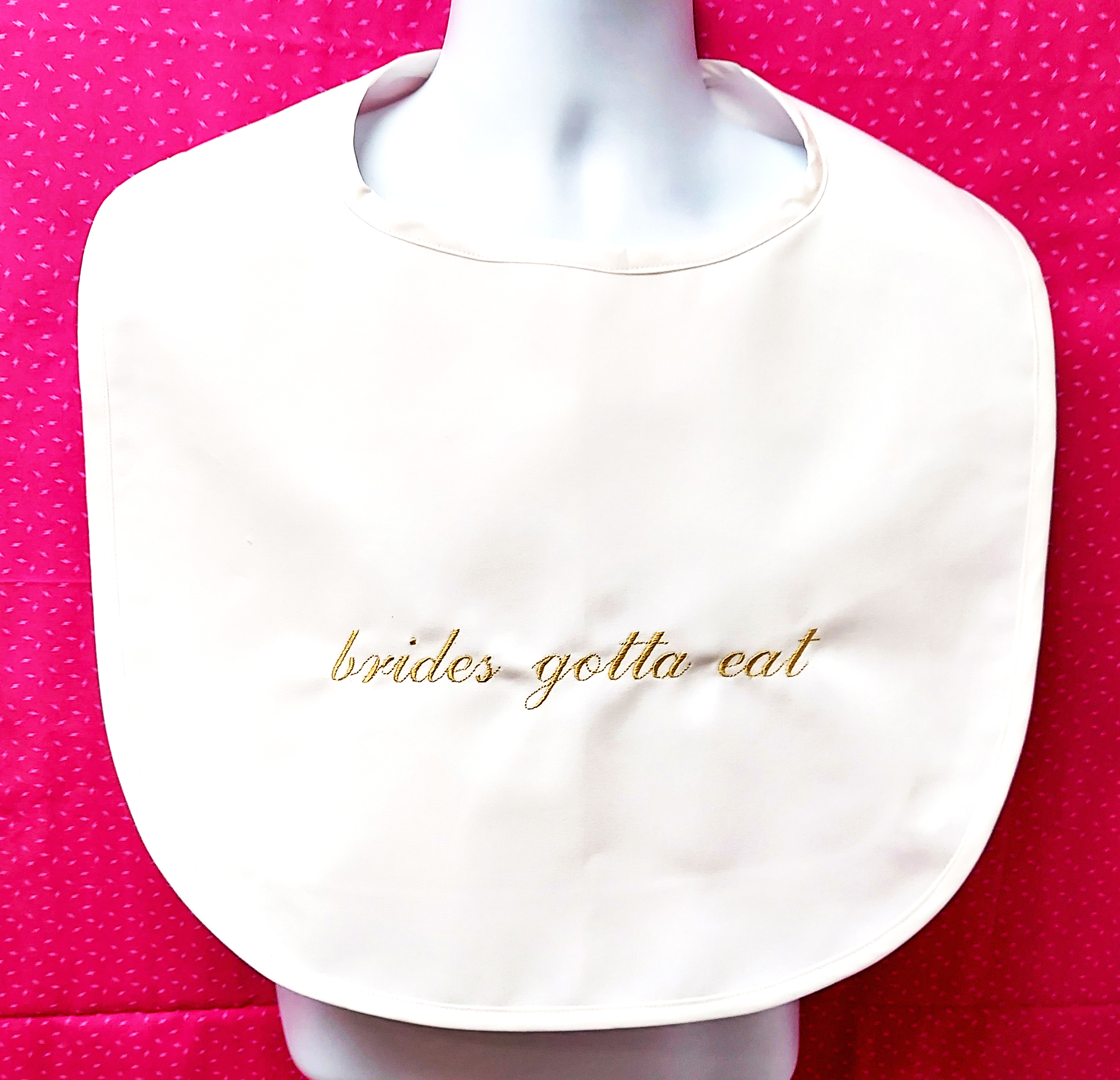 A Brides Gotta Eat Wedding Dinner, Bridal Gift, Trending Adult Bib, AGFT 470 cotton twill bib is 22 inches long and 16 1/2 inches wide with a hook and loop closure. Bib is not waterproof and the bias tape trim around the edge of the bib coordinates with the bib but does NOT exactly match the color of the bib.I make custom bibs for you with care in my non-smoking sewing studio in Missouri.