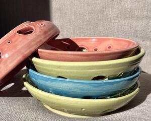 As for the care of your piece, the glazes are all food safe. These can be used in the dishwasher, the microwave, and the oven. As with all ceramics, please avoid sharp changes in temperature. Avoid taking something from a cold refrigerator and putting it directly into a hot oven. Pottery typically doesn’t handle that type of sharp change in temperature well…..