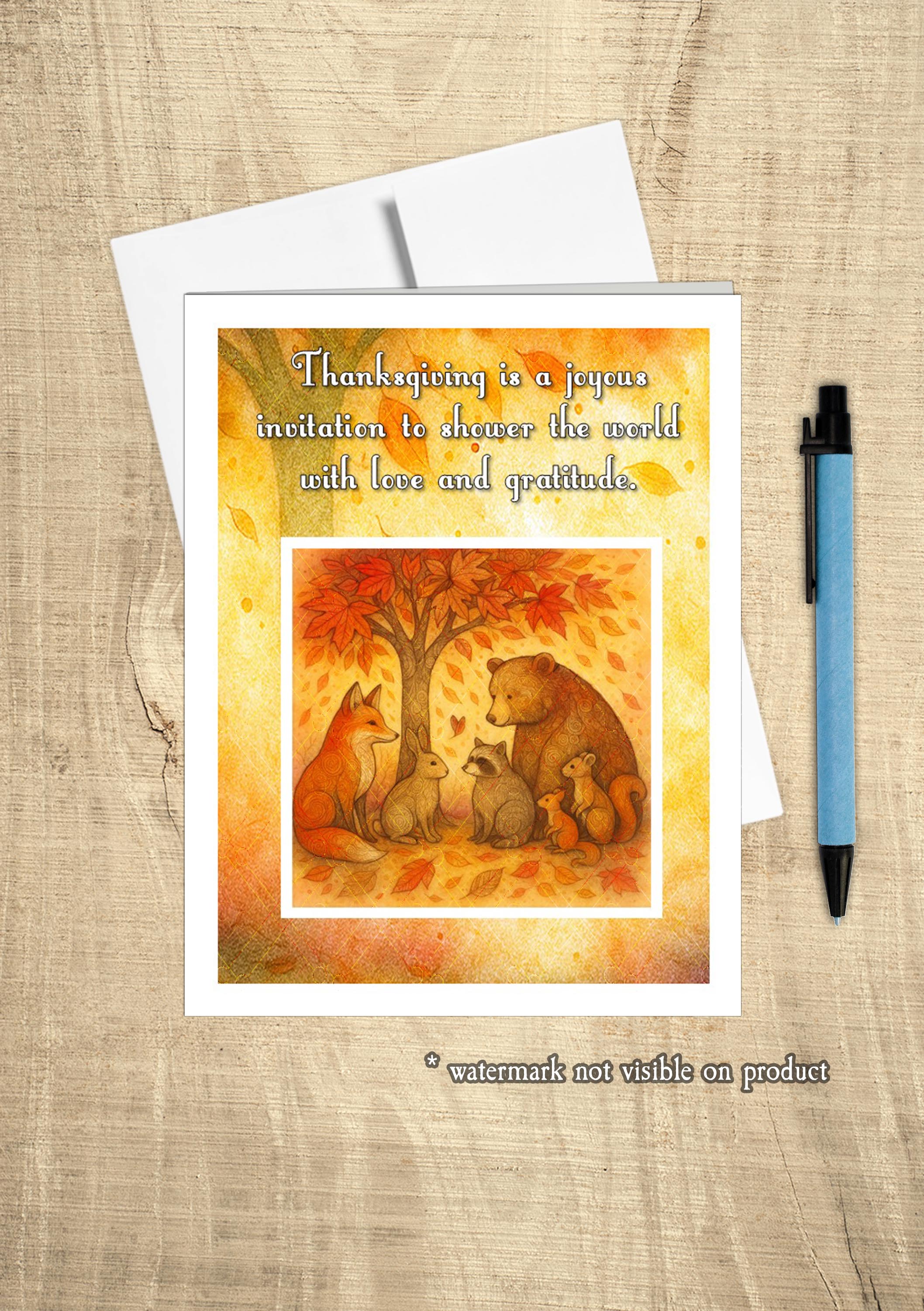 Look, not every Thanksgiving card has to involve a turkey in therapy or a casserole disaster. This one’s actually… dare we say it… genuinely sweet. Featuring a serene woodland scene of nature’s favorite introverts gathered under a fiery autumn tree—this card practically whispers gratitude in a warm, cinnamon-scented tone.