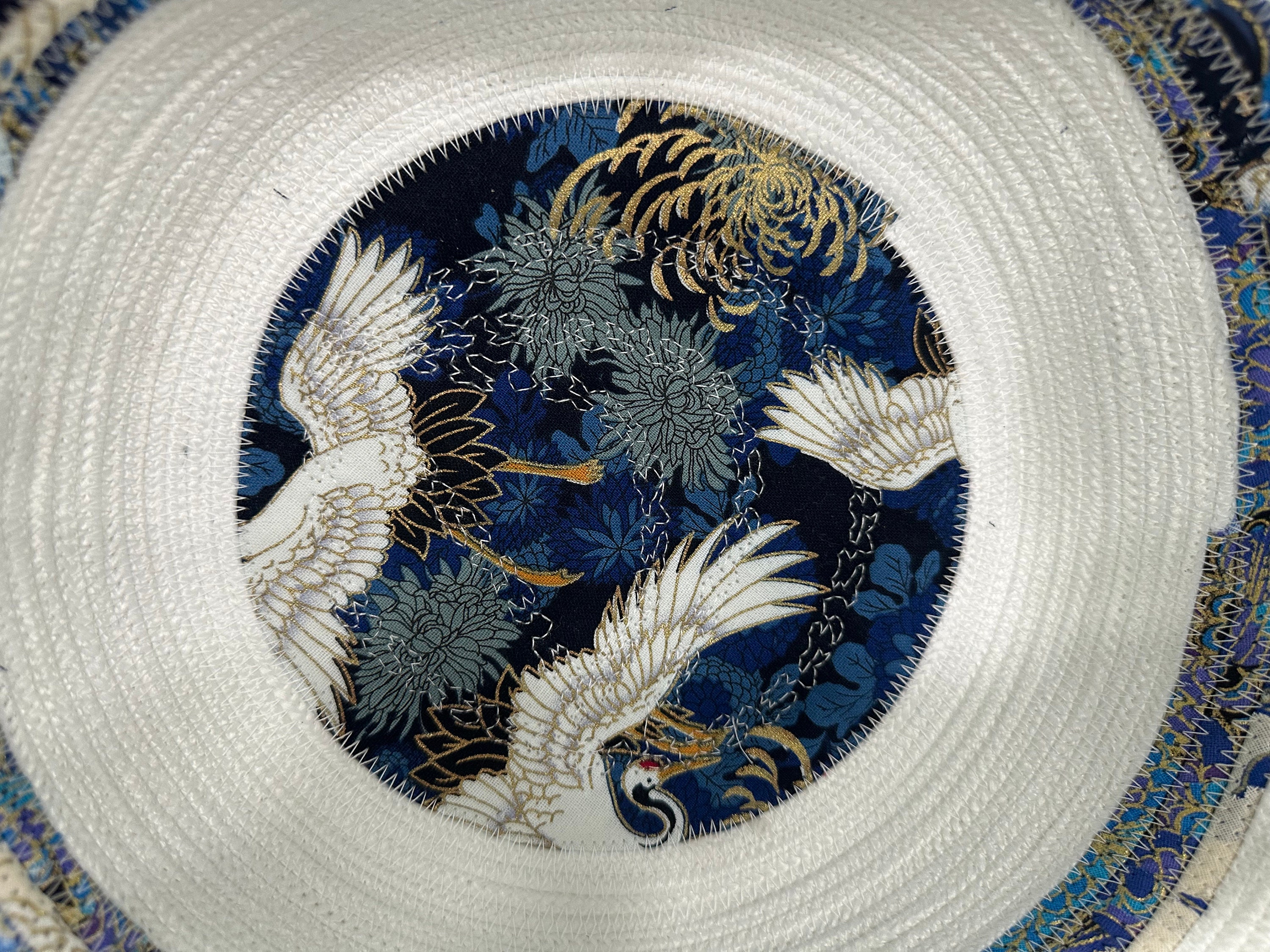 This delightful rope basket/bowl is crafted from soft white cotton rope, accented with a touch of wrapped quilted fabric and a beautifully designed fabric bottom. Its simple yet charming style makes it perfect for organizing small items or as a decorative piece for any room. The quilted fabric adds a pop of texture and color, elevating its look while maintaining a cozy, handmade feel. Whether you use it for storage or display, this basket brings a unique blend of charm and function to your home.