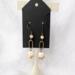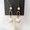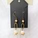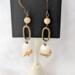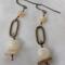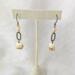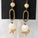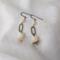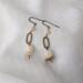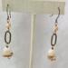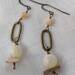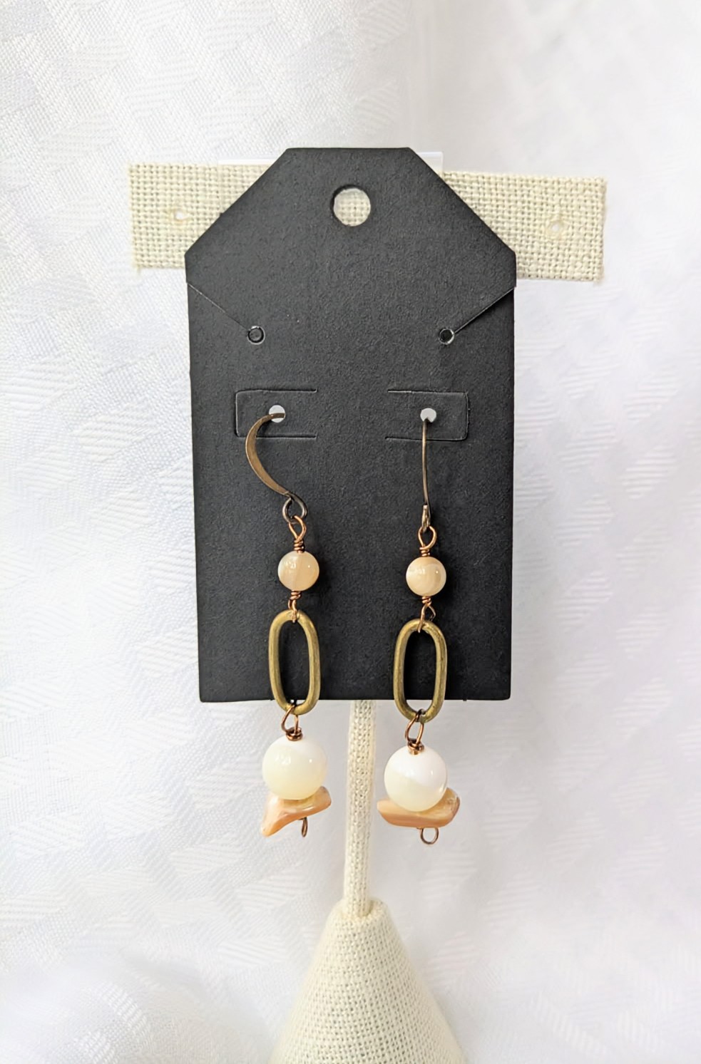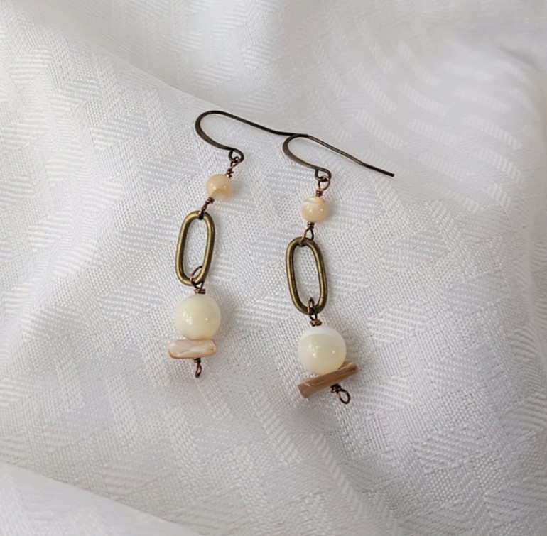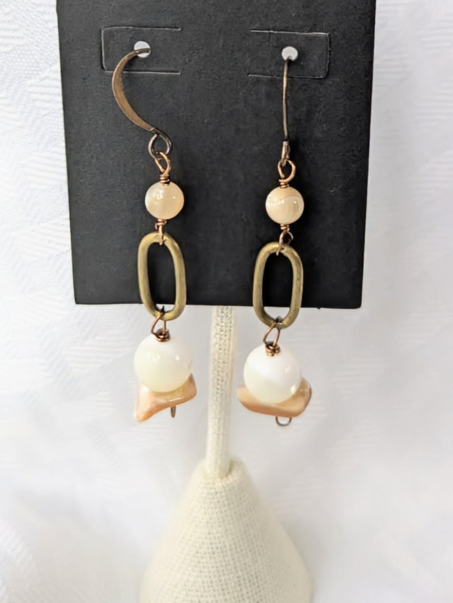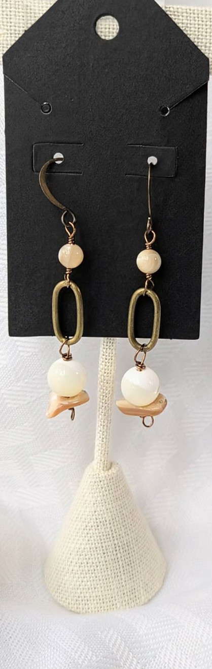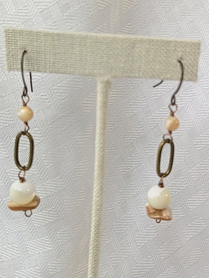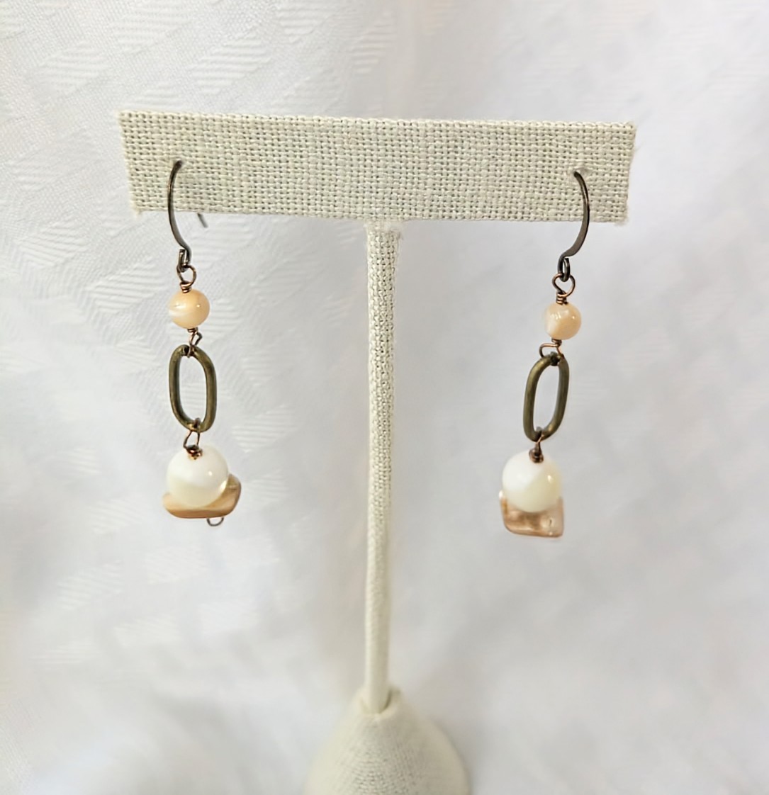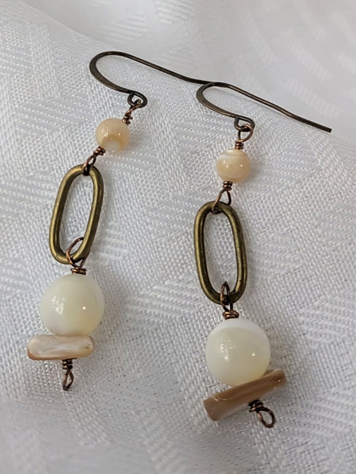 In this unique design each Earring has two Mother of Pearl beads, in shades of white to tan and colors in between. The bead at the top is approximately 5mm in size brought together with a brass link, the bottom bead is approximately 8 mm in size and sits on an Abalone chip. All have an iridescent quality to them and can look different depending on how the light shines on them. The length from the bottom of the ear wire to the bottom of the earring is approximately 1 3/4" .