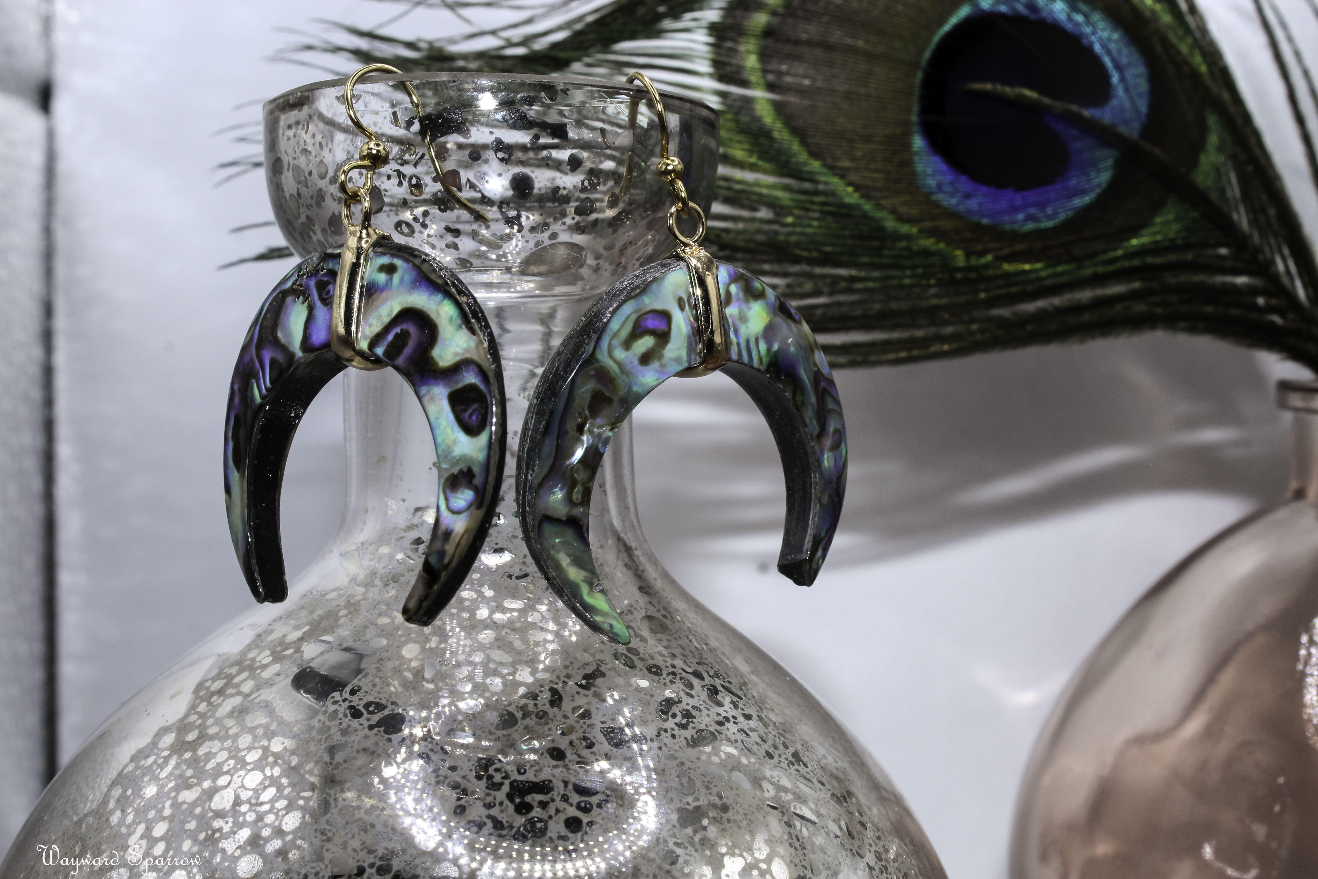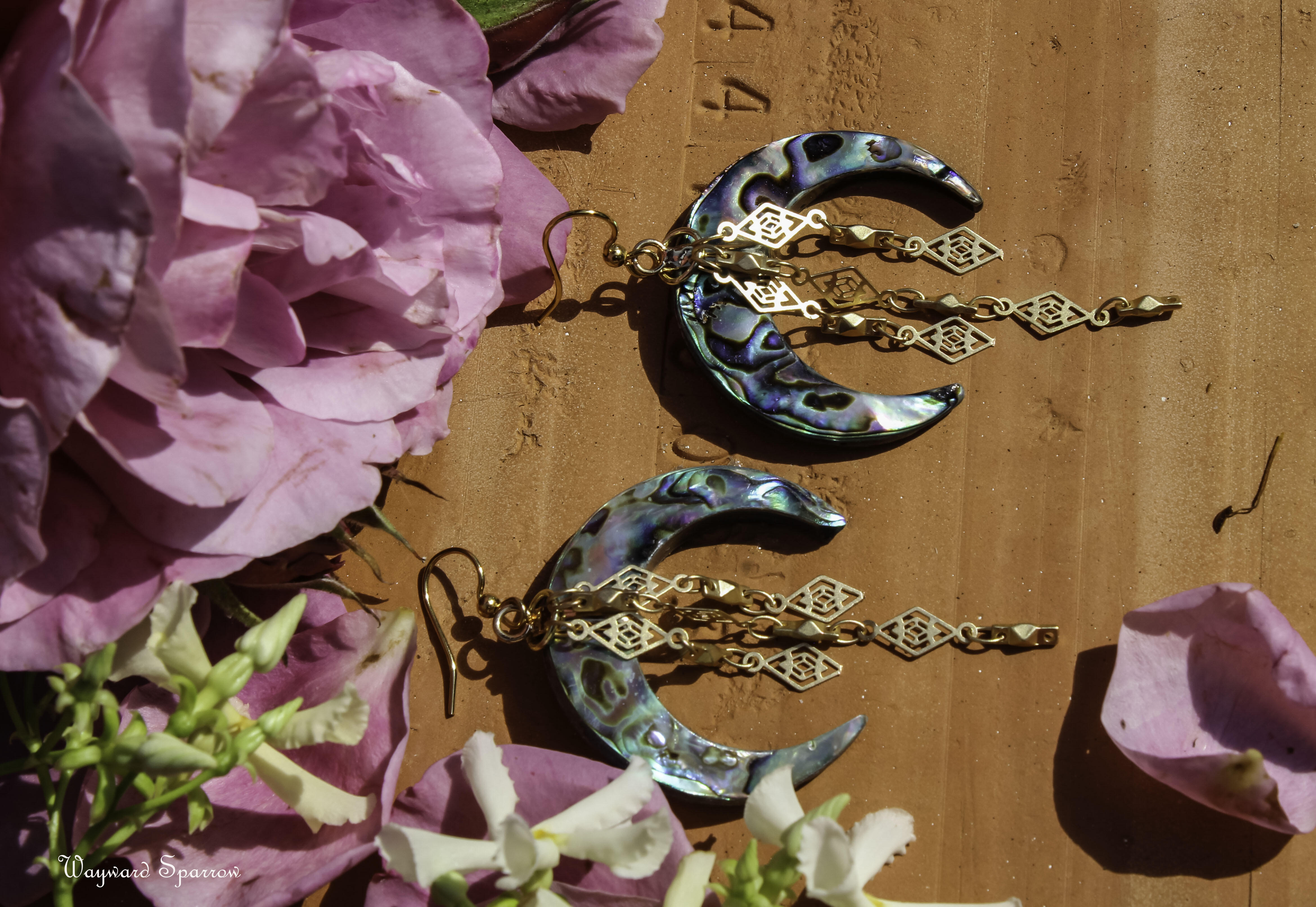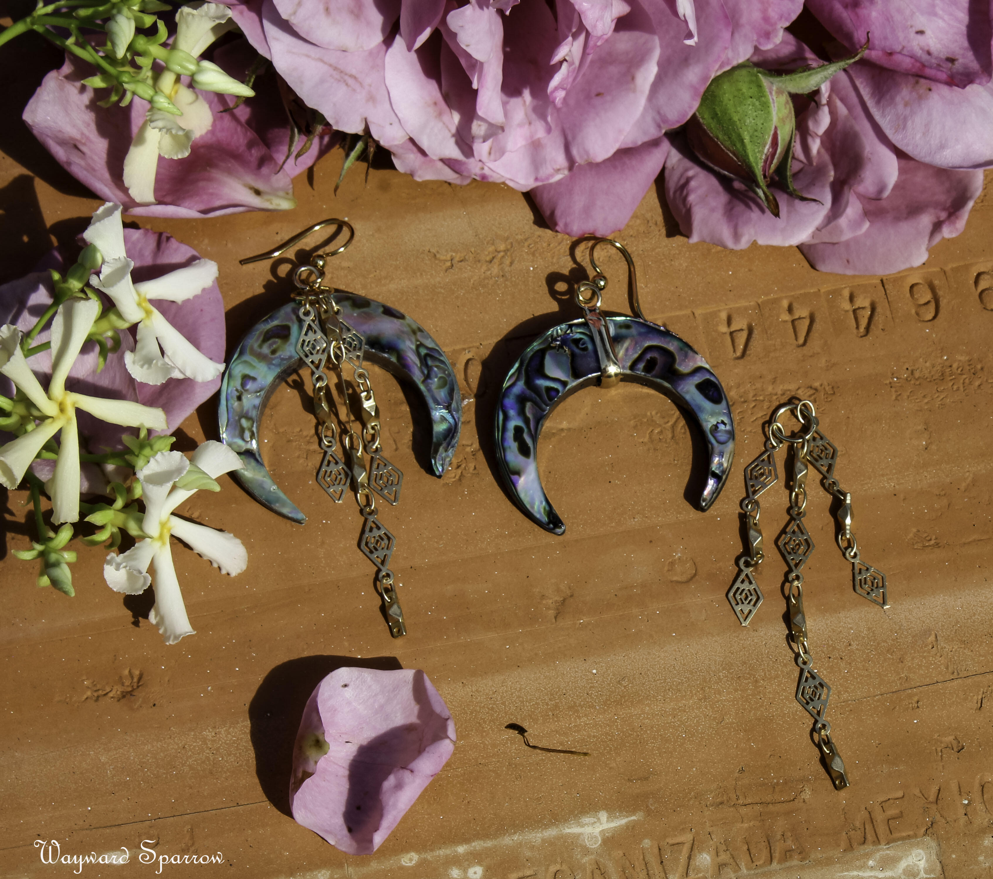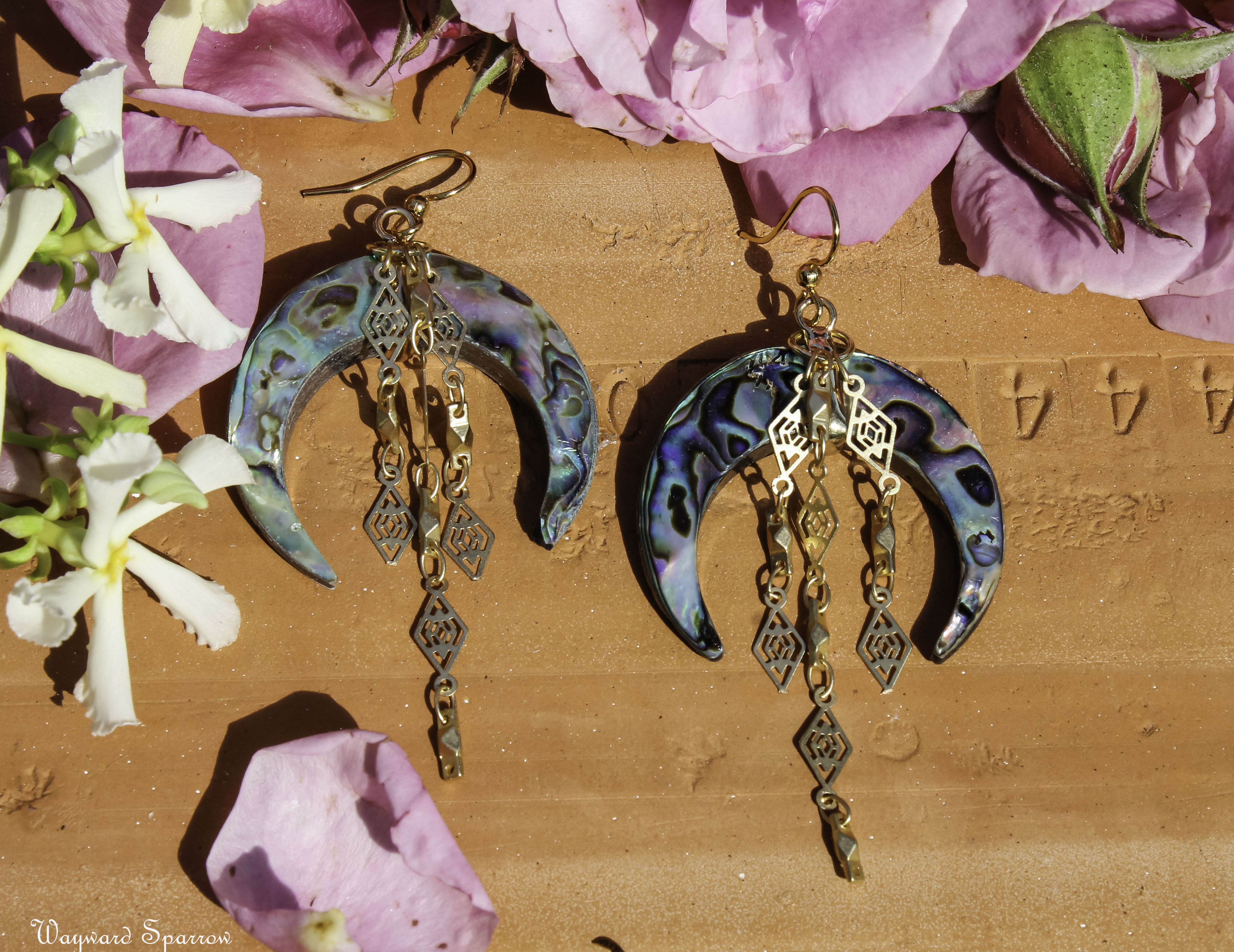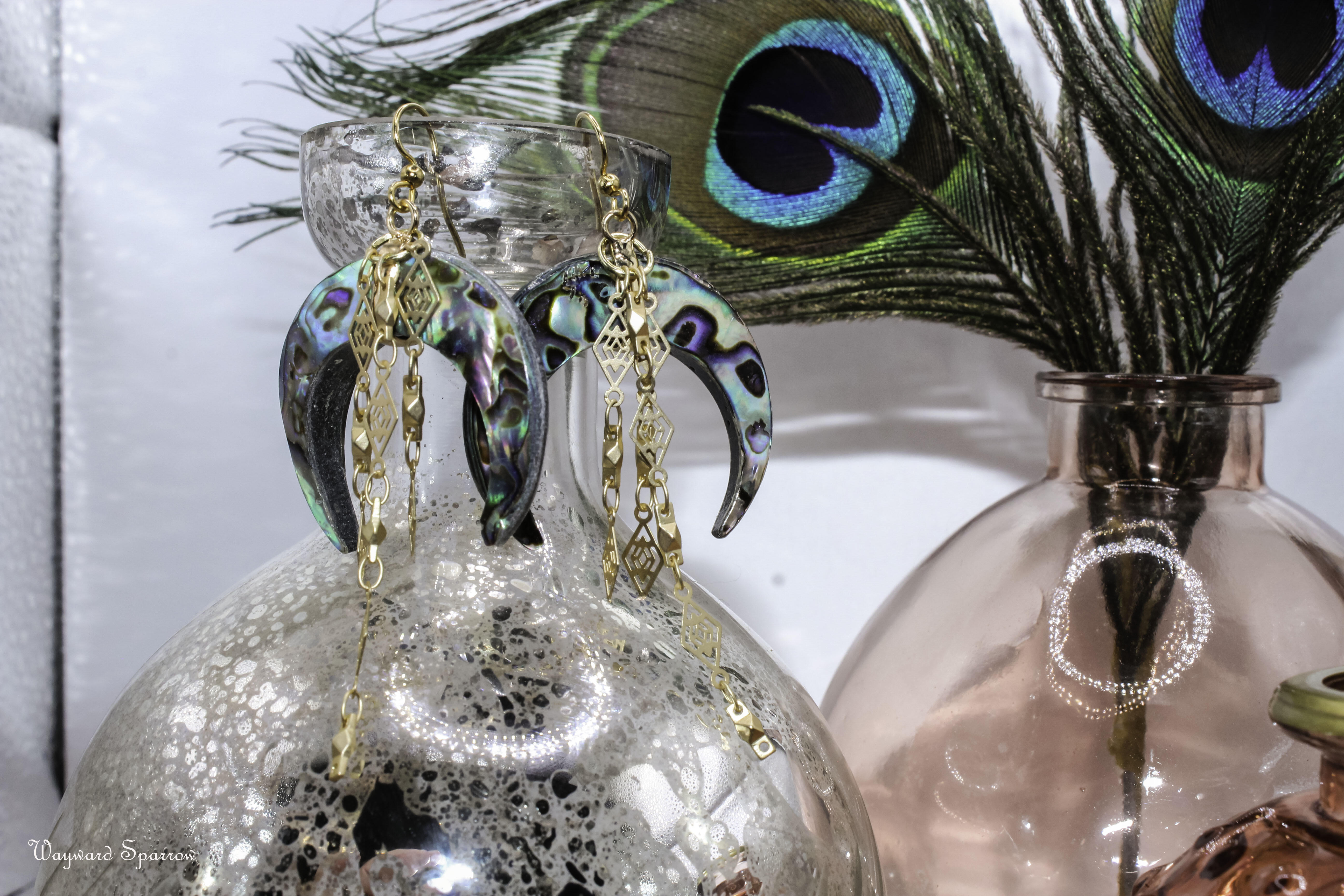 Shimmery abalone goddess moon earring accented by filagree chain. The chains are removeable to get a two in one look.
