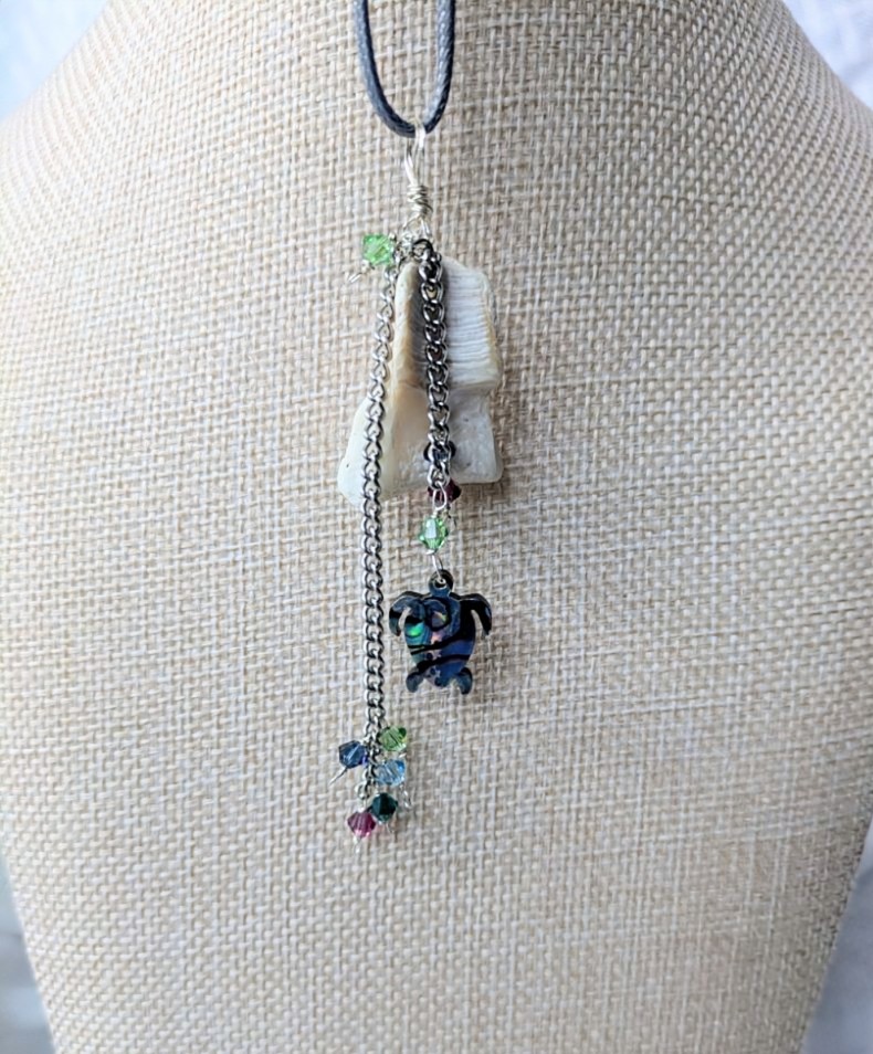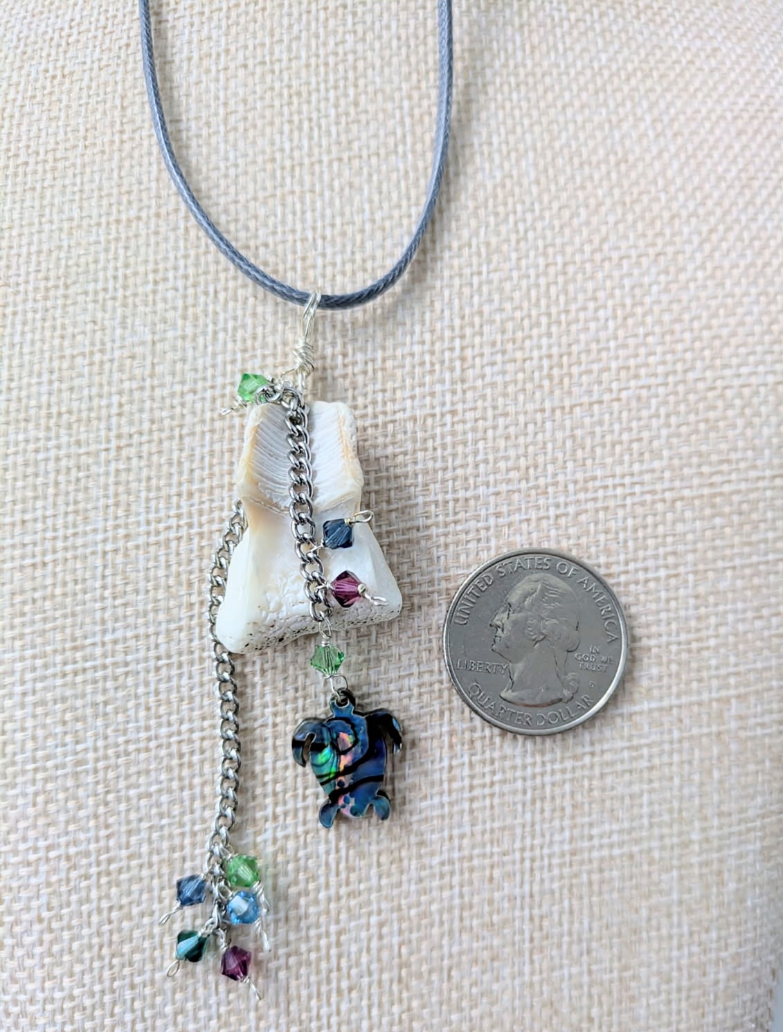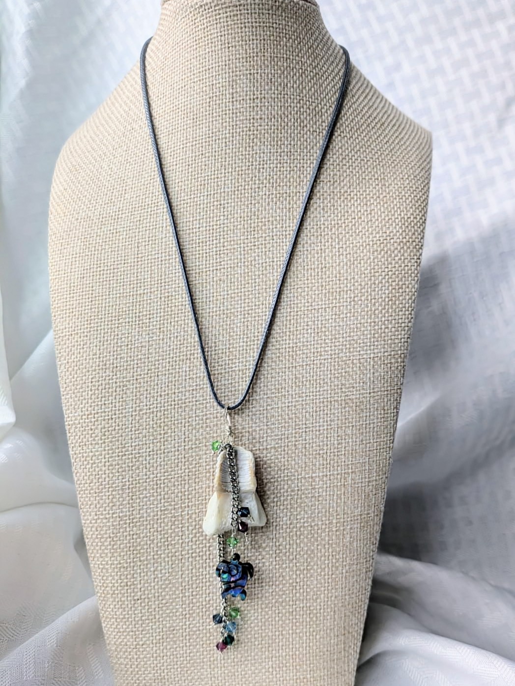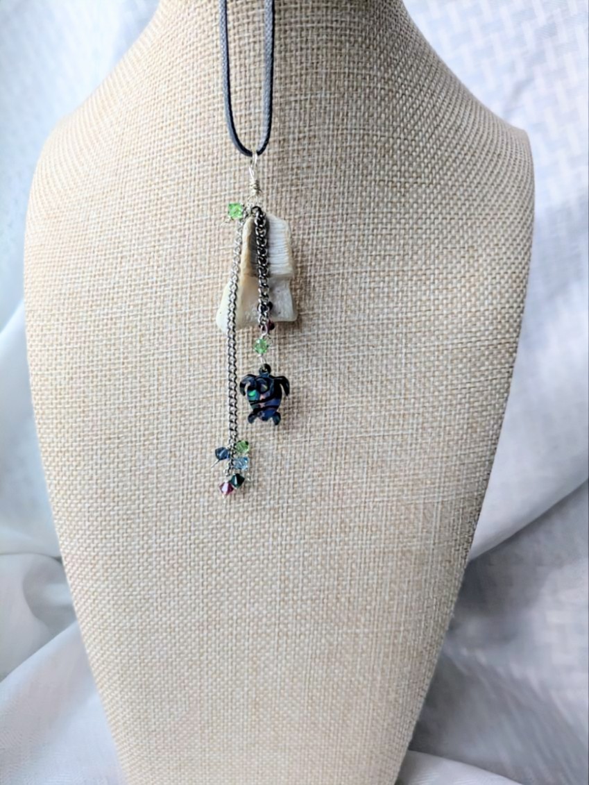 Another remnant of a seashell that I could not leave on the beach! This unique shell serves as a natural background for the Abalone Sea Turtle charm and 4mm Swarovski Crystals which dangle at various lengths.