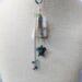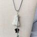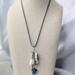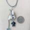 The length from the top of the bail to the bottom of the longest chain is approximately 3 1/2" inches. This necklace is strung on a 17" inch blue leather cord with a 2" inch extender.