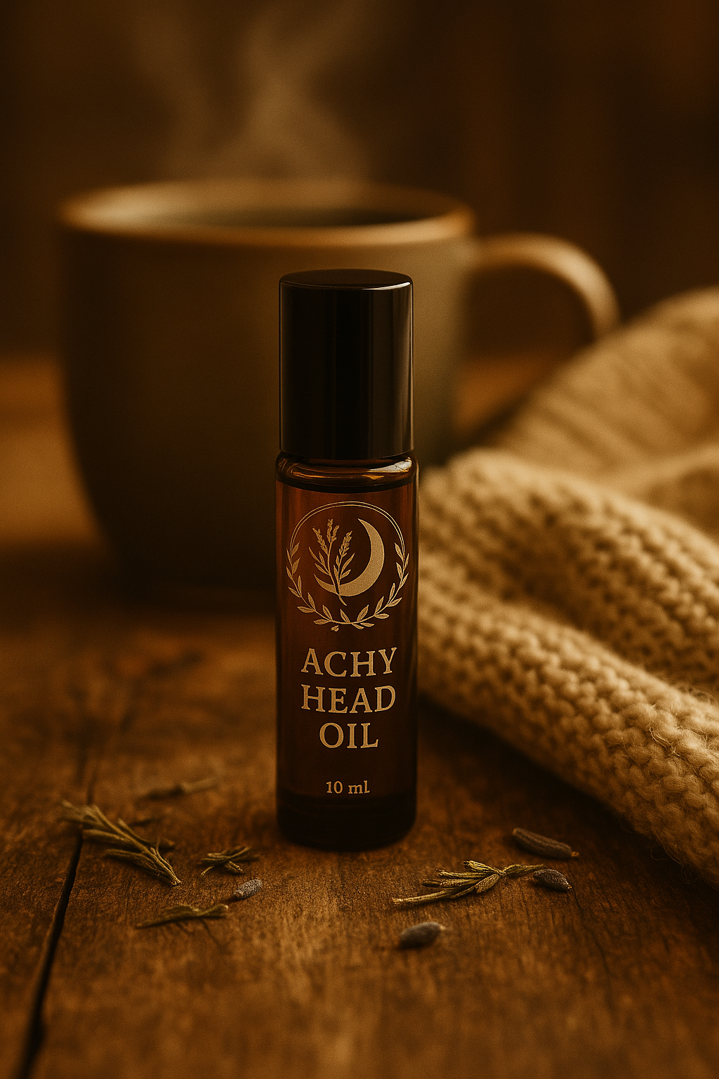 Achy Head Oil is handcrafted in small batches using thoughtfully selected herbs and plant oils traditionally used to ease tension and support moments of relief.