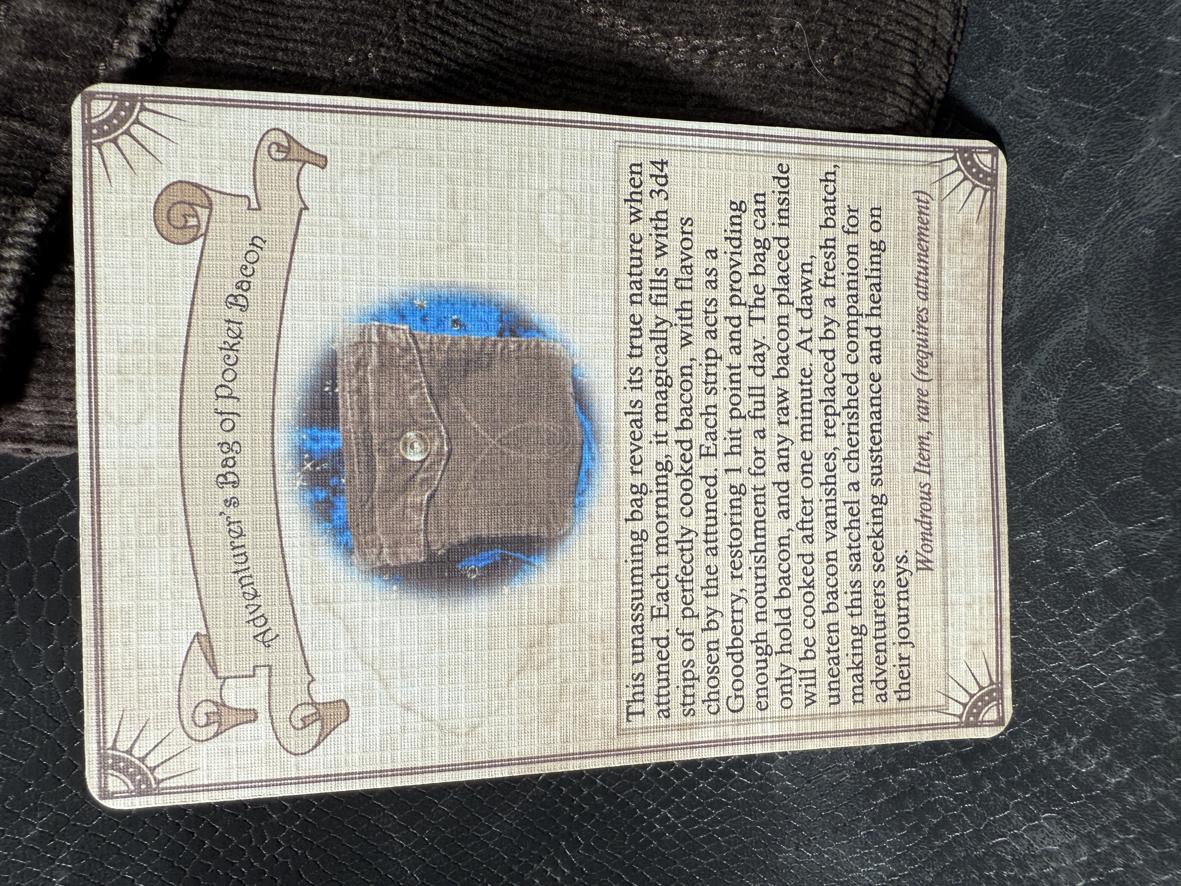 This unassuming cloth bag reveals its true nature when attuned. Each morning, it magically fills with 3d4 strips of perfectly cooked bacon, with flavors chosen by the attuned. Beyond its savory taste, each strip acts as a Goodberry, restoring 1 hit point and providing nourishment for a full day.