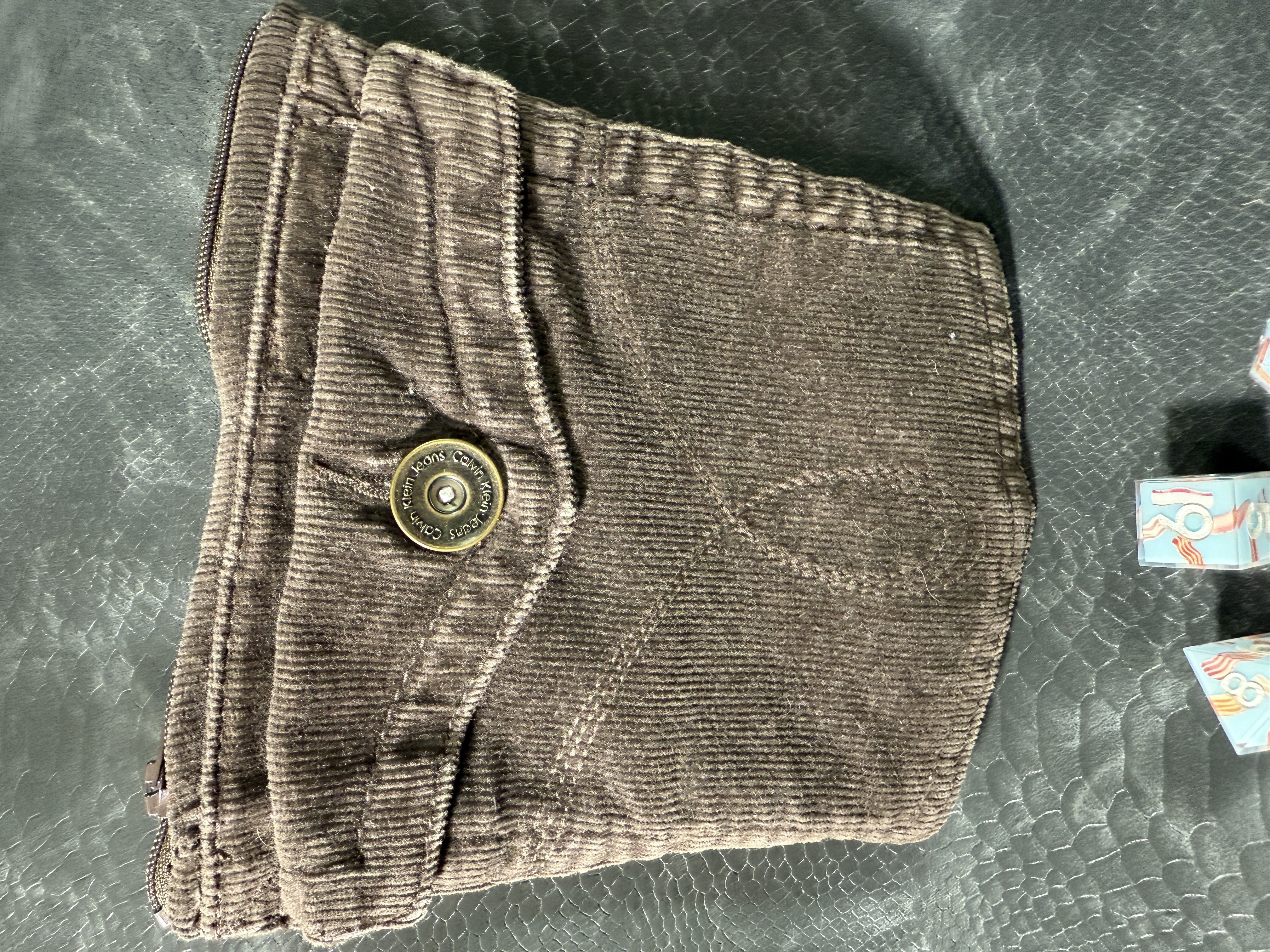 • Hand-stitched pouch crafted from the pocket of reclaimed corduroys