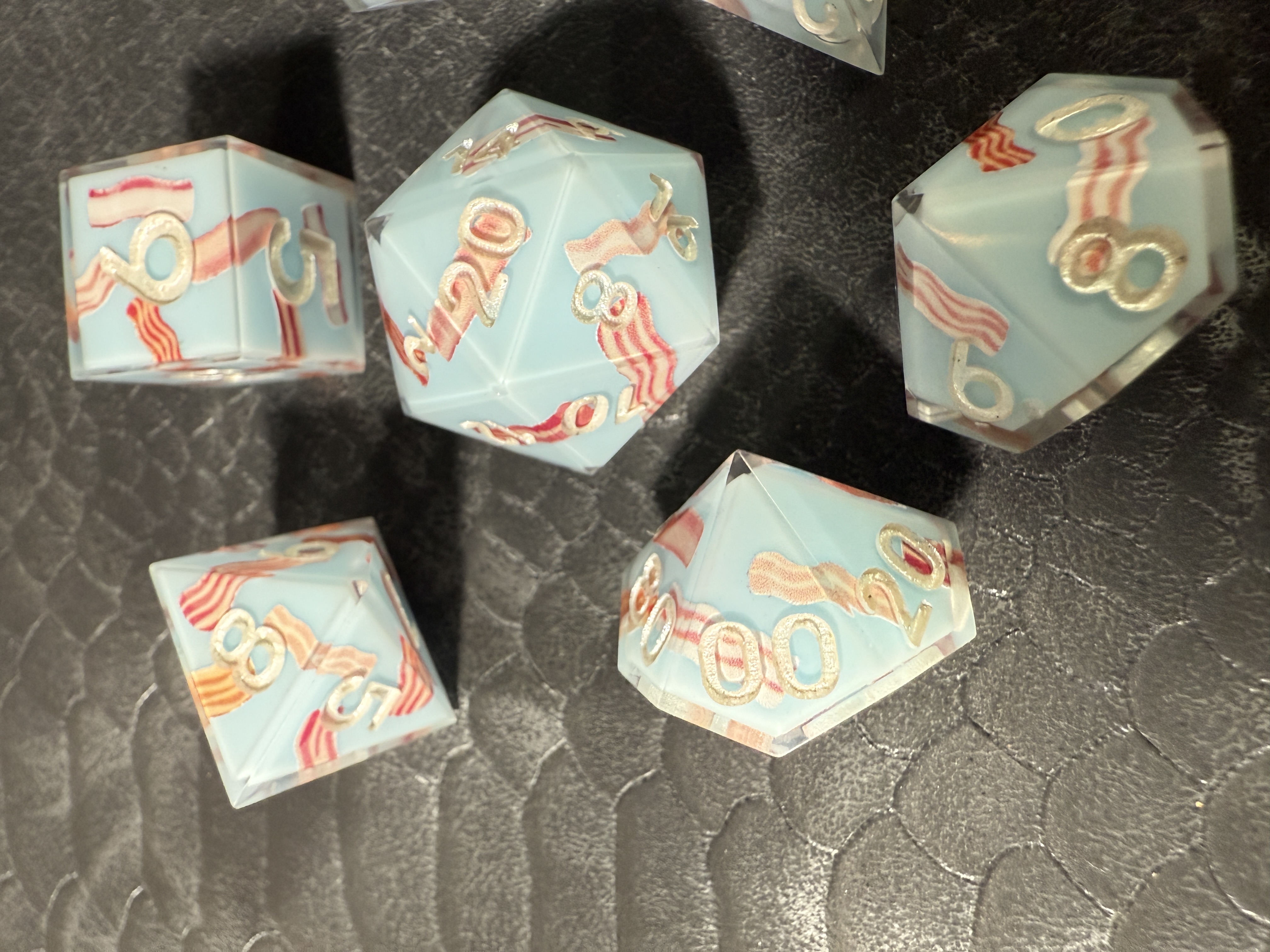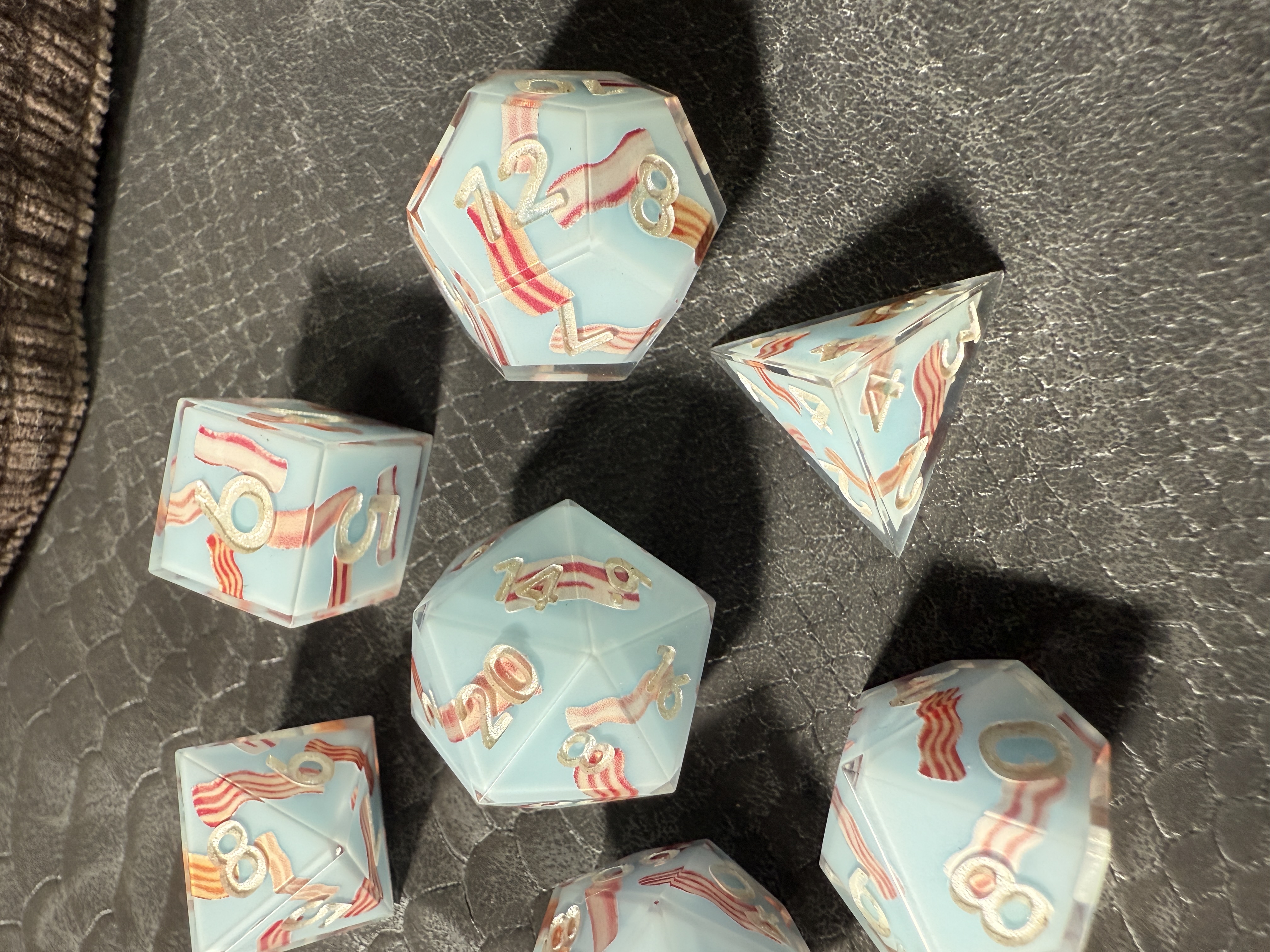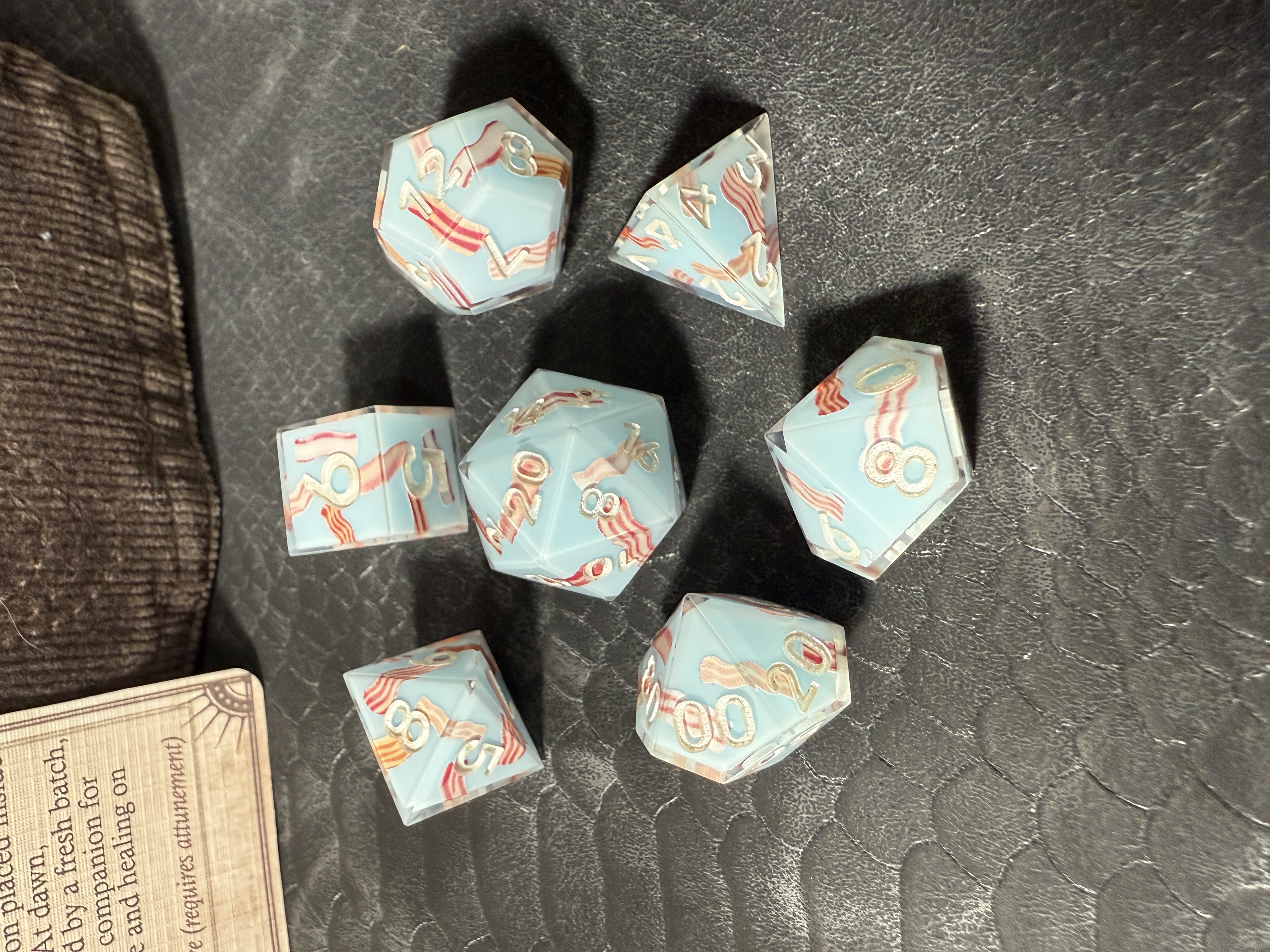 The bag itself is handcrafted from repurposed jean pockets, giving every satchel a rugged, well-traveled charm worthy of any hero’s pack. Inside, you’ll find a bacon-themed mini dice set (D4–D20), a playful nod to the enchantment within.