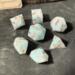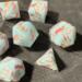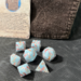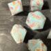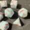 All of my dice are crafted from resin. I hand-pour the resin and add various alcohol inks and mica powders to create beautiful effects. My shell-type dice may include inclusions such as paper butterflies, moss, flowers, etc., and some have the inner shell wrapped in Washi tape. These dice are made using a double casting method (which requires two separate rounds in a pressure pot for 24 hours each): first, the inner dice are cast and a pattern or inclusion is applied, then a second casting of clear resin is done around the insert. The dice are then placed in a pressure pot for 24 hours to remove any bubbles. After curing for a few days, I sand off the excess resin. The dice are then polished in a tumbler with a polishing compound to give them a shine. They are cleaned with soap and water, and then prepared for inking. I hand ink each die, usually in a complementary color, using acrylic inks. Finally, they are polished by hand one last time.