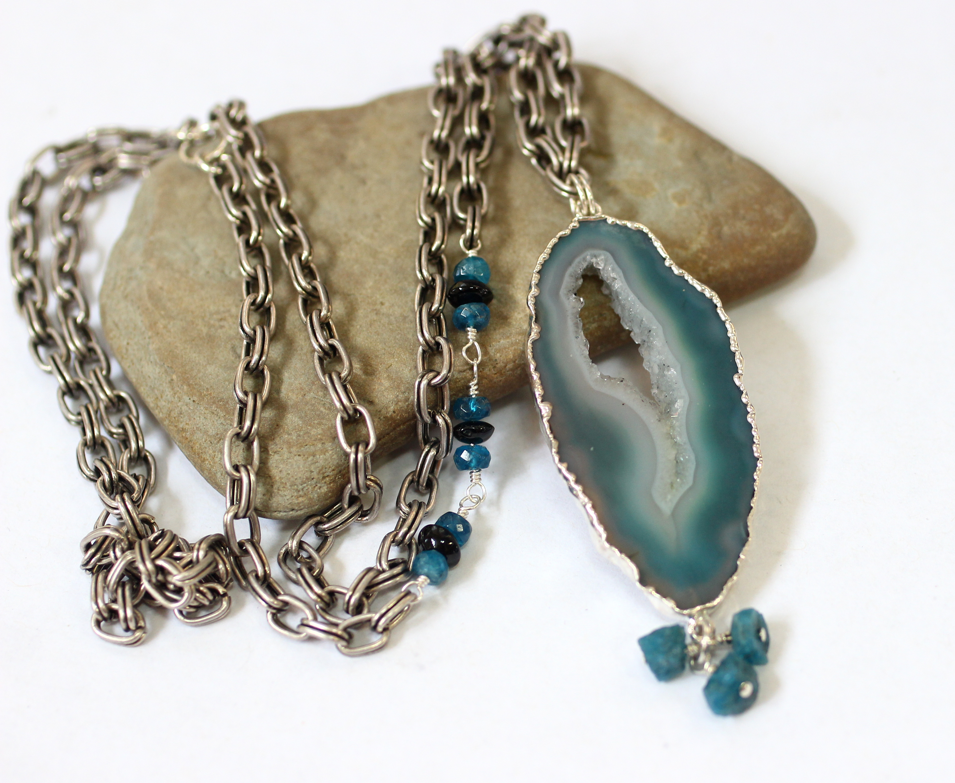 Popular and rich color in this teal agate slice necklace, featured on chunky silver chain. It would look wonderful with a tee or sweater. The agate slice showcases a shimmering druzy pocket and is electroplated in silver. Three raw apatite stones adorn the agate slice, all delicately wrapped in sterling silver. On the antique silver plated chain, accented stones complement the teal agate, including black spinel and teal apatite rondelles.