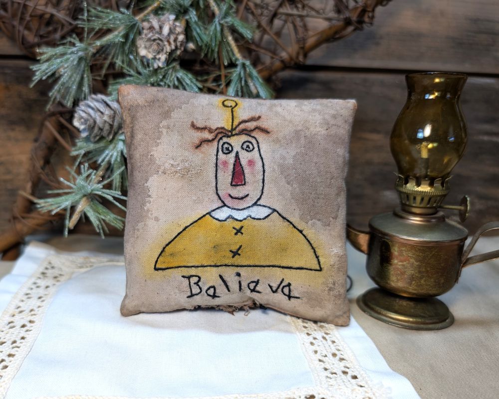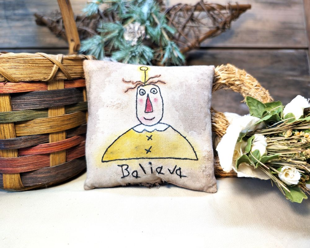 Enhance your rustic farmhouse decor with this charming 4-inch pillow featuring a believe angel design. It is hand-embroidered, painted and stained to look vintage and tattered. She's perfect for adding a touch of Christmas spirit to any room. Handcrafted with love to bring a cozy, farmhouse feel to your home. A great gift idea too!