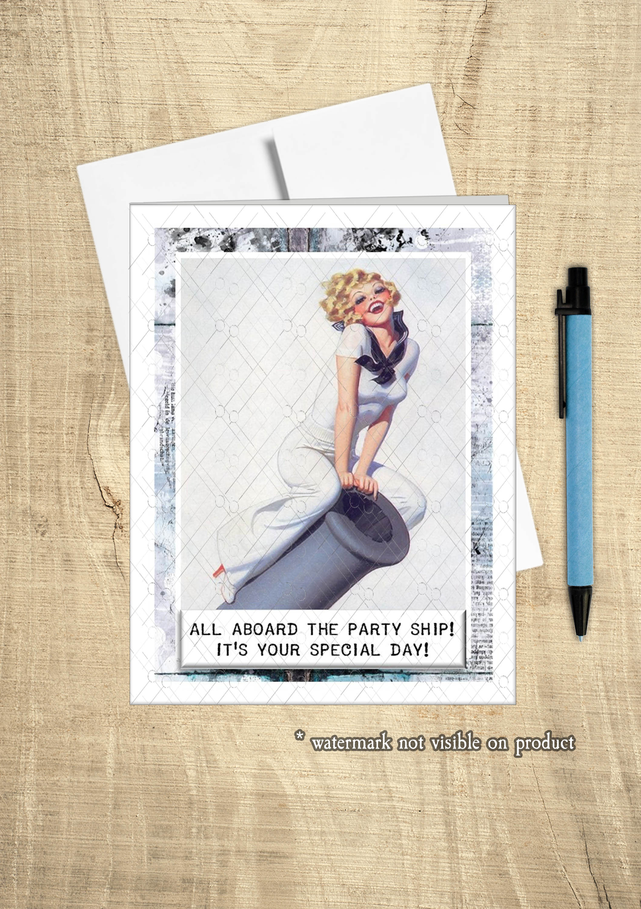 This sultry sailor is ready to celebrate your special day with nautical nonsense and full-throttle joy. Whether you’re turning 29 again or celebrating like it’s your last functioning knee—this card is the life of the party harbor.