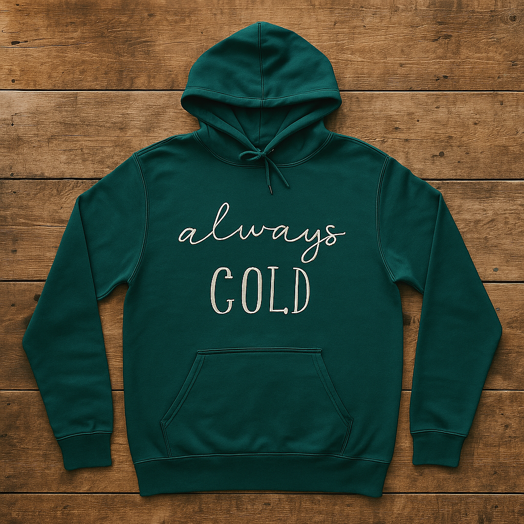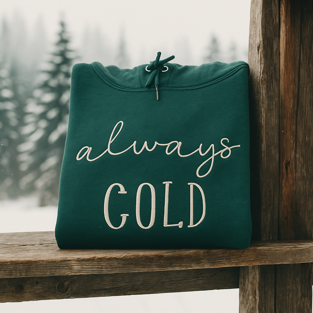 If “Always Cold” feels like your personal motto, this cozy embroidered hoodie was made just for you!