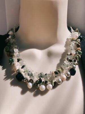 Natural matt finished Amazonite and cool Aquamarine adorning a delicately crocheted silver plated 28 gauge wire necklace. All stones are natural!