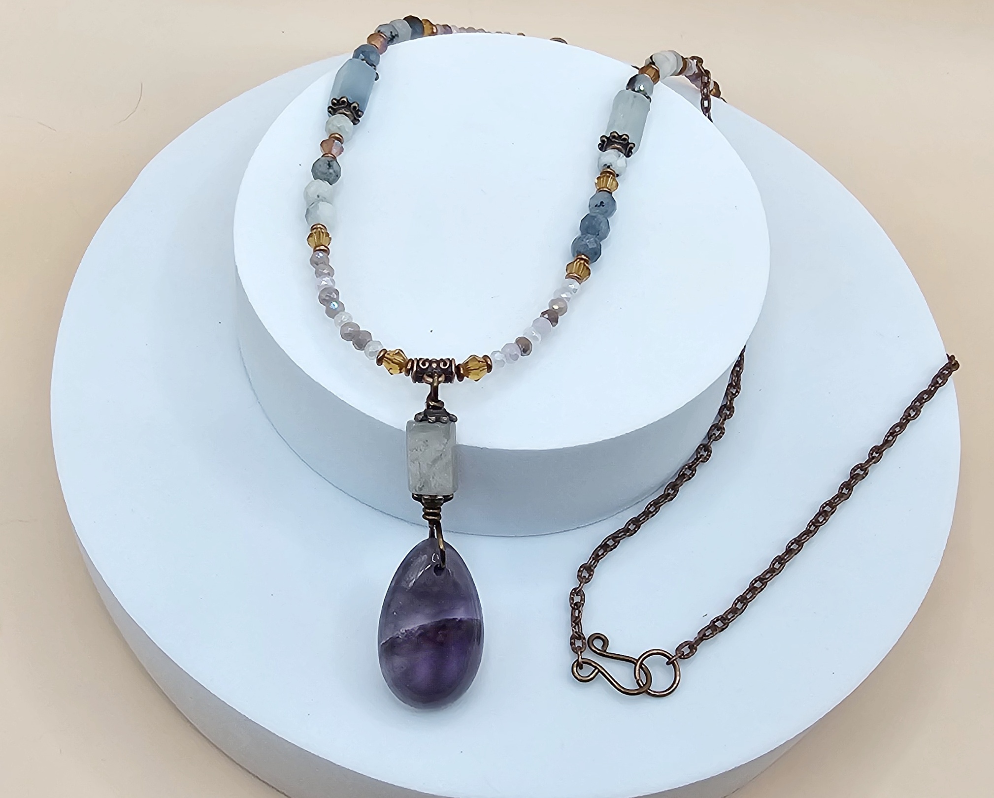 Materials: Amethyst, aquamarine, faceted aquamarine beads, crystals, copper accents, copper chain