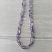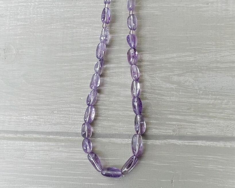 A choker style necklace made with tumbled and polished amethyst stones. The overall color is lavender which varies in intensity with the light. The beads show off naturally occurring inclusions.