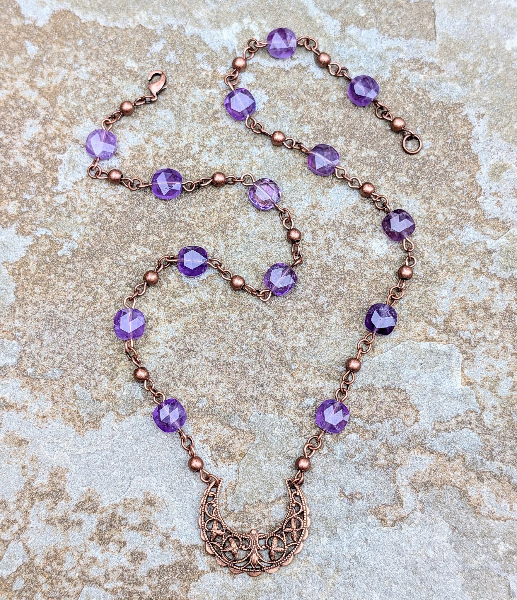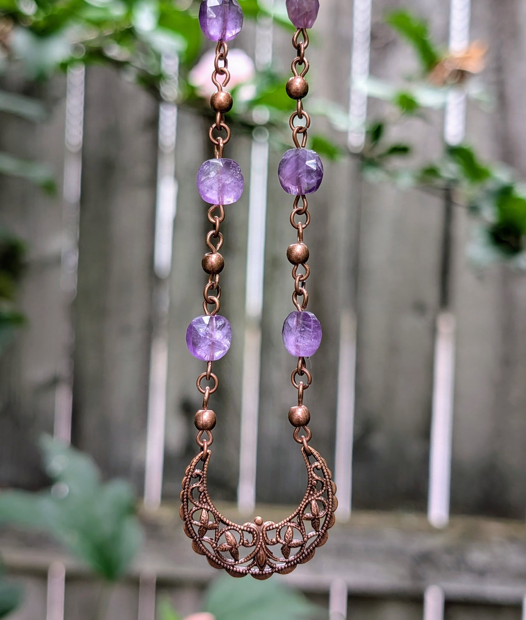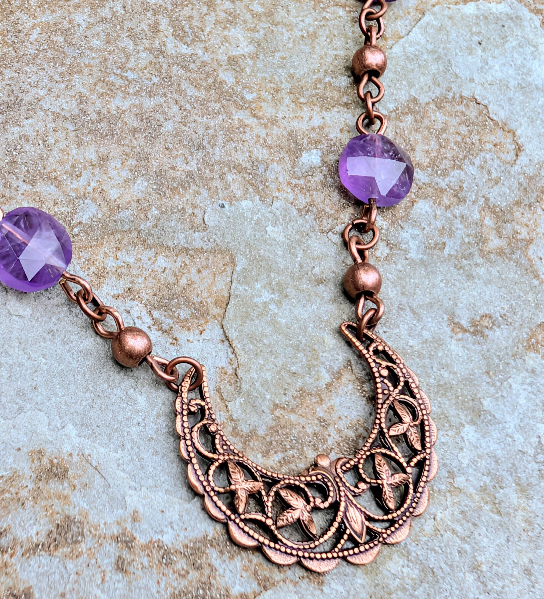 An ornate antiqued copper filigree crescent moon sits in the center of the necklace, with a beaded chain of 8mm square cut amethyst gemstone beads and small 4mm antiqued copper round beads in between the amethyst beads. Each amethyst and copper bead were fitted with handmade links.