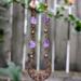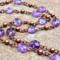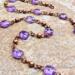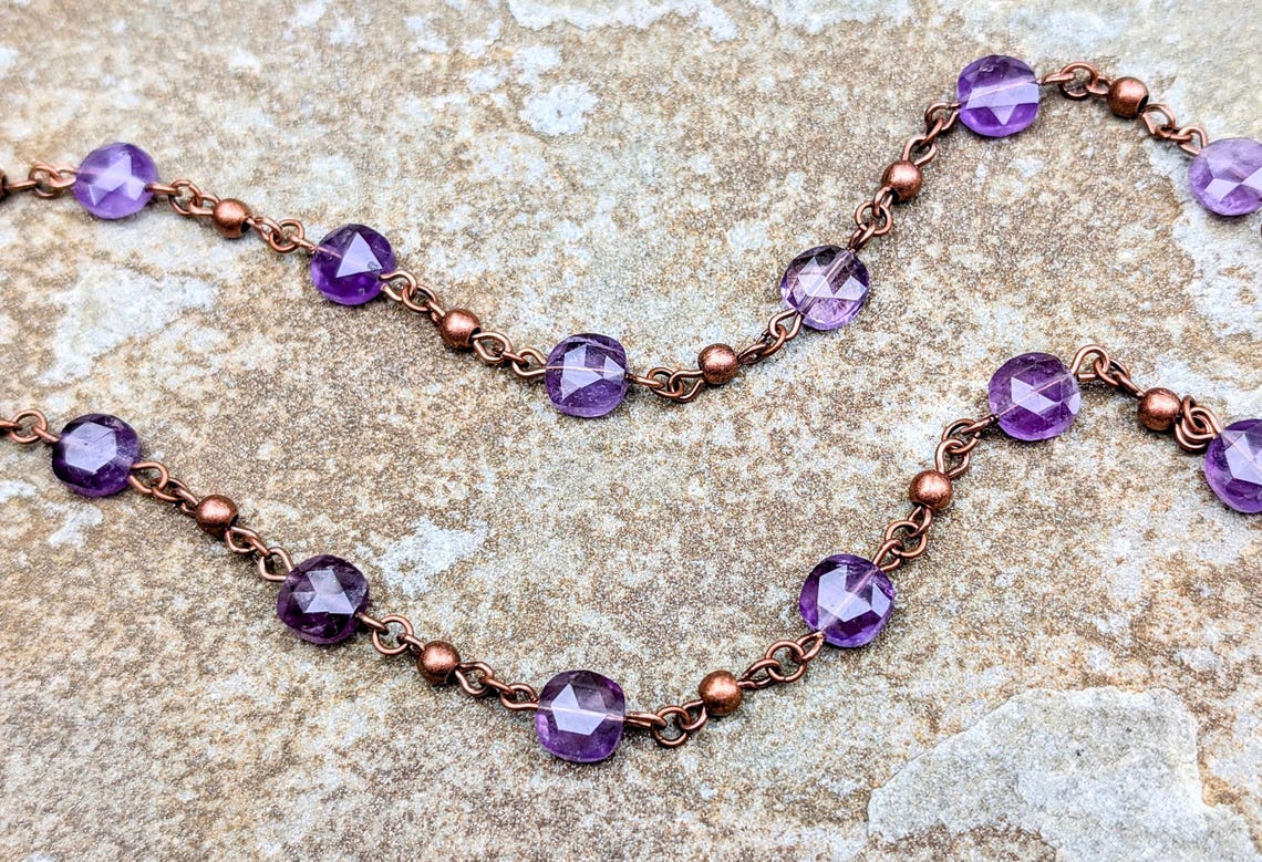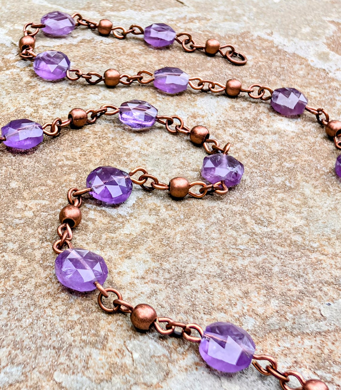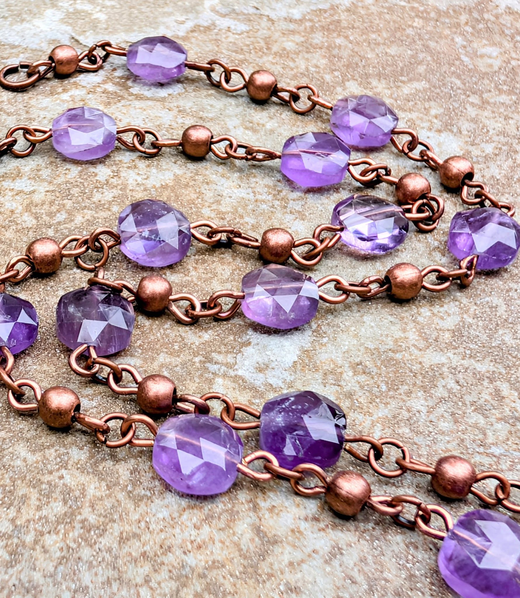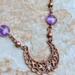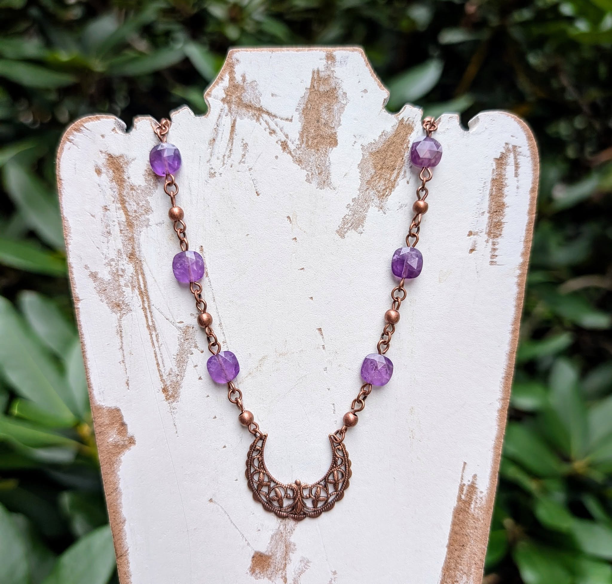An ornate antiqued copper filigree crescent moon sits in the center of the necklace, with a beaded chain of 8mm square cut amethyst gemstone beads and small 4mm antiqued copper round beads in between the amethyst beads. Each amethyst and copper bead were fitted with handmade links.