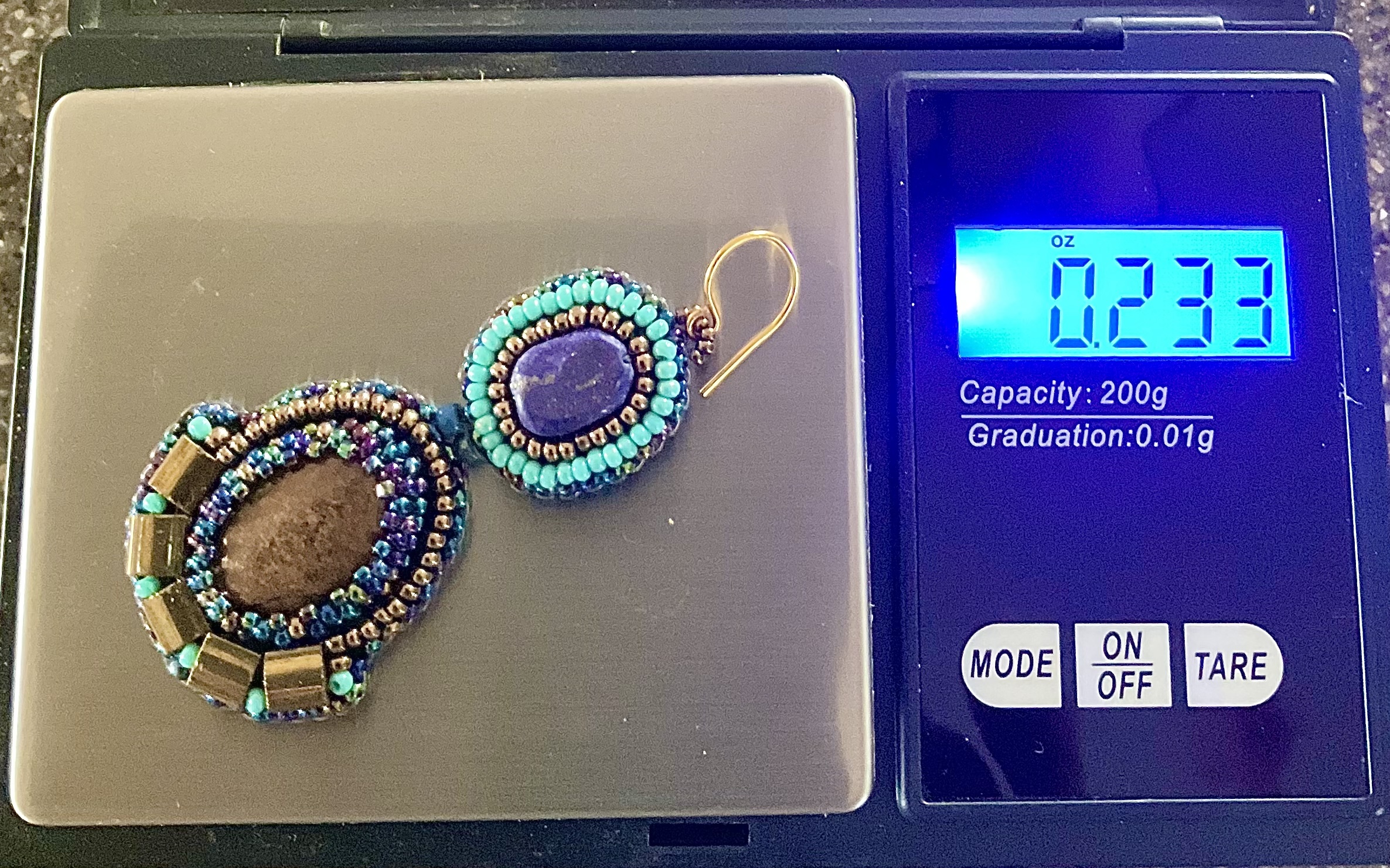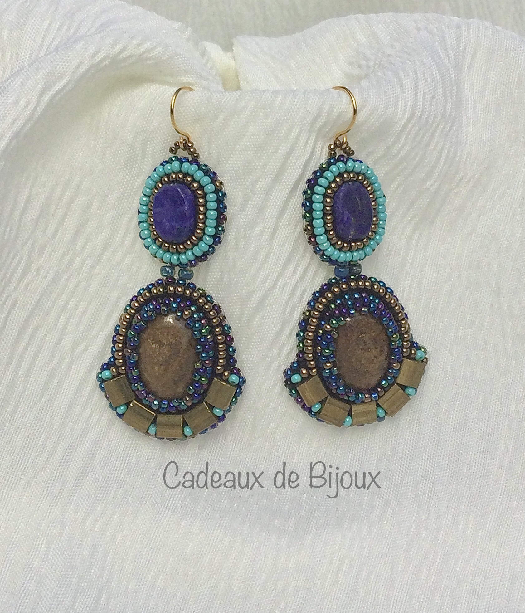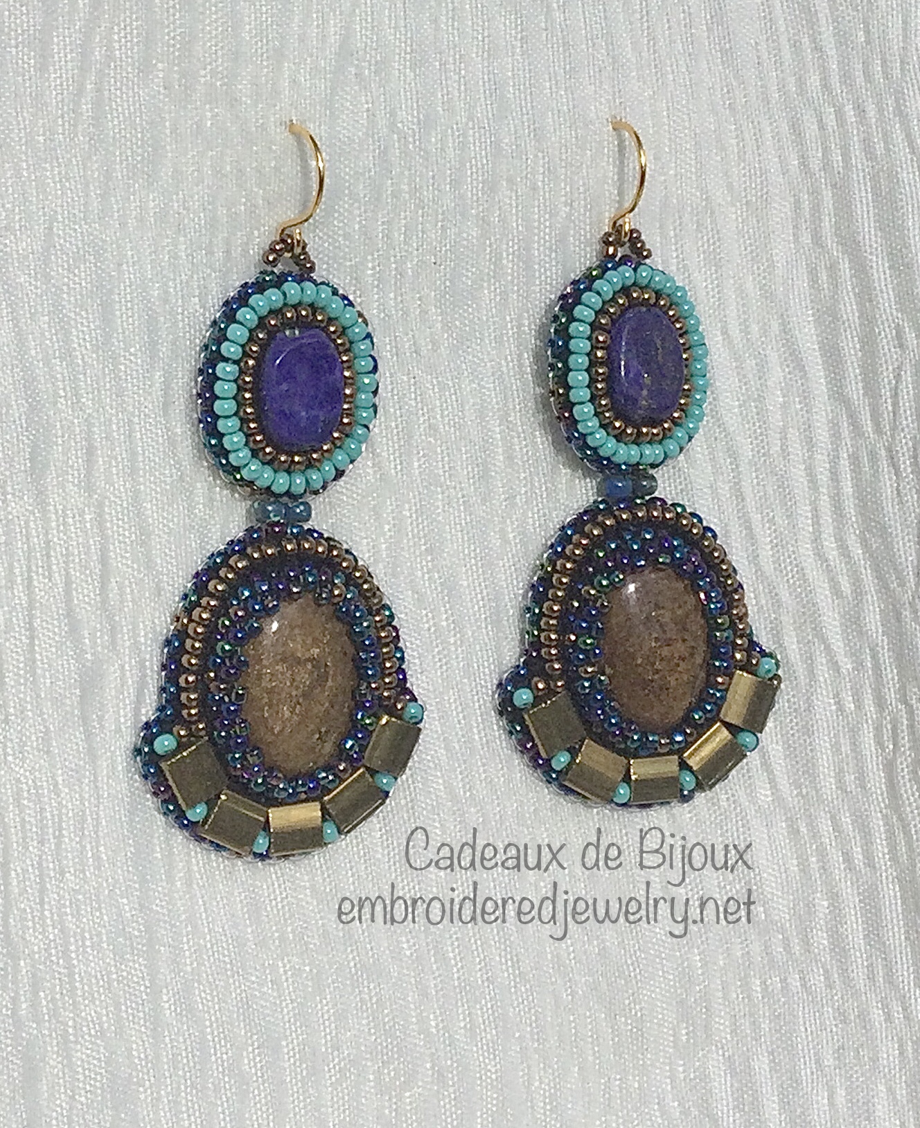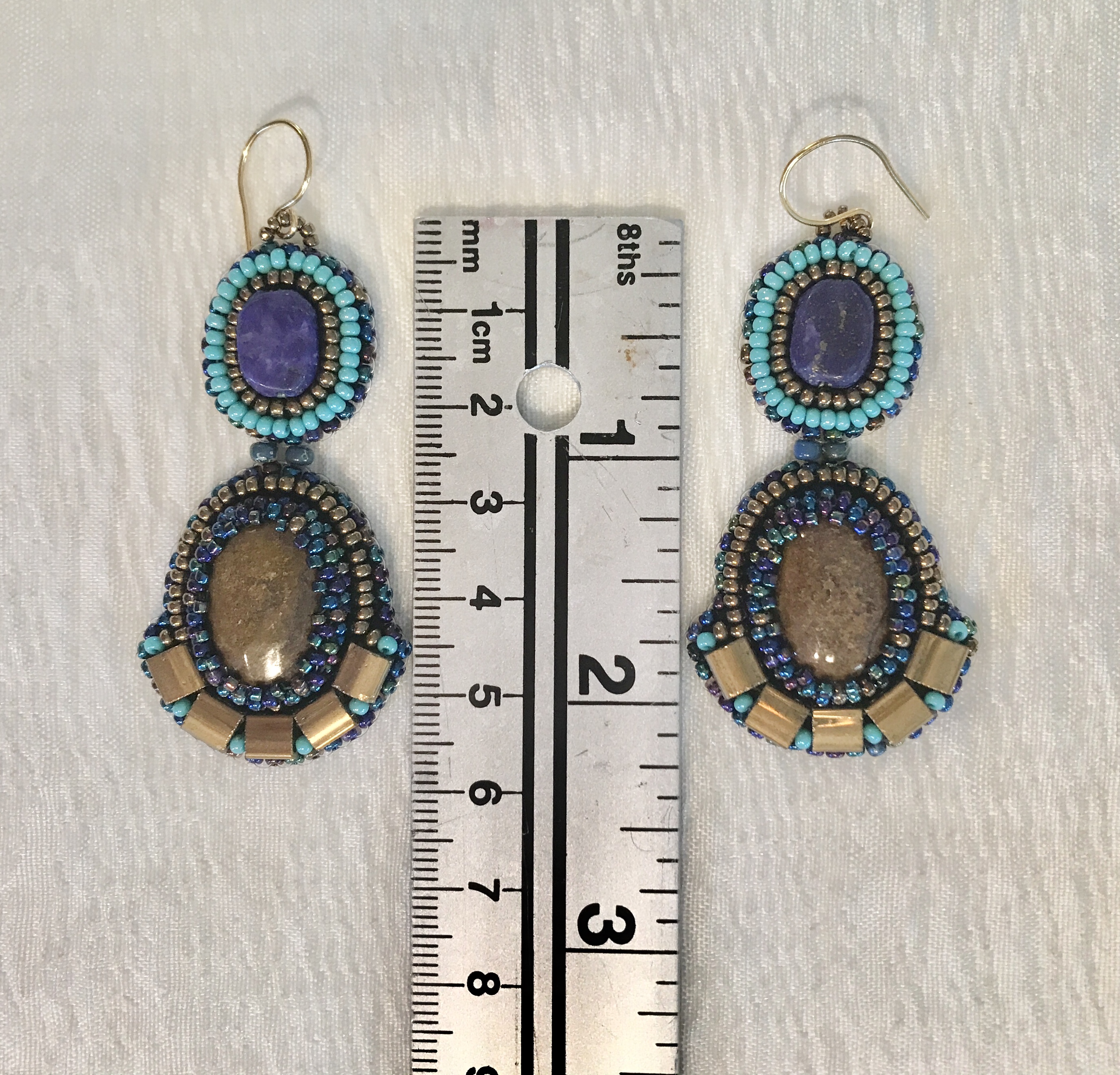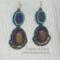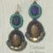 The central bronzite focal surrounded by bronze, turquoise and iridescent shades of blue bring to mind the discovery of an ancient treasure cachet lost long ago. Bronzite, lapis lazuli, Chinese, Czech and Japanese glass beads. earring drop is approximately 2.25" from ear wire. surprisingly light at 6.63g or .233 oz.