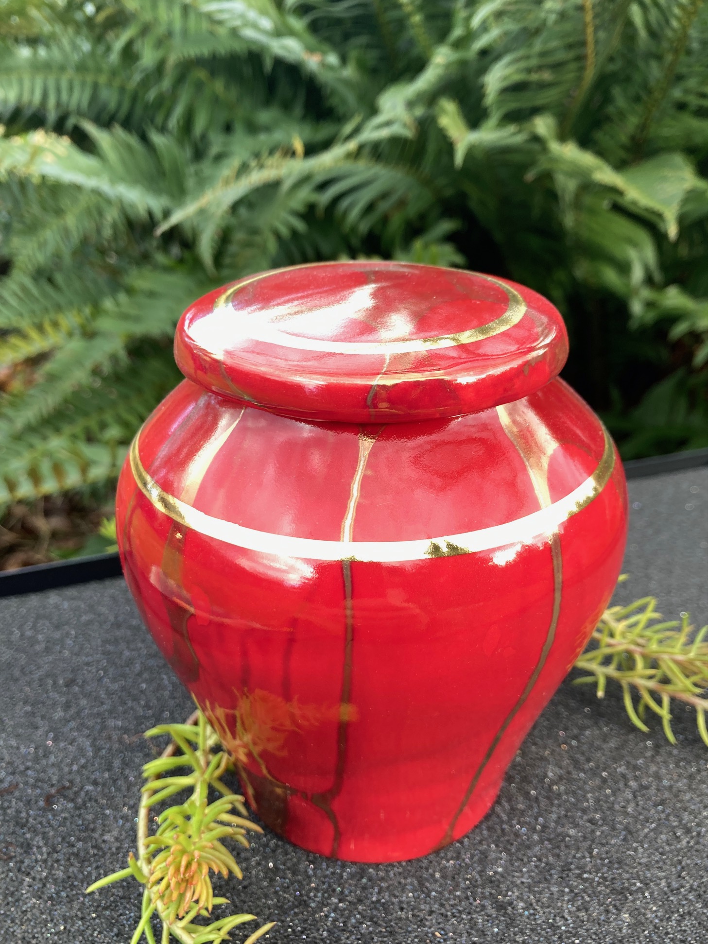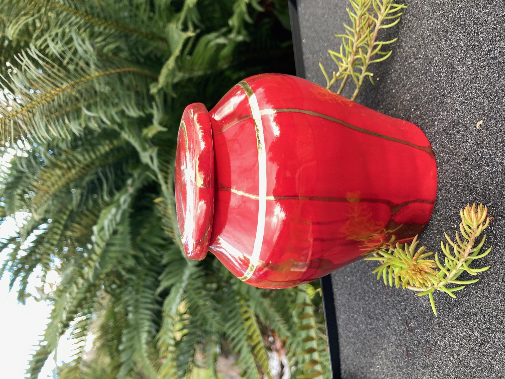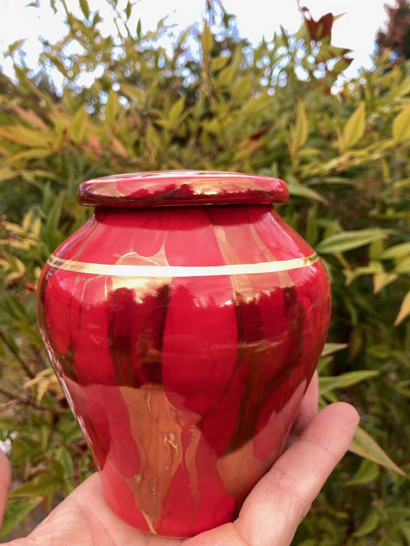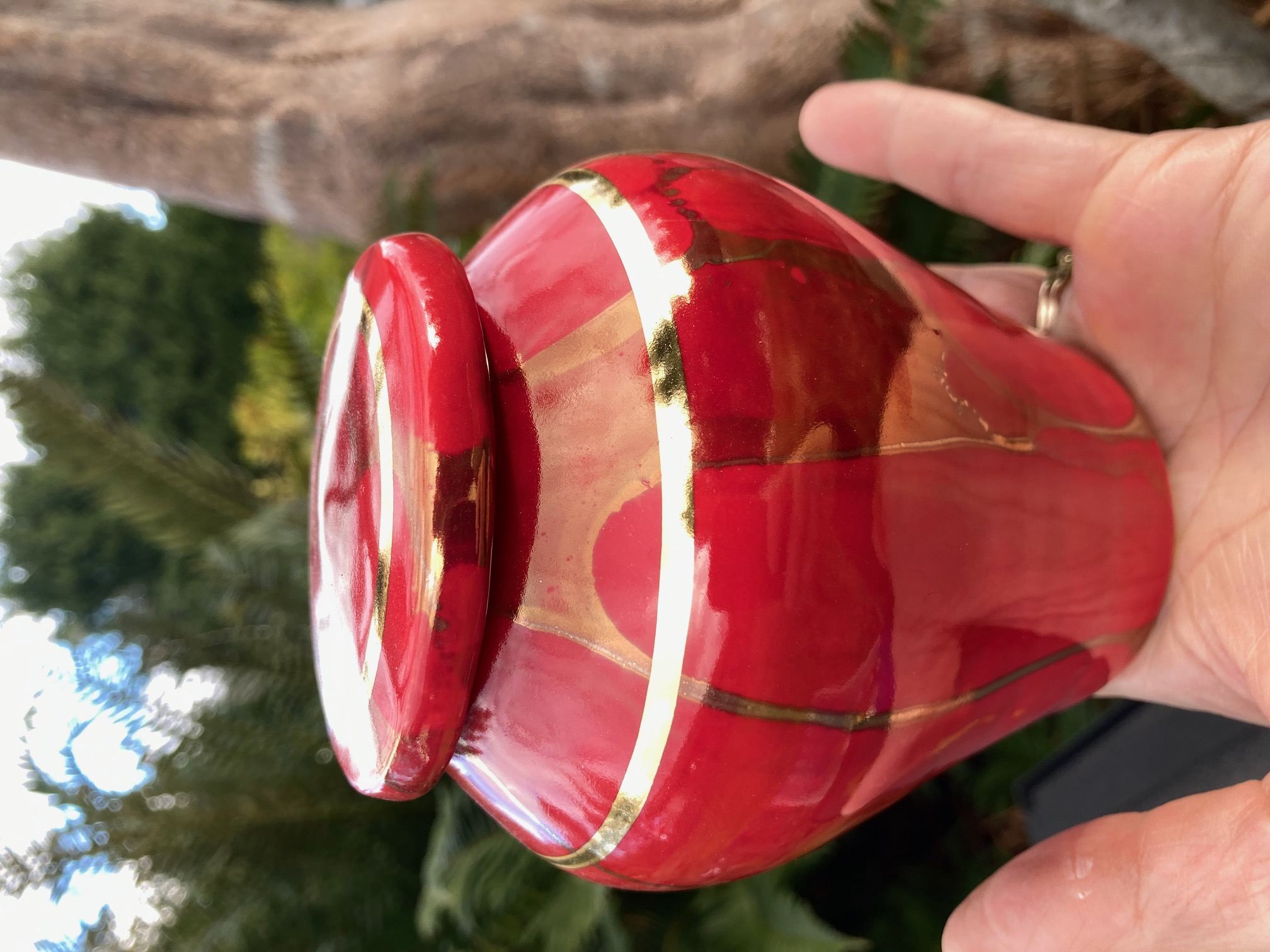 Our Urns are hand decorated with real precious metal lusters, then real 22 karat gold banding is applied by hand on the pottery wheel.