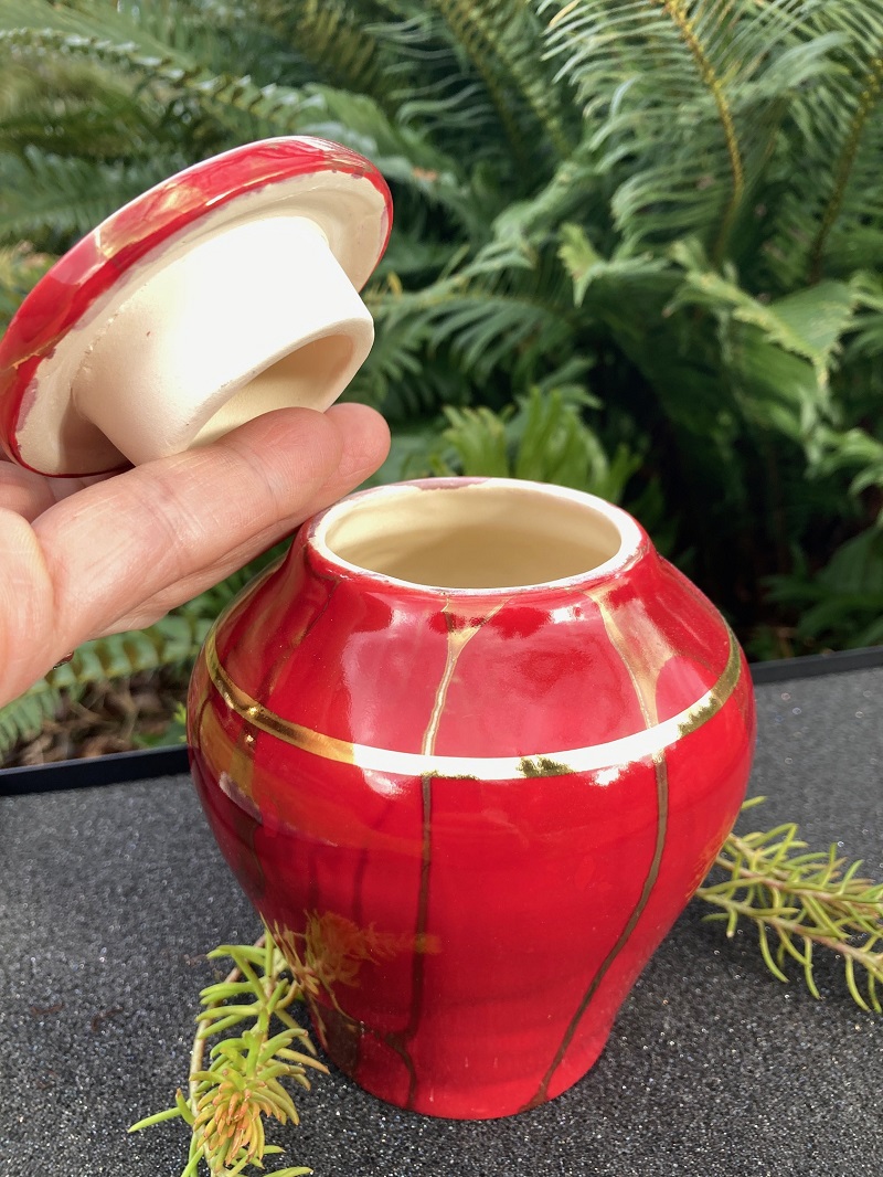 As of now, we create the lids with a flange that fits inside the mouth of the urn preventing it from sliding off, and we leave the raw clay contact points on the lid exposed so that with a few twists of the lid you can get it to seat firmly and airtight.