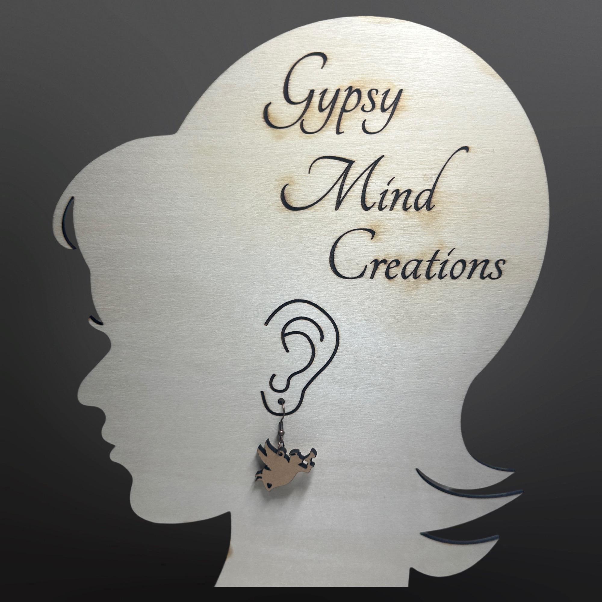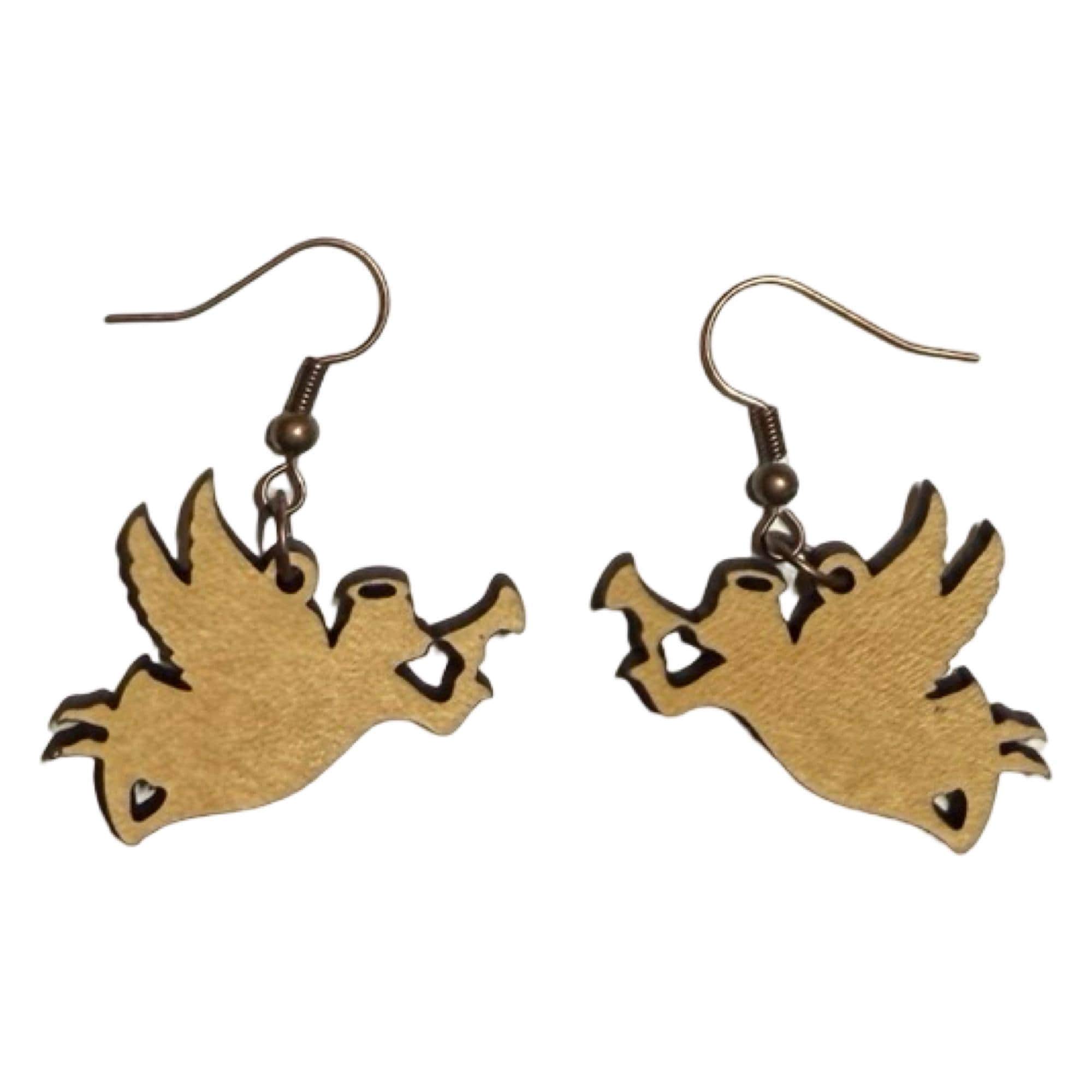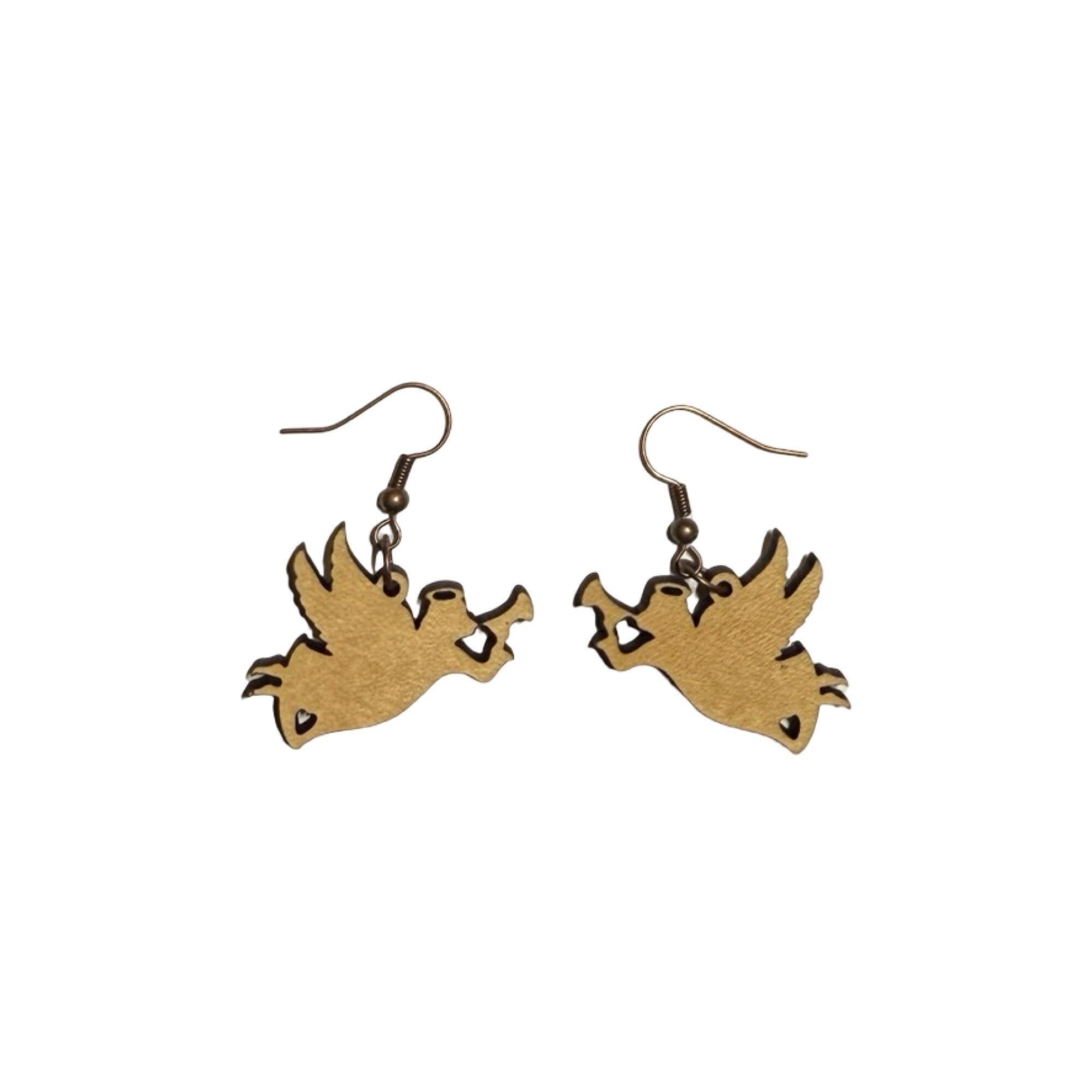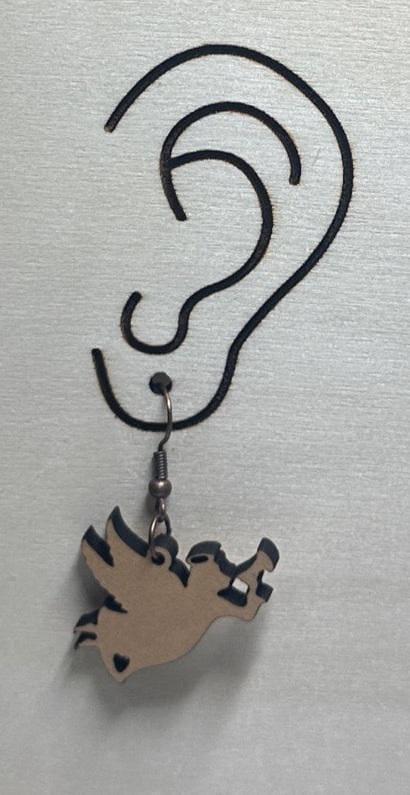 These are a pair of laser cut lightweight angel wood dangle earrings. They are made from 1/8 in thick medium maple plywood. They are on ear wires. All metal components are silver, gold, or brass plated, or black alloy, nickel & lead free, and hypoallergenic. They are approx. 1.25” in long. Backs not included but available upon request.