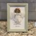 This beautiful angel was made with a locally-sourced oyster shell for her body, a solid wooden ball for her head, Spanish moss for her hair, genuine copper wire for her halo, sheer wired white ribbon for her wings, a white ribbon and a faux pearl for her bow, and inspirational words printed on the heavy cardstock for the backing. The frame is a very pale green with silver highlights.
