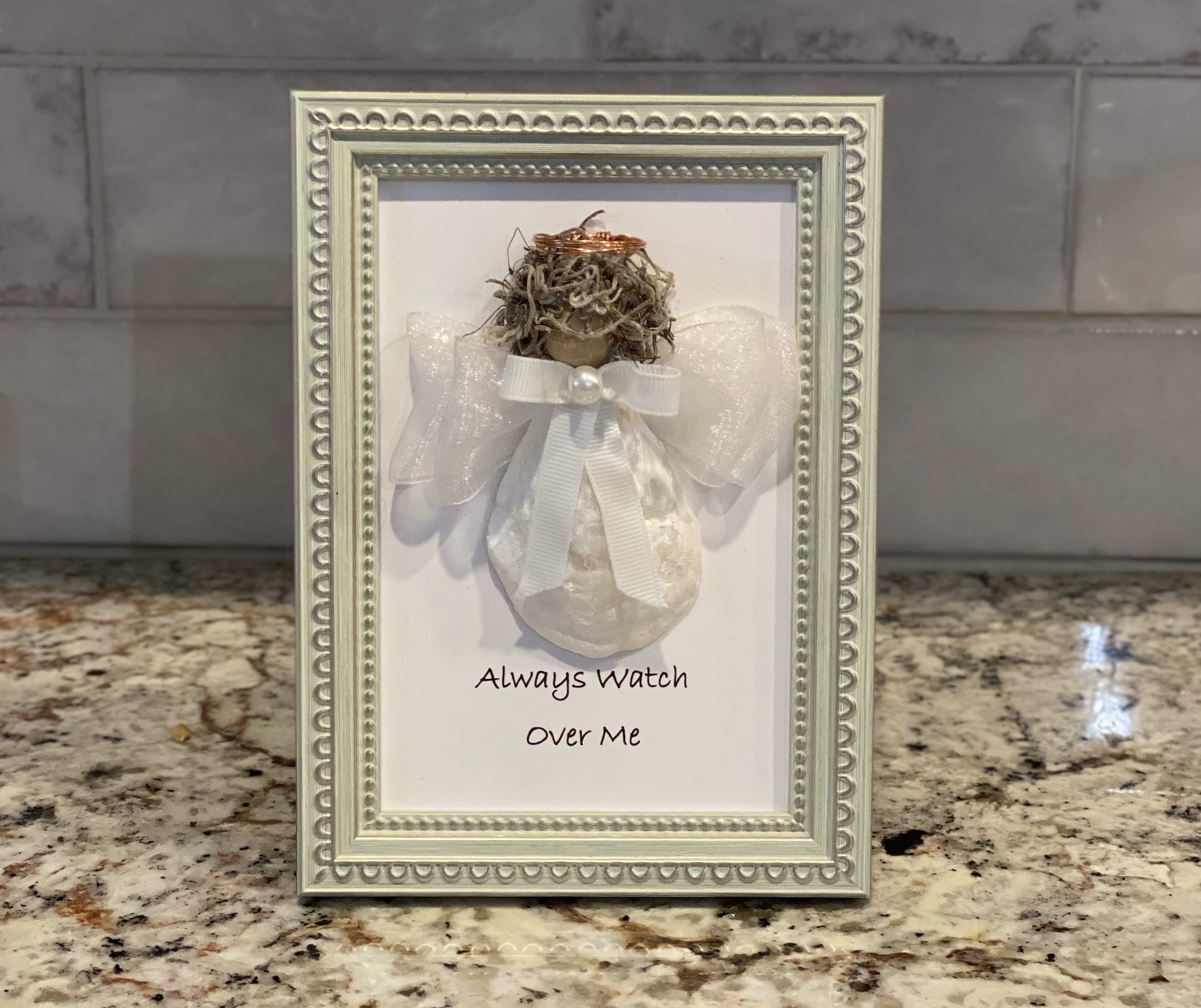 This is a handmade picture that measures 5" x 7". I used a wooden decorative frame with an easel back. The angel is made from a locally-sourced oyster shell; her head is a wooden ball with Spanish moss for hair. She has a copper hand-formed halo, sheer white ribbon wings, and a white ribbon bow with a faux pearl accent. The words "Always Watch Over Me" are printed on the heavyweight cardstock background. This makes a beautiful & unique gift of encouragement.