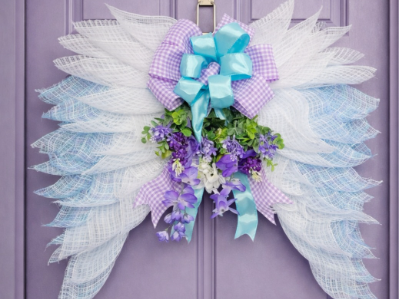 Details: • Handcrafted with premium deco mesh • White and soft blue angel wing design • Lavender and blue bow with floral accents • Lightweight and easy to hang • Ideal for indoor or covered outdoor display