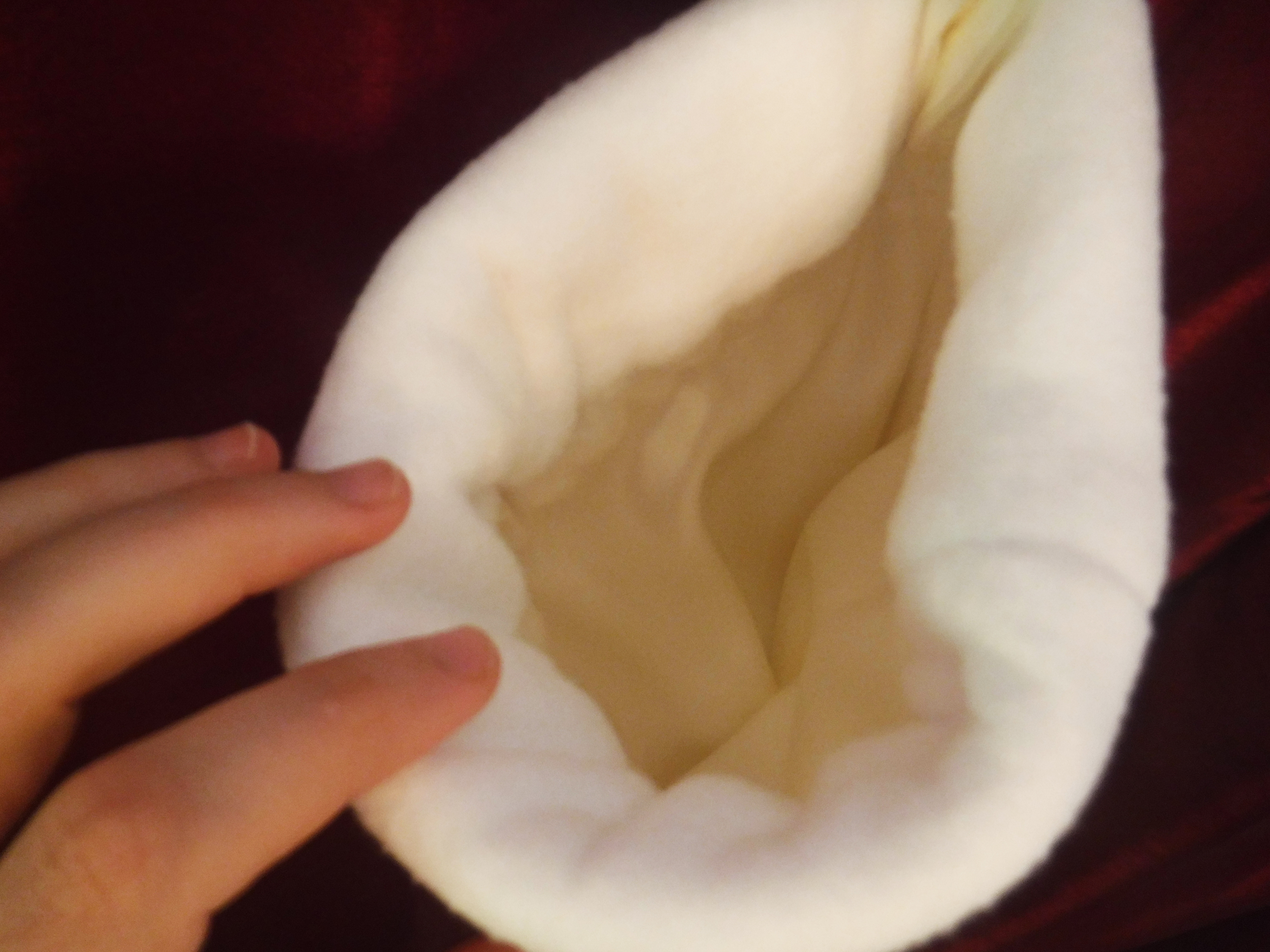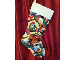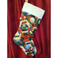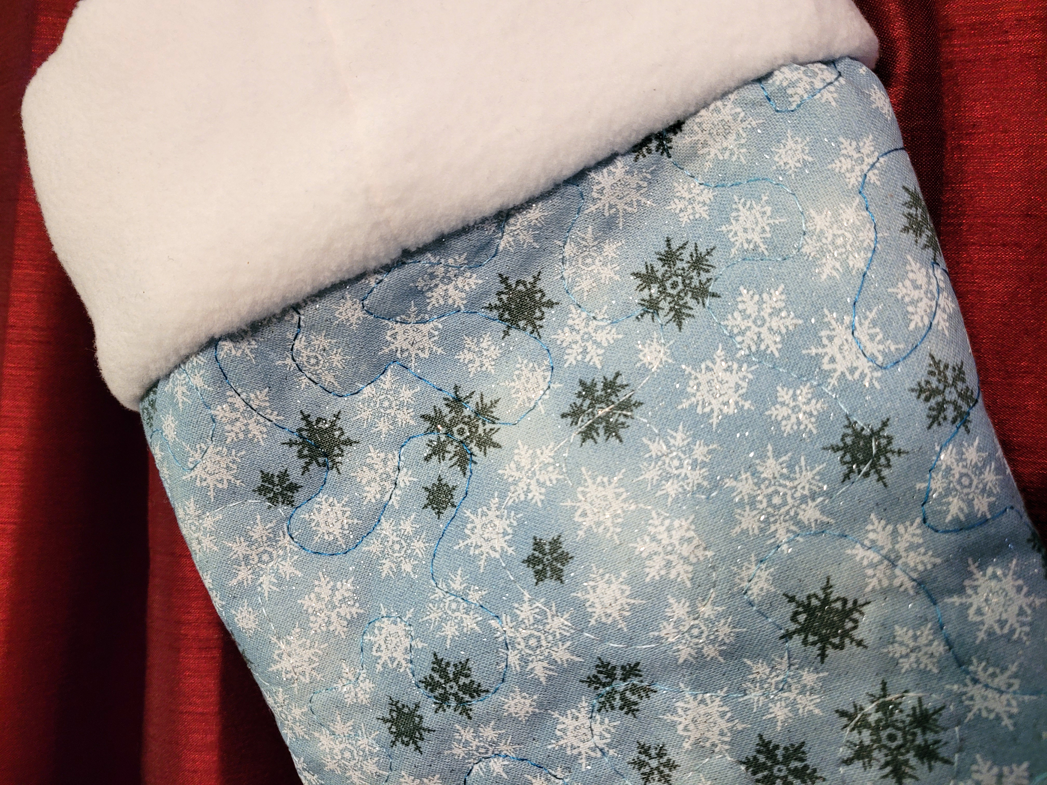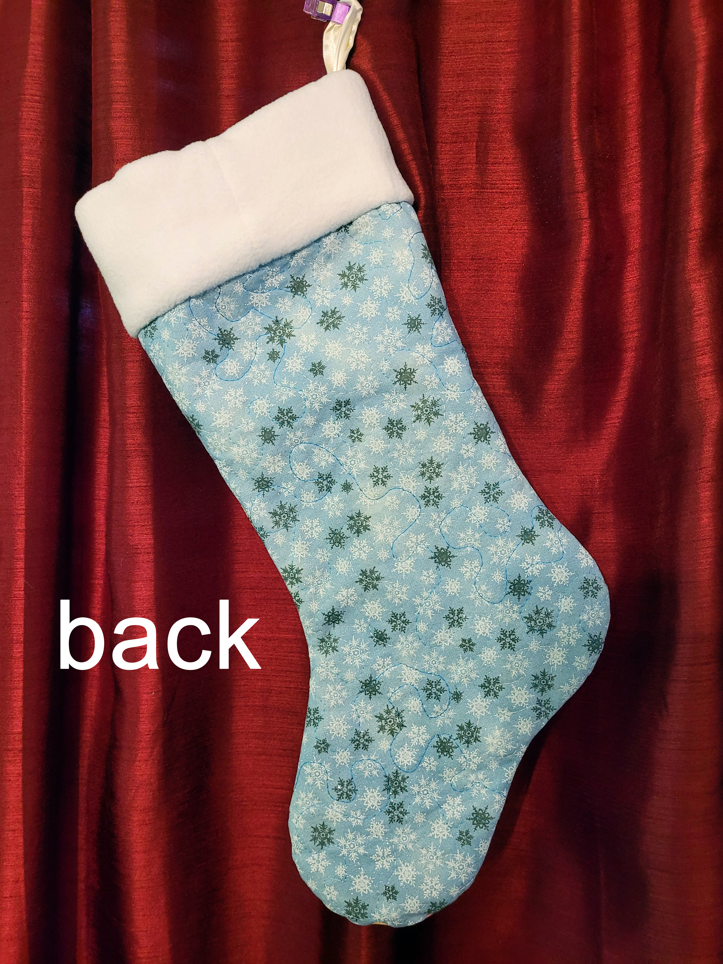 Quilted in multicolor thread. The back is a Christmas fabric. The inside is a cream, smooth satin-like lining. The top features a plush-like white trim. Small loop attached for easy hanging.