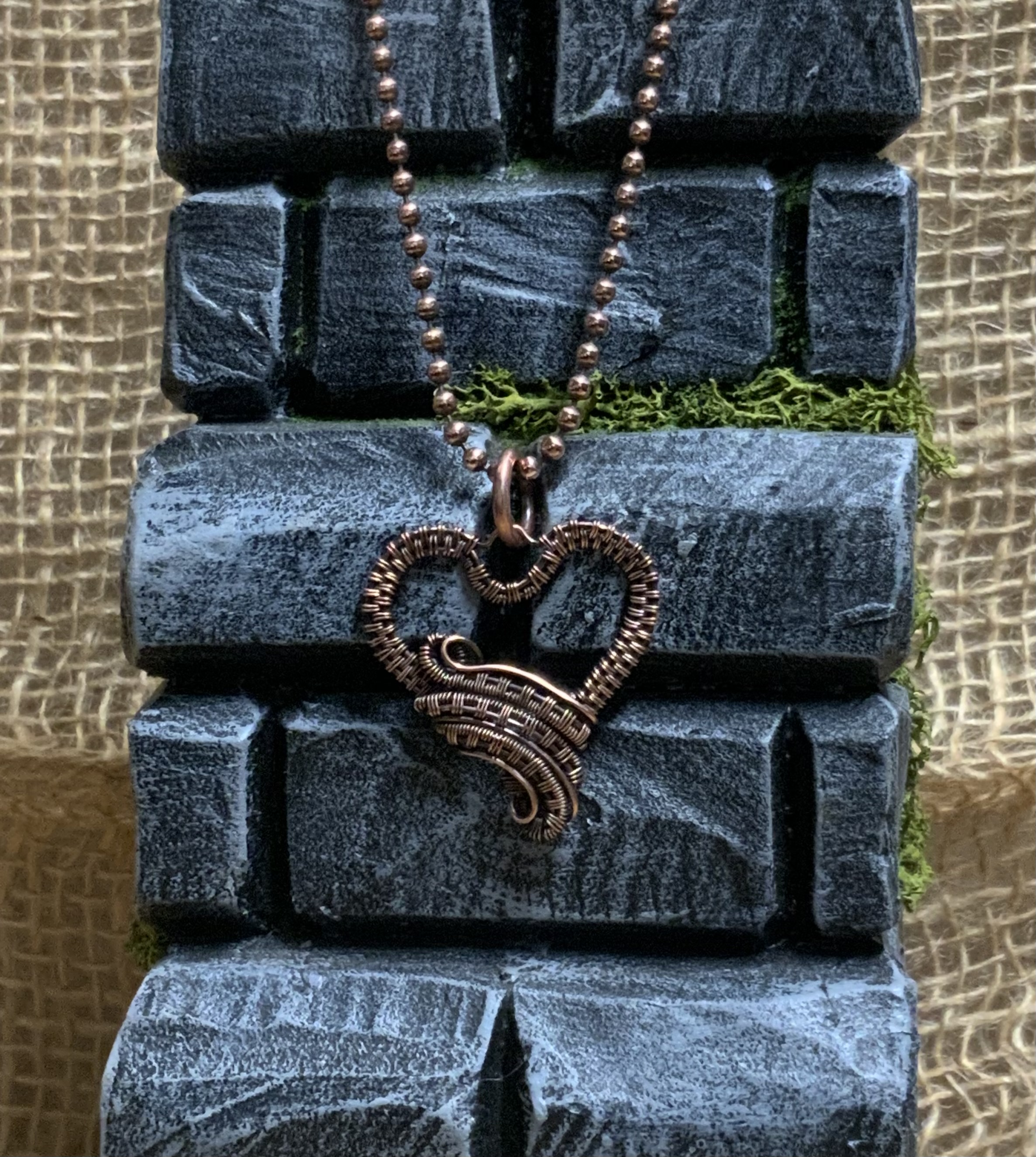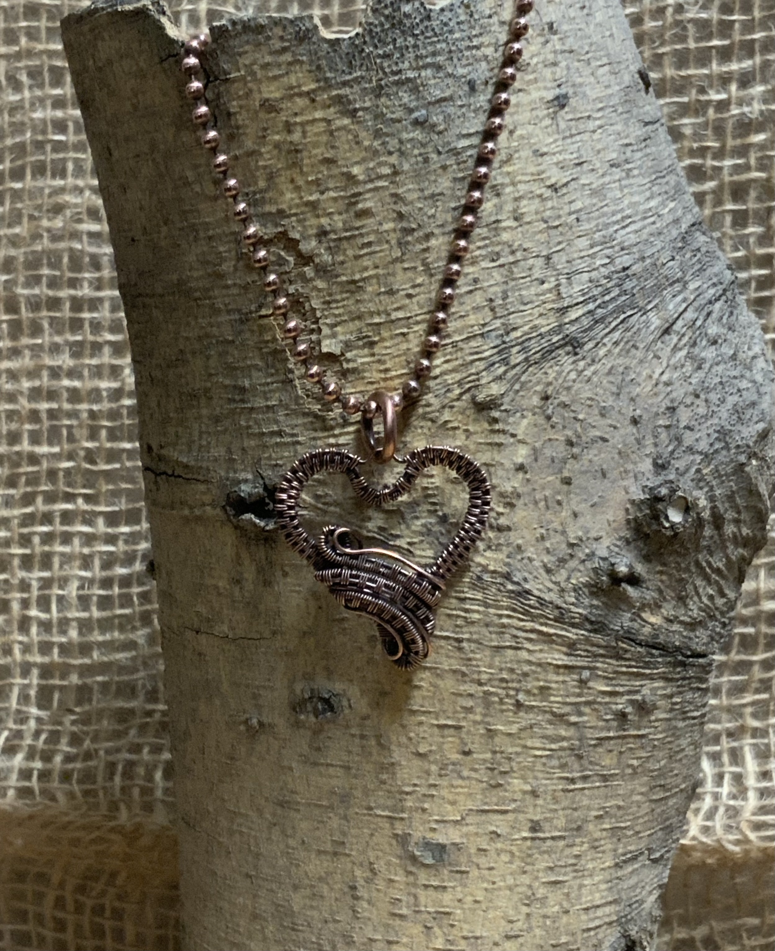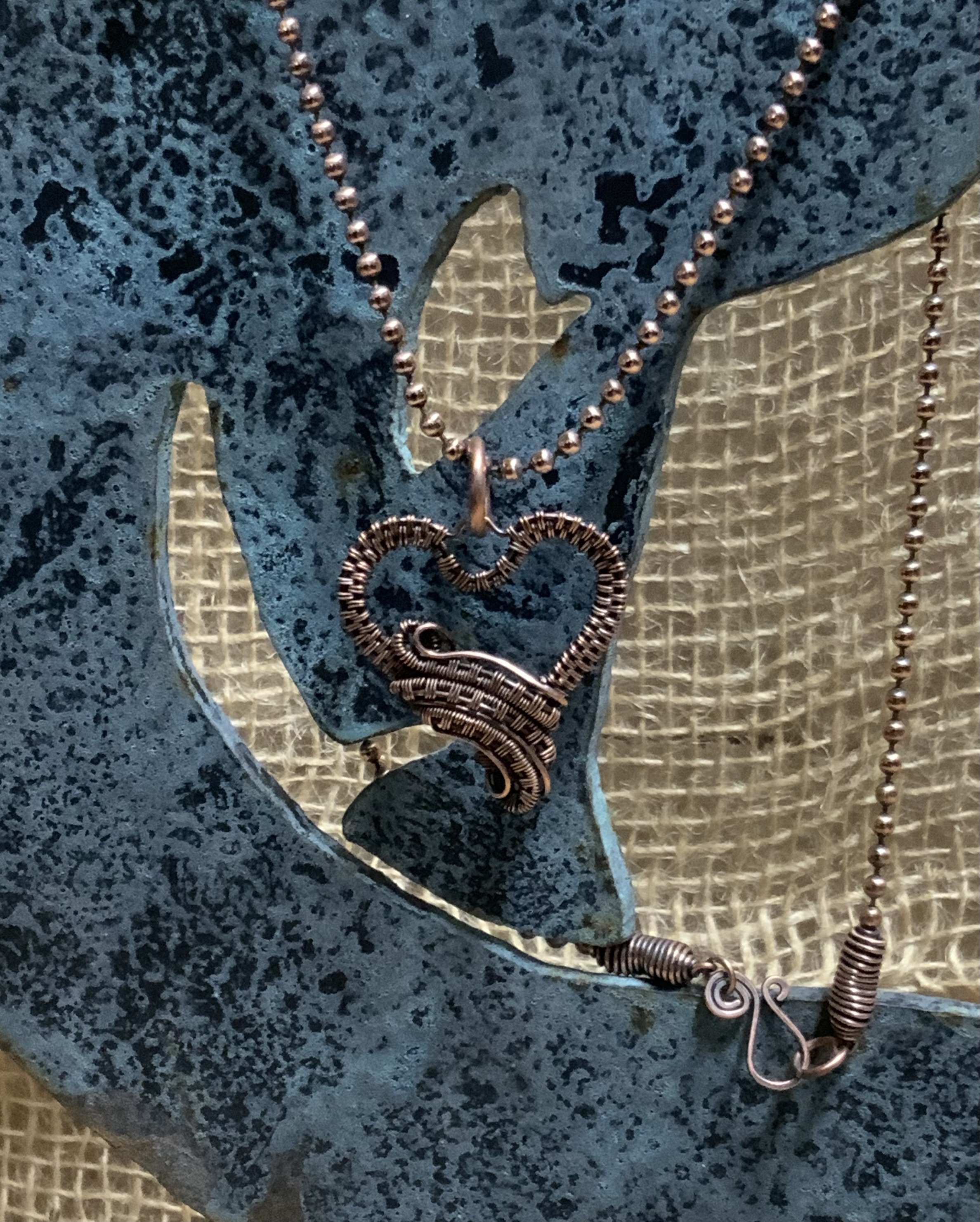 The heart pendent is a wire wrap piece. It is wrapped with bare copper 22ga wire, which gives the heart shape a more delicate look. The pendent is then patined to give it that antiqued look. The copper ball chain is hand cut from a spool at 18” not including the handmade clasp, giving the chain a total length of 19”. The original design is a tutorial by Nichole Hanna Jewelry.