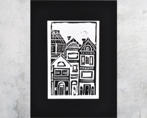 This Apartment Buildings linocut print is vibrant and takes you to life in the city! Unique buildings styles and colors. Great little original art piece to have.