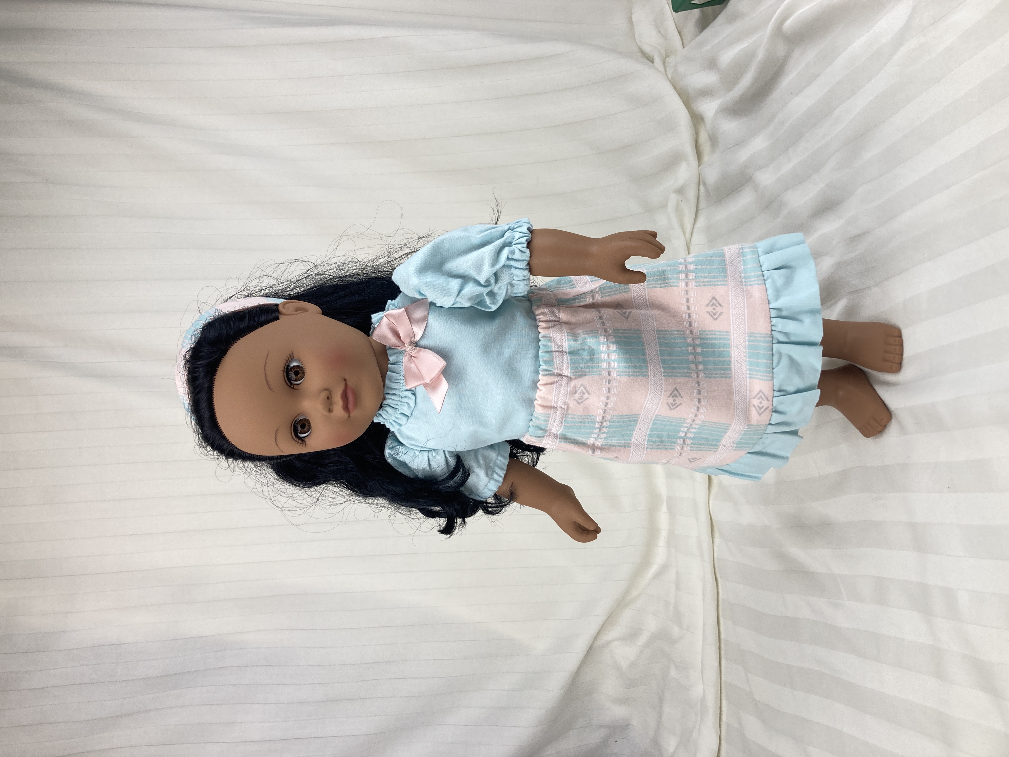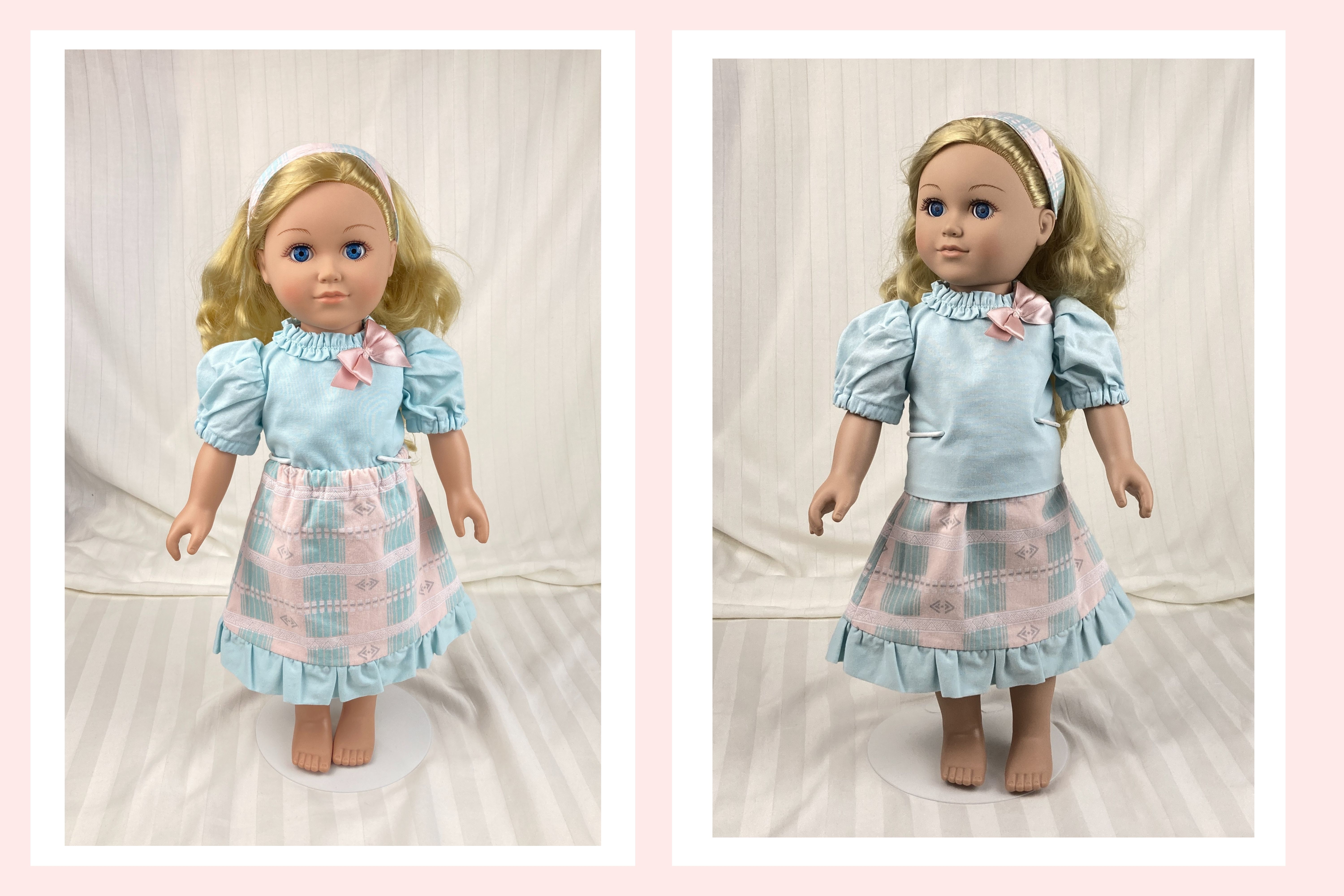 This is a handmade, three piece outfit for 18 inch dolls. The skirt is made from a cotton fabric that has a southwestern-gone-feminine feel to it with the print across it being done in aqua, white, pale gray, and peachy pink colors. The skirt is lined and has an elastic waist and falls mid-calf, ending in an aqua ruffle along the hem. The shirt/top has a hook and loop closure in the back and is made from an aqua cotton fabric. It has puffed sleeves and a ruched type collar that acts almost like a turtleneck. A medium pink ribbon bow perches on the left side of the color adding a distinctive feminine touch. Shirt is lined. The headband is made from the same fabric as the skirt.