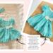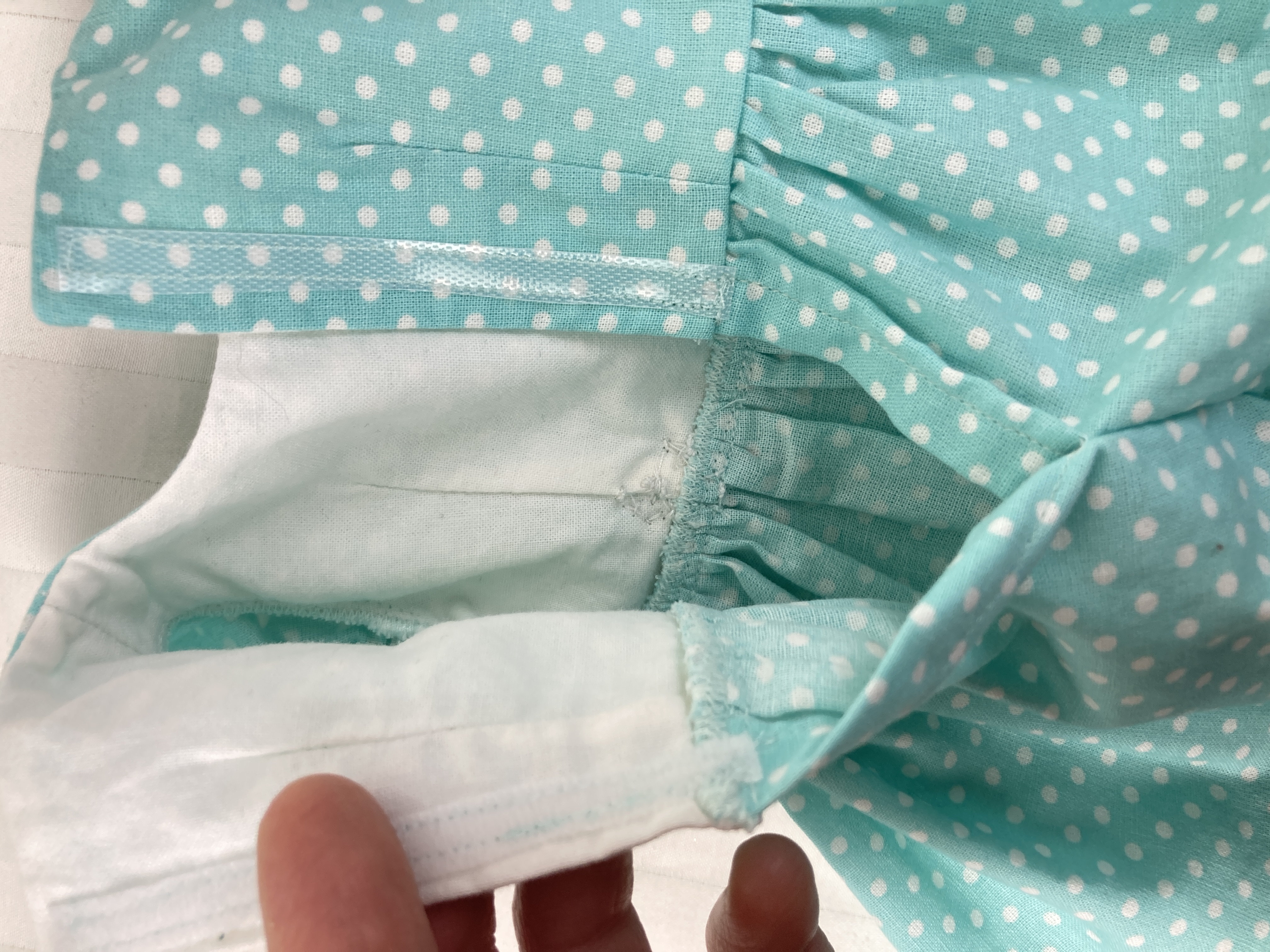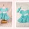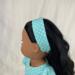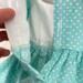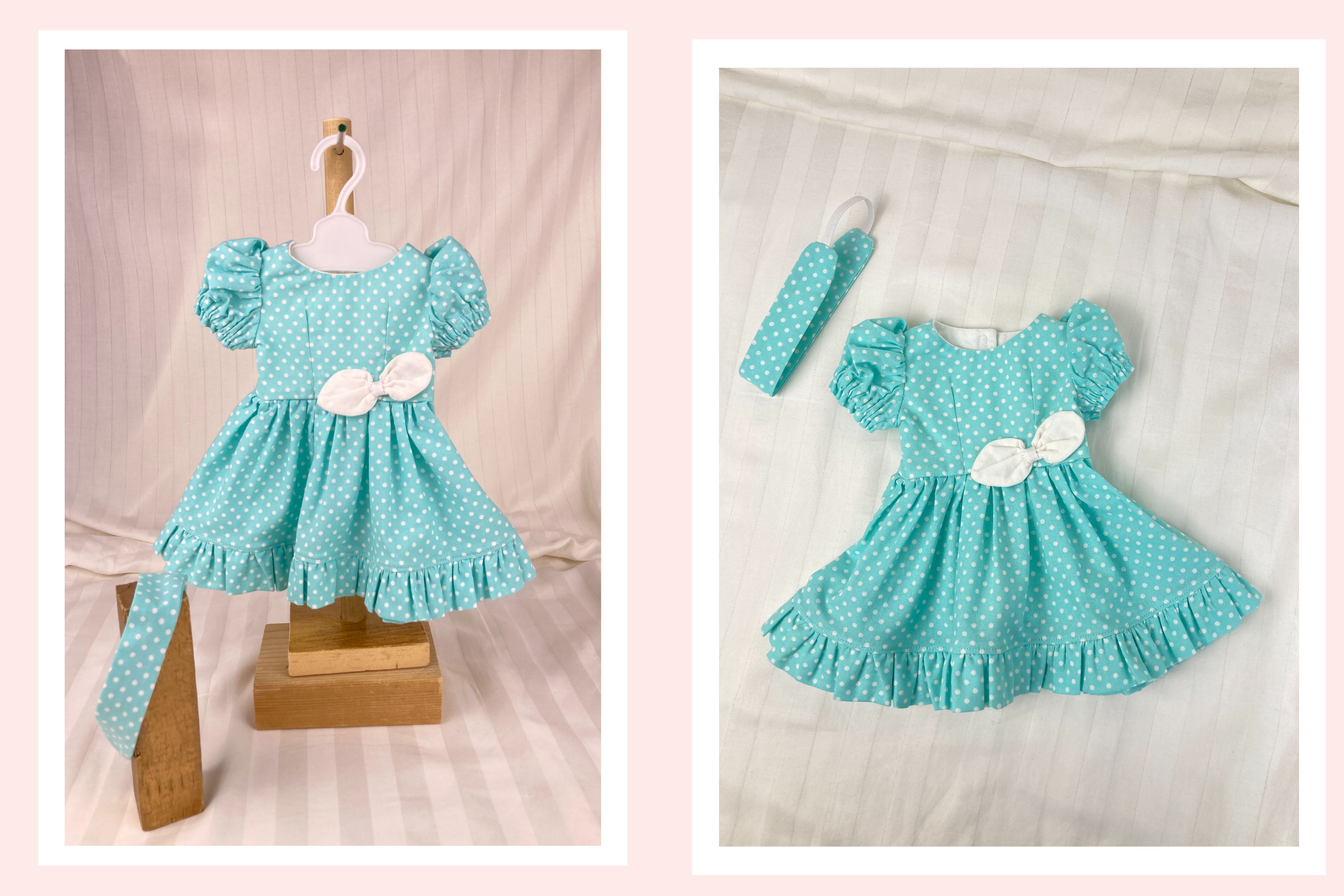 The perfect dress for Easter! Made from a delightful aqua and white small polka dot cotton fabric, this spring/summer dress has a back hook and loop closure. The bodice has darts in the front and back for great fit and shape and the sleeves are a puffed short sleeve (with elastic). The full, gathered skirt ends in a ruffle that falls under the knee. A white bow sits at the left side of the waist adding interest. The matching headband is made from the same fabric as the dress. Bodice is lined.