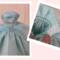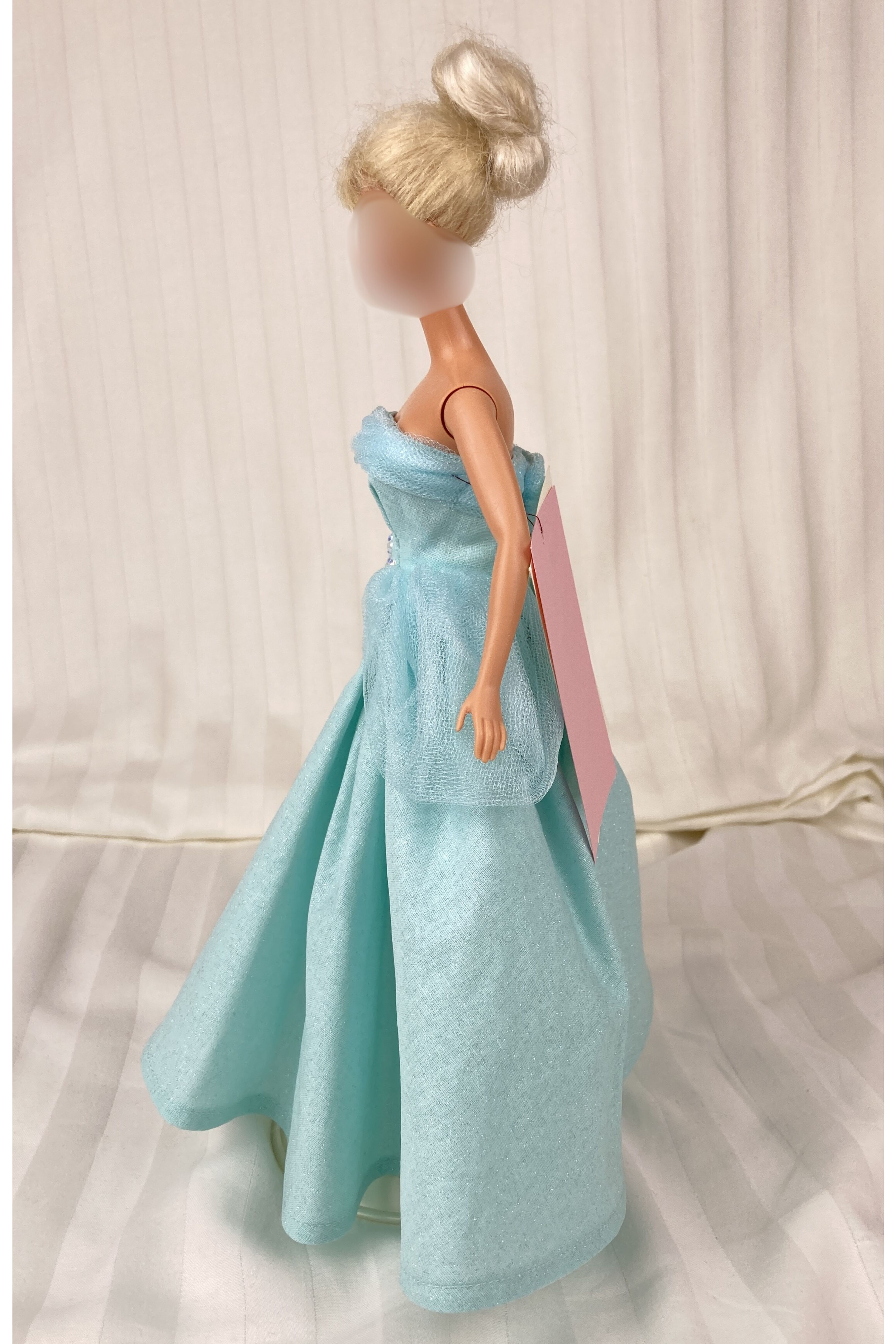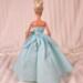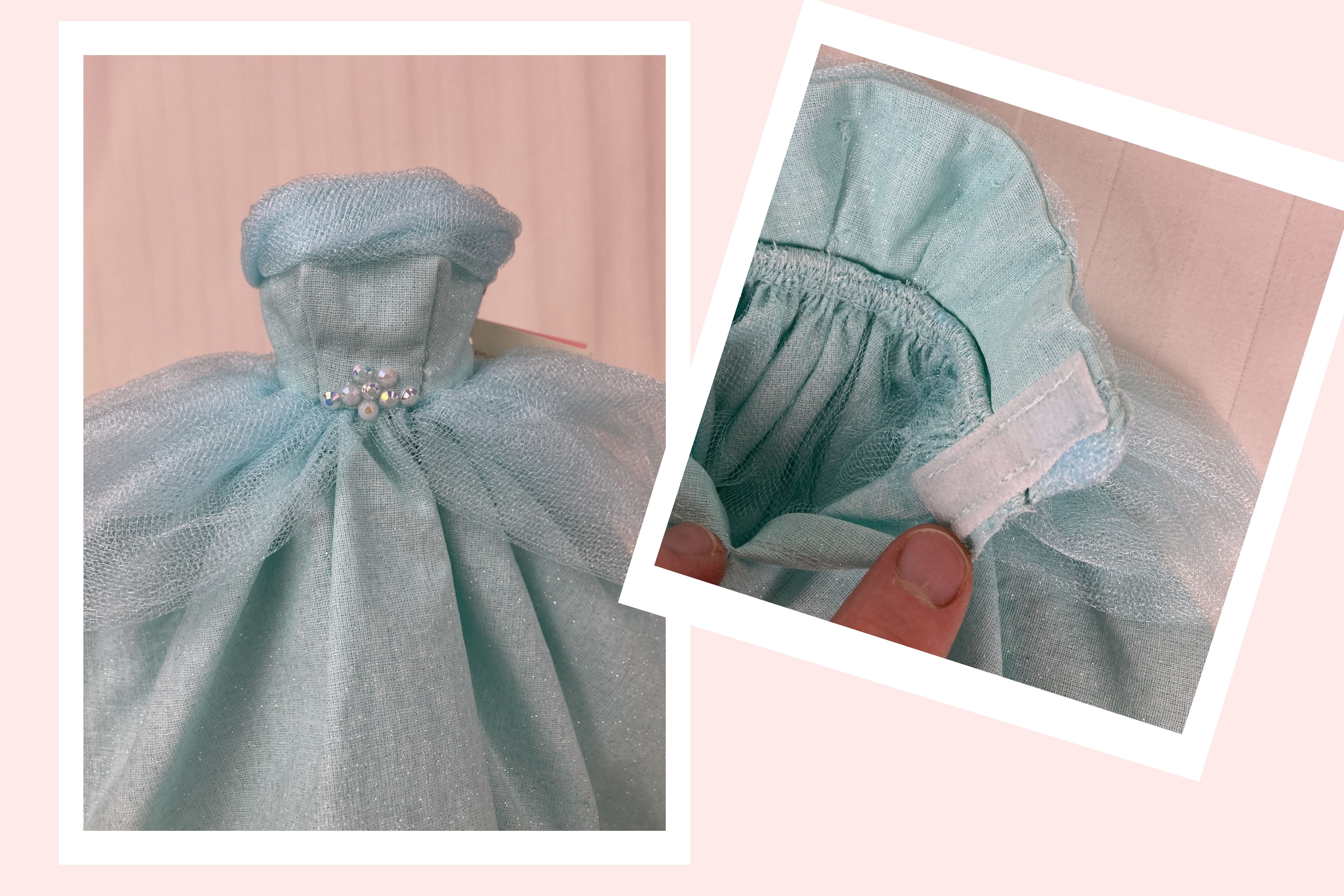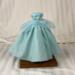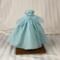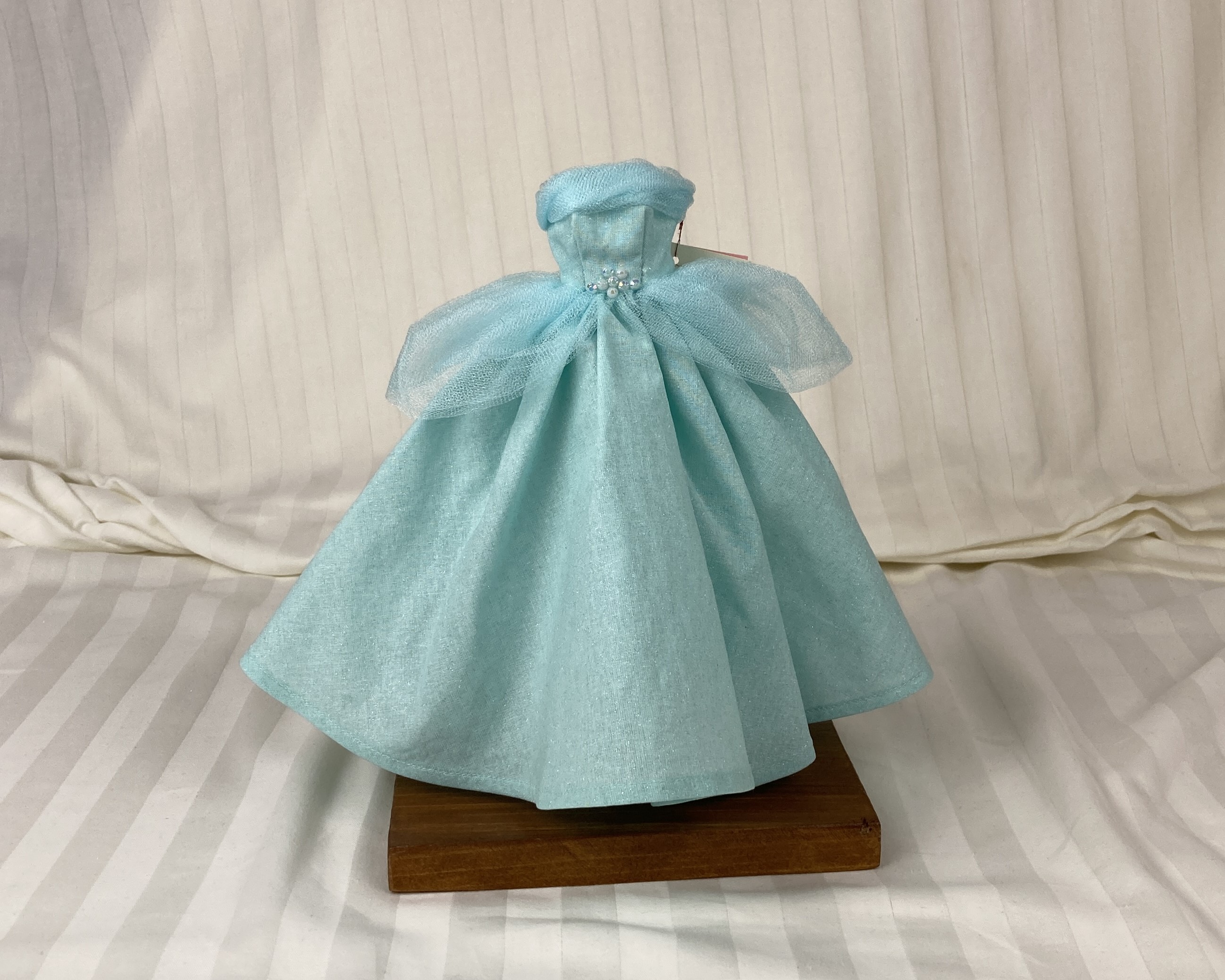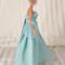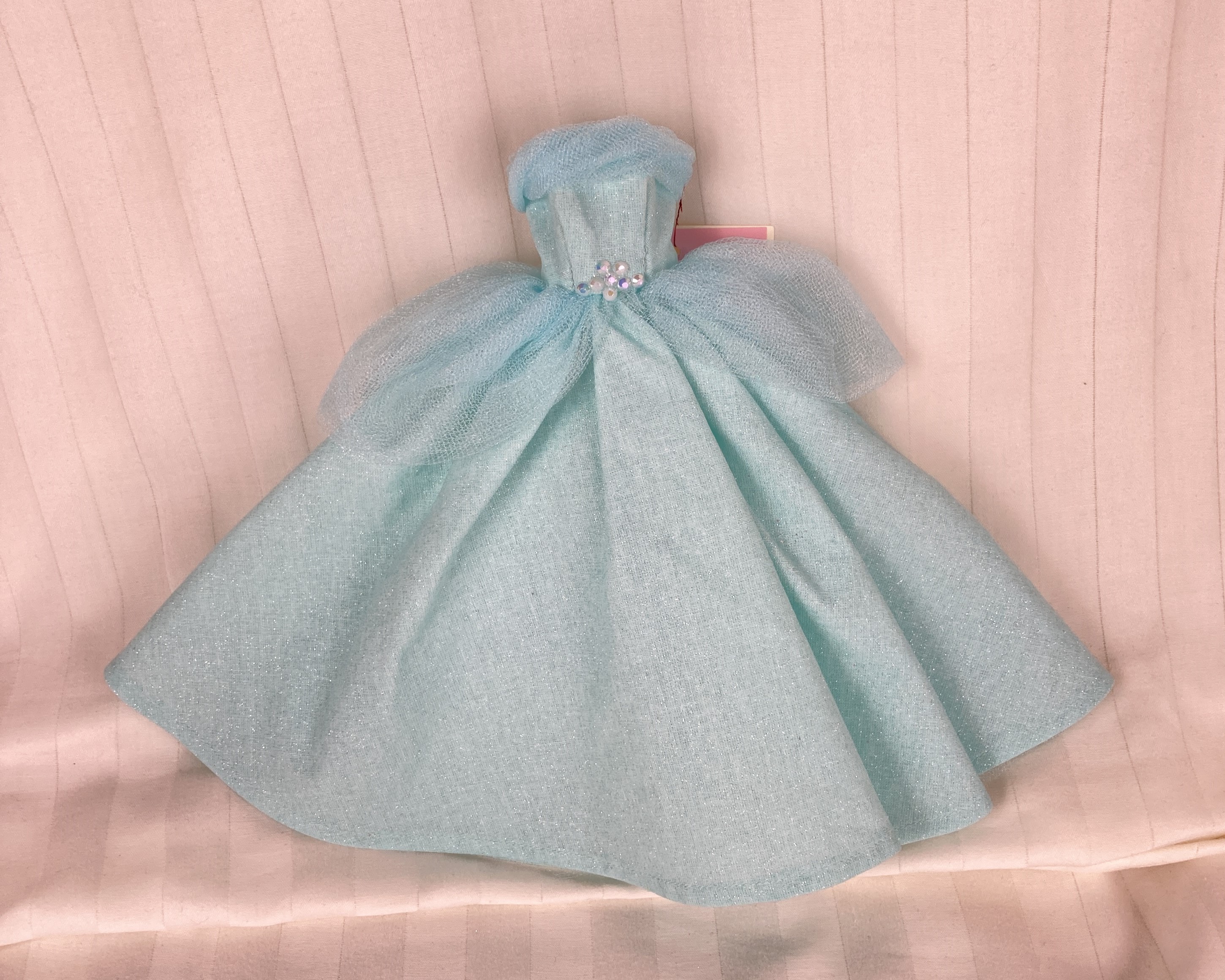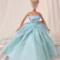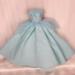 Made from a sparkly, aqua blue, cotton fabric, the strapless bodice features a gently draped and twisted aqua tulle accent along the neckline area. The very full and gathered skirt has two aqua tulle peplums that sit on either side of the waistline. A layer of tulle acts as an underskirt for extra support. To finish the fairytale look eight pearlescent gemstones form a flower design at the waist on the bodice. The dress closure is hook and loop.