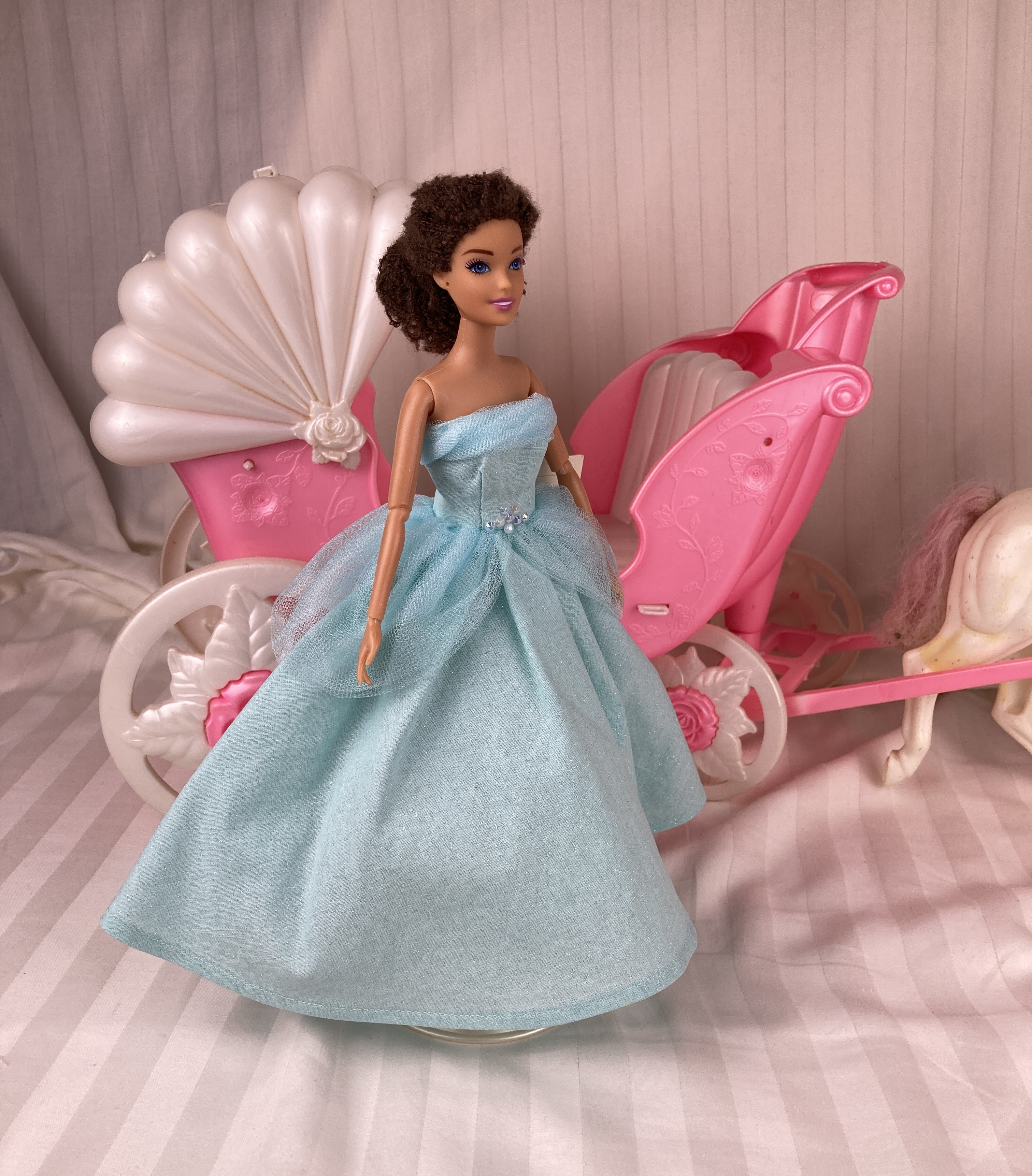 This dress fits 11.5" Fashion Dolls/1:6 scale dolls/play scale dolls (fits best on a doll that is either articulated or can raise its arms to the sides and ones with standard or narrow hips; some dresses may fit wider hipped dolls depending on style; please contact if not sure) and are created to hold up to much use. All our doll dresses are made, not only with style and beauty in mind, but durability as well. The bodices are lined, and all seams are finished with multiple zig-zag stitching.